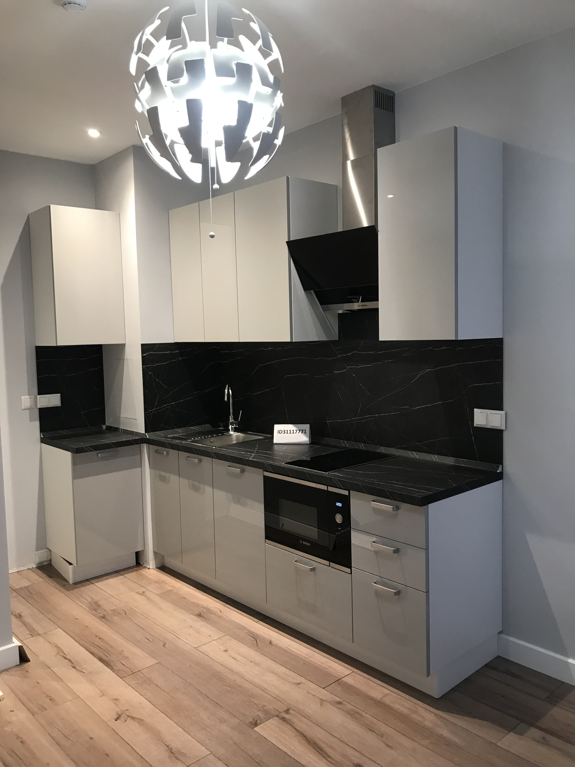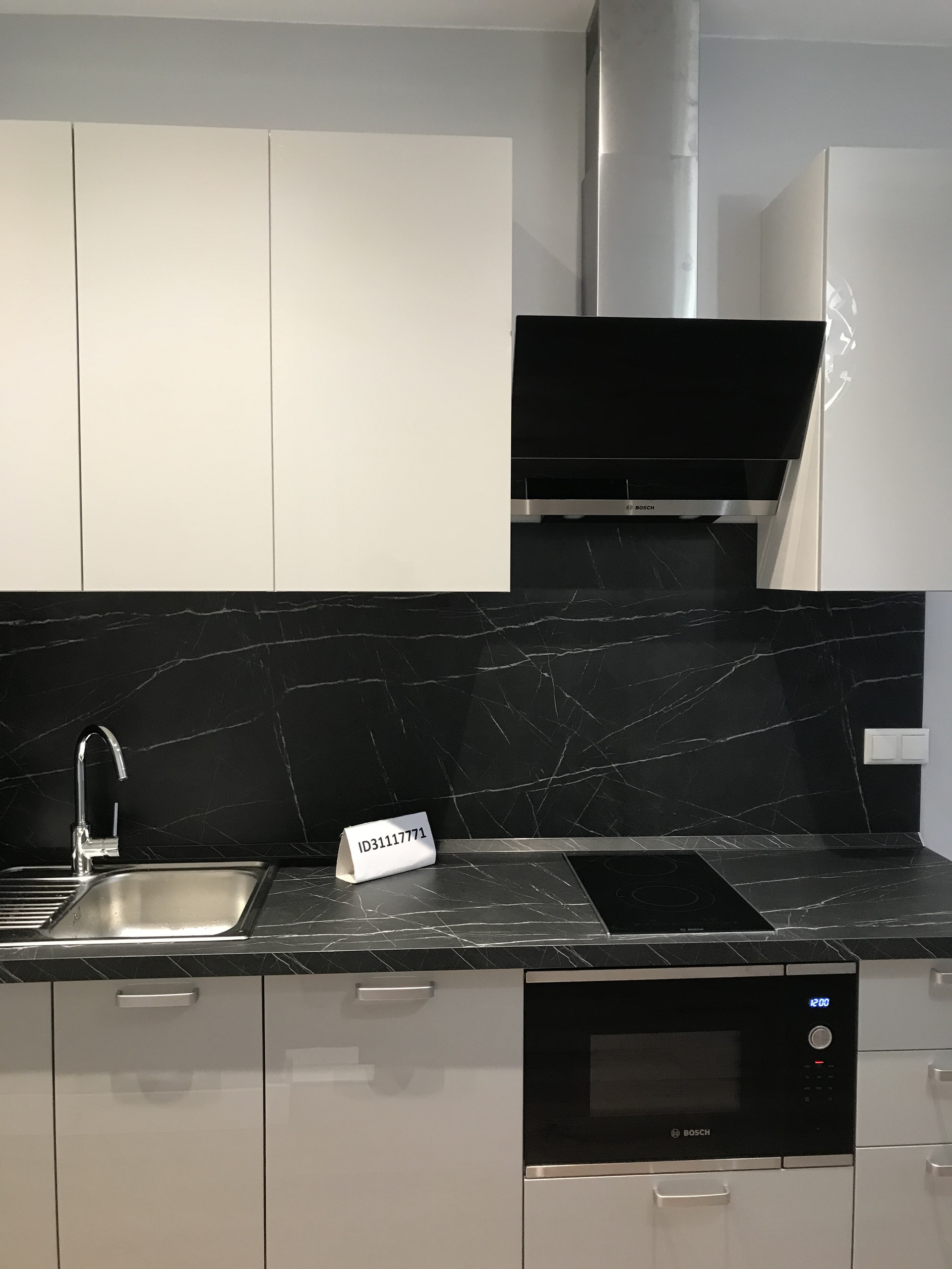 Стильная современная кухня оборудована всей необходимой встроенной техникой, включая посудомоечную машину, варочную панель, микроволновку и вытяжку. Так же имеется большой холодильник.