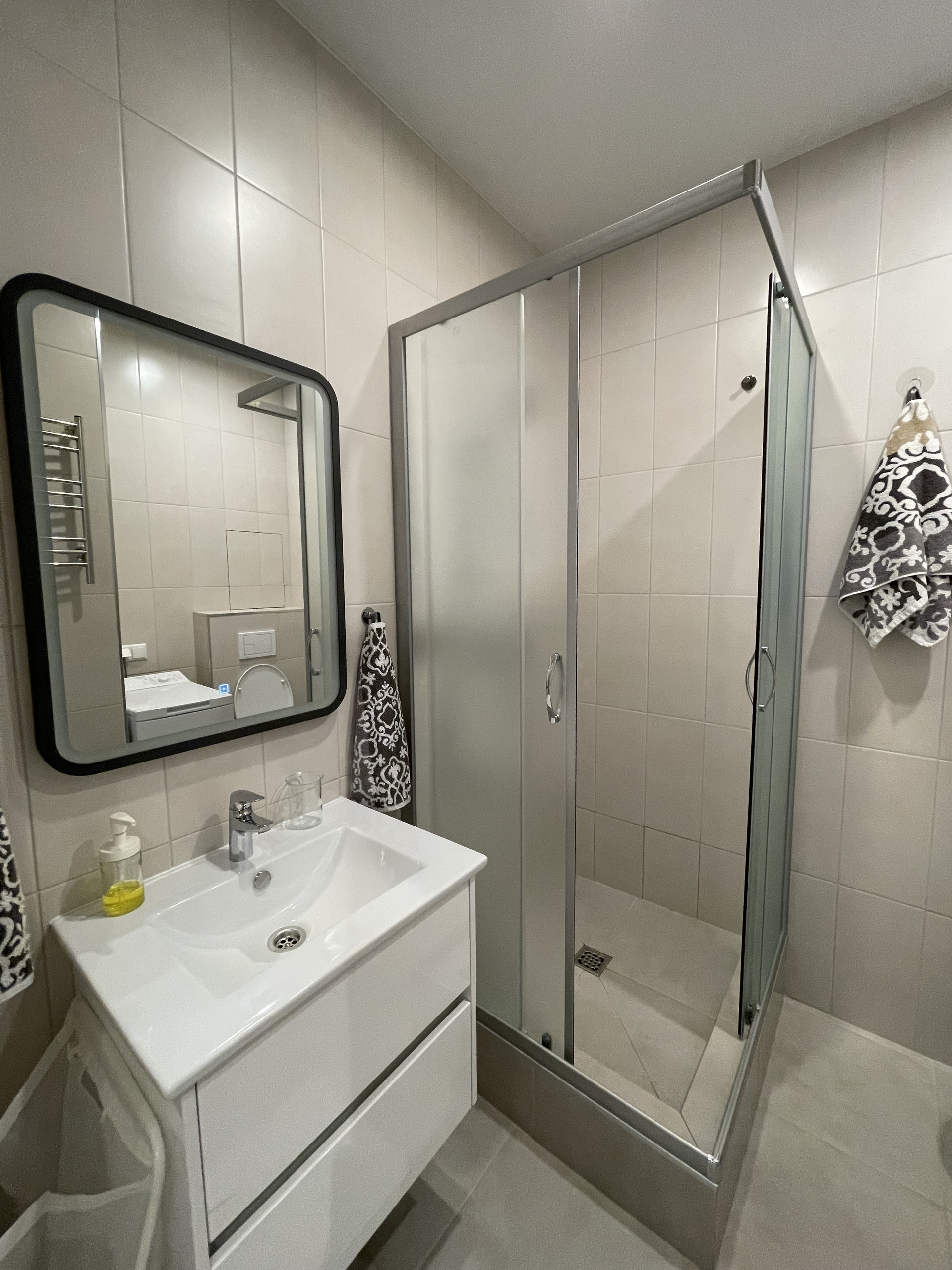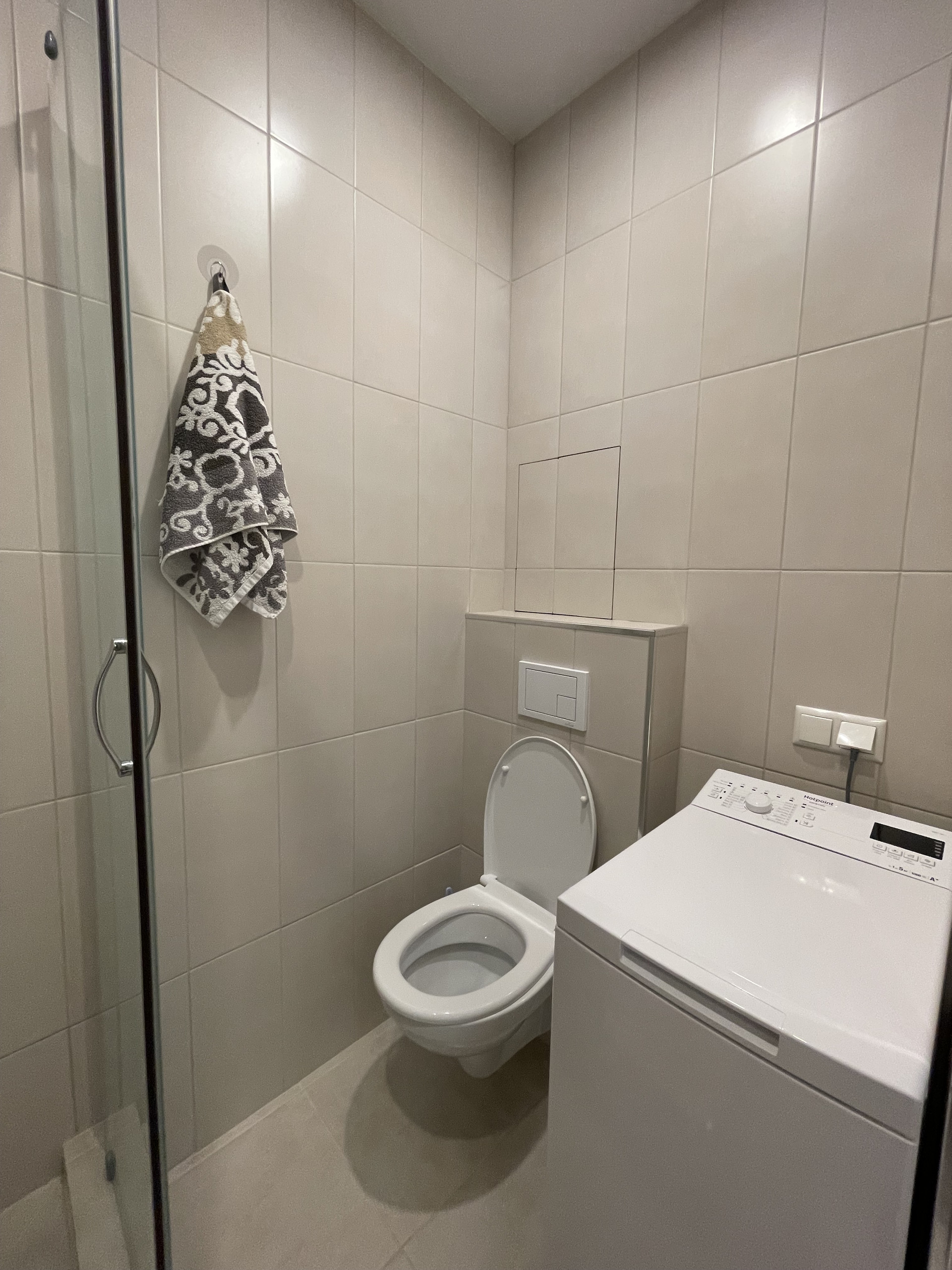 Санузел оборудован душевой кабиной , стиральной машиной и электрополотенцесушителем.