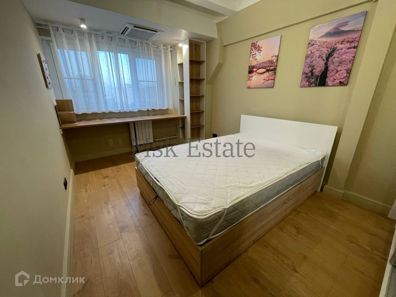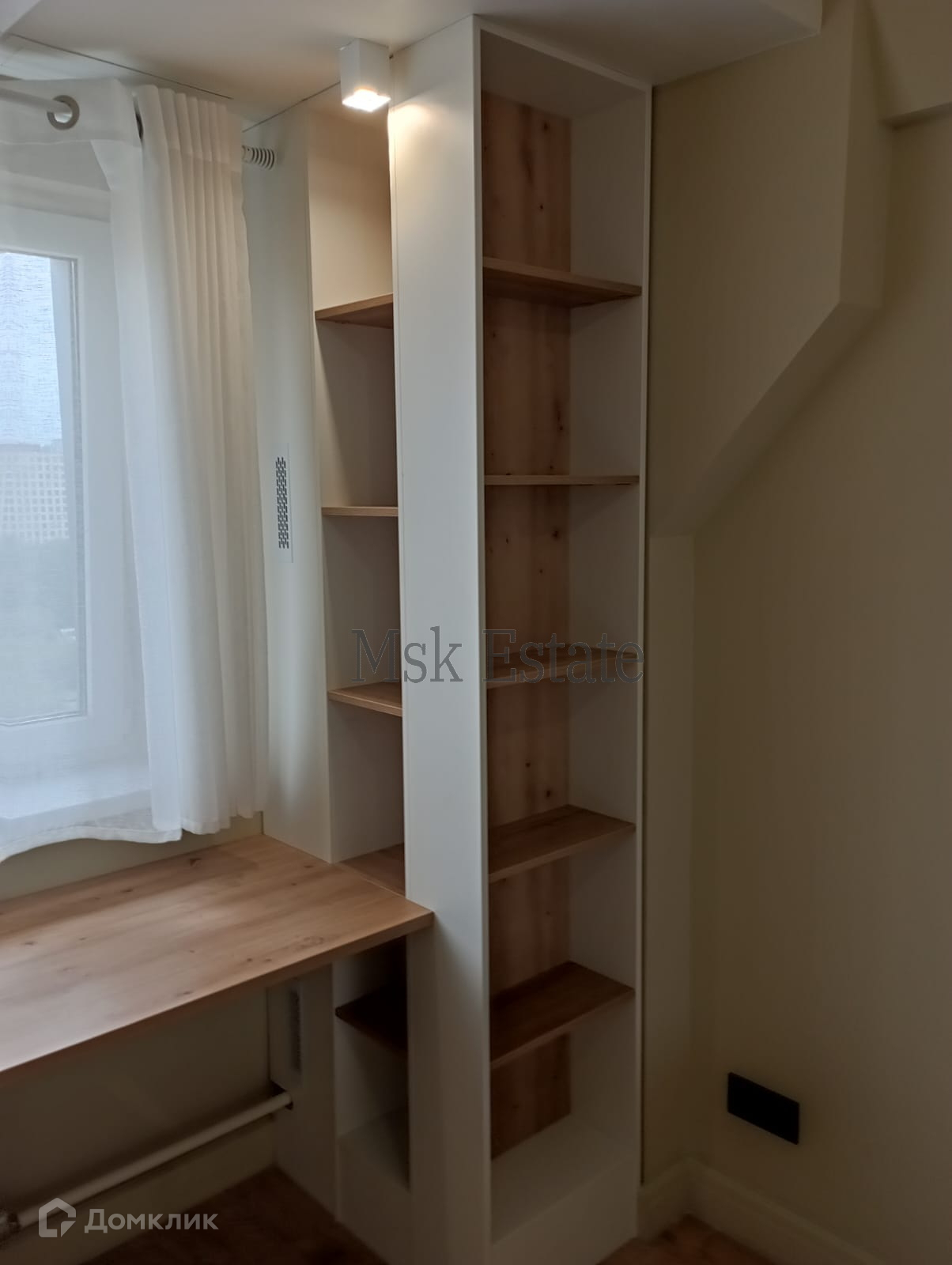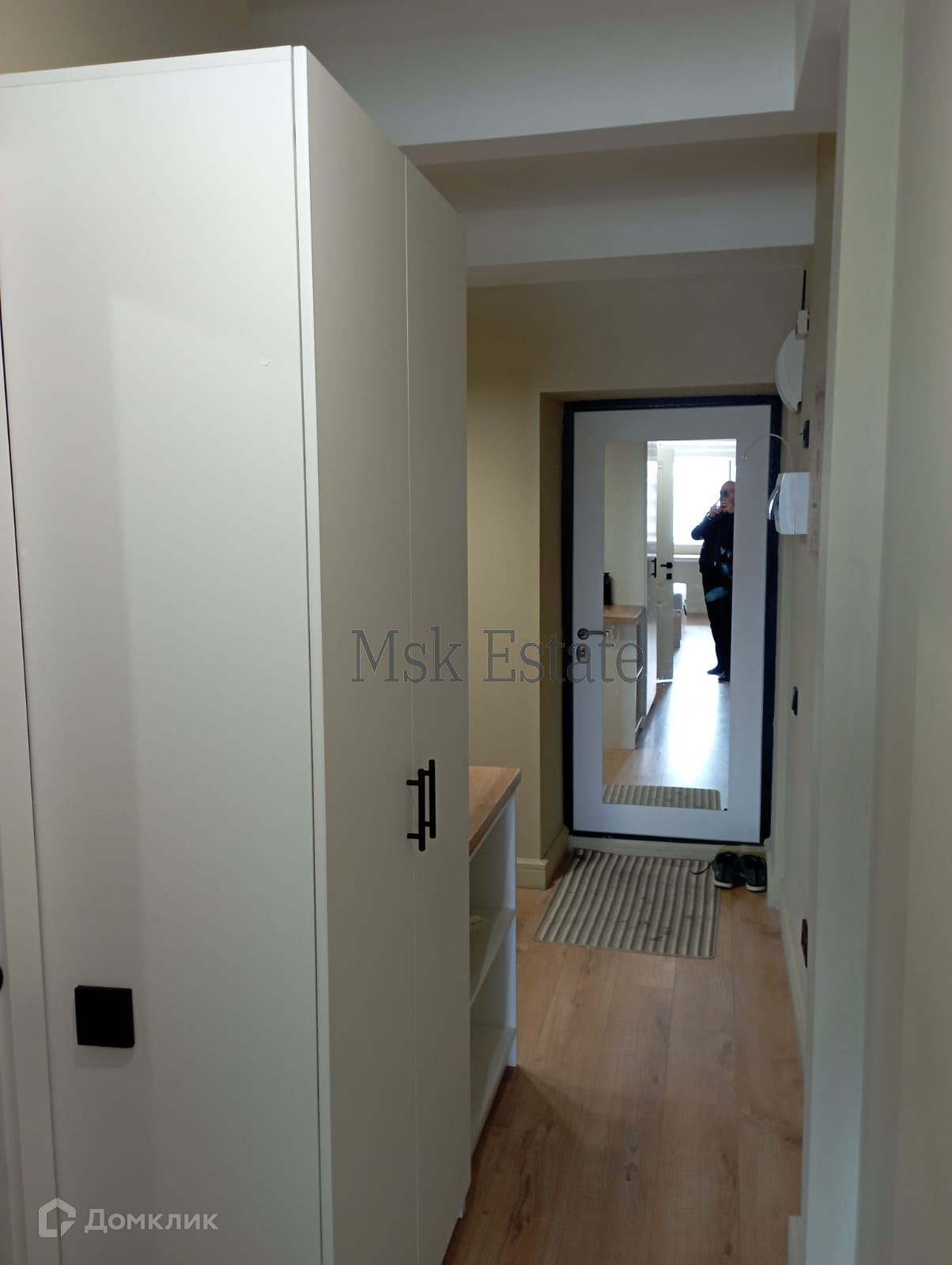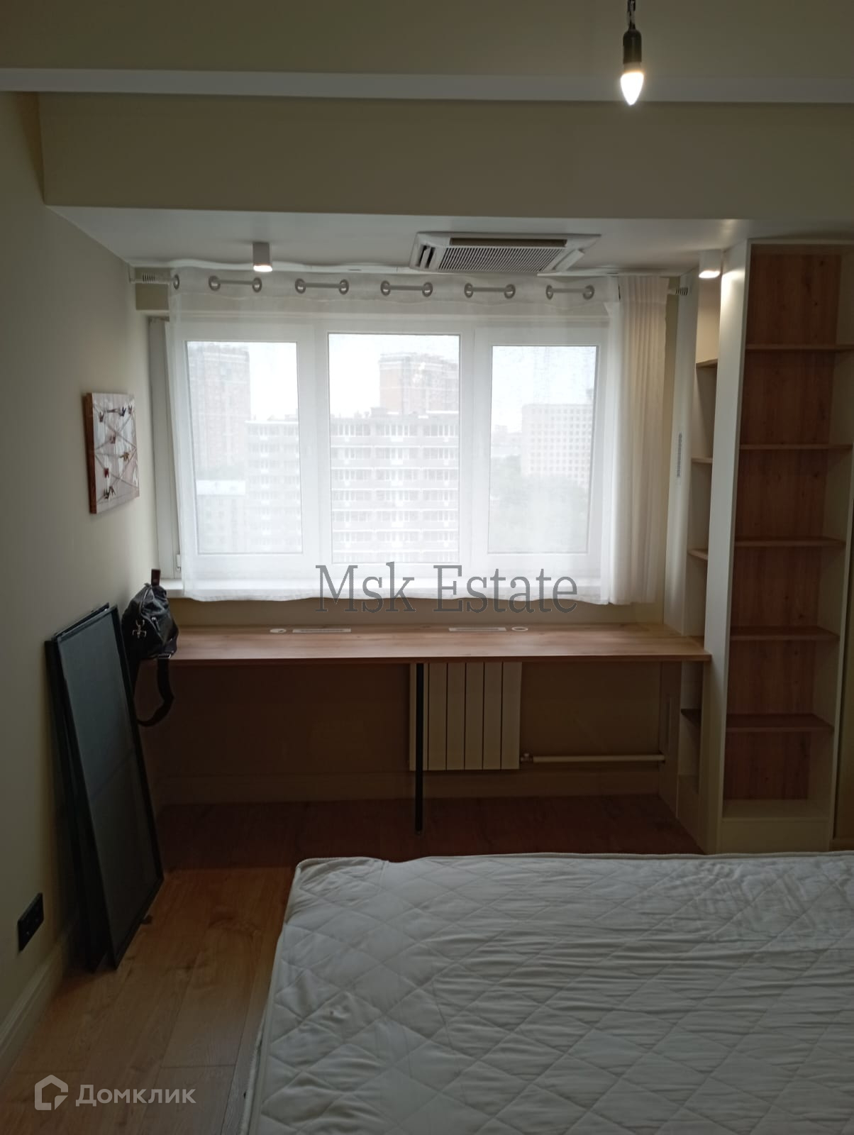 Обустроена зона гардероба при входе и в спальной зоне, также есть функциональная рабочая зона под окном со светильниками.