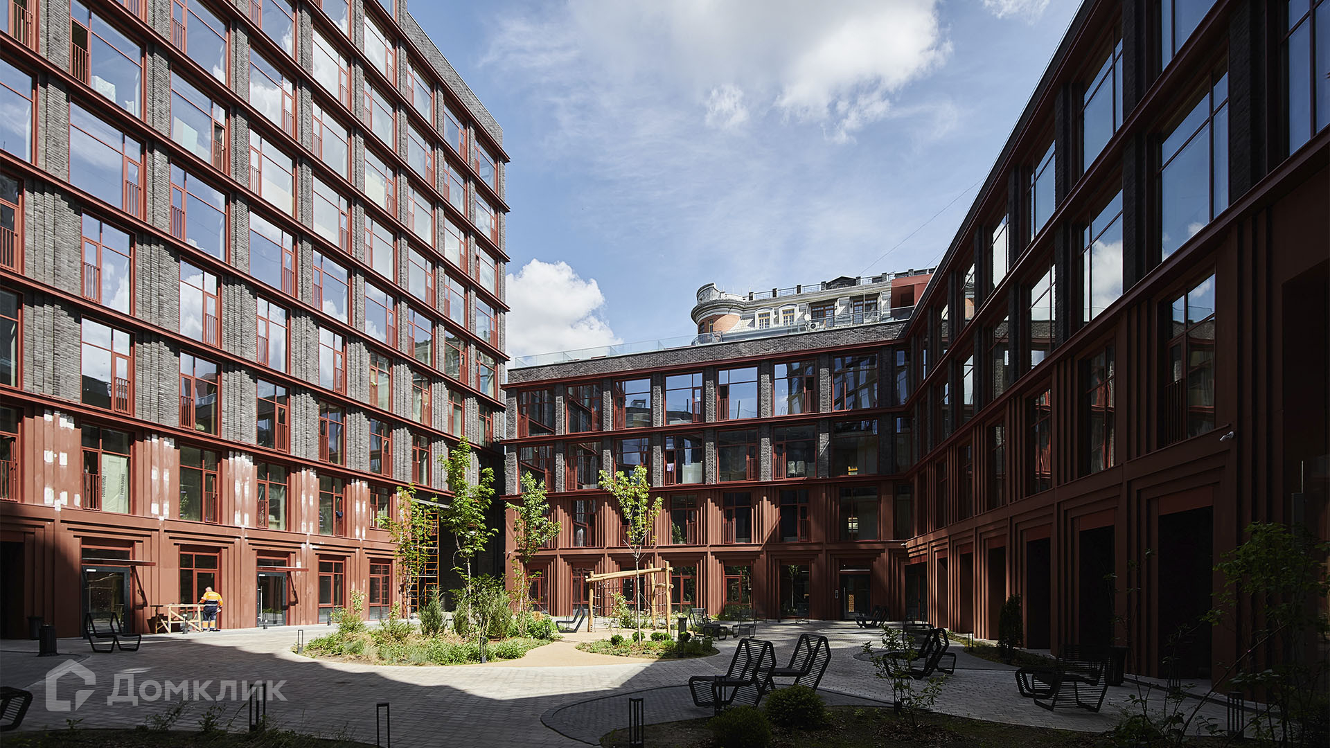 В приватном внутреннем дворе круглые островки газонов обрамлены дорожками из гранитной плитки. Деревья и кустарники образуют живую изгородь. Оборудована детская площадка с деревянными конструкциями и упругим покрытием. Зона ритейла включает супермаркет, кафе, ресторан и отделение банка. На подземном уровне паркинг на 129 автомобилей.