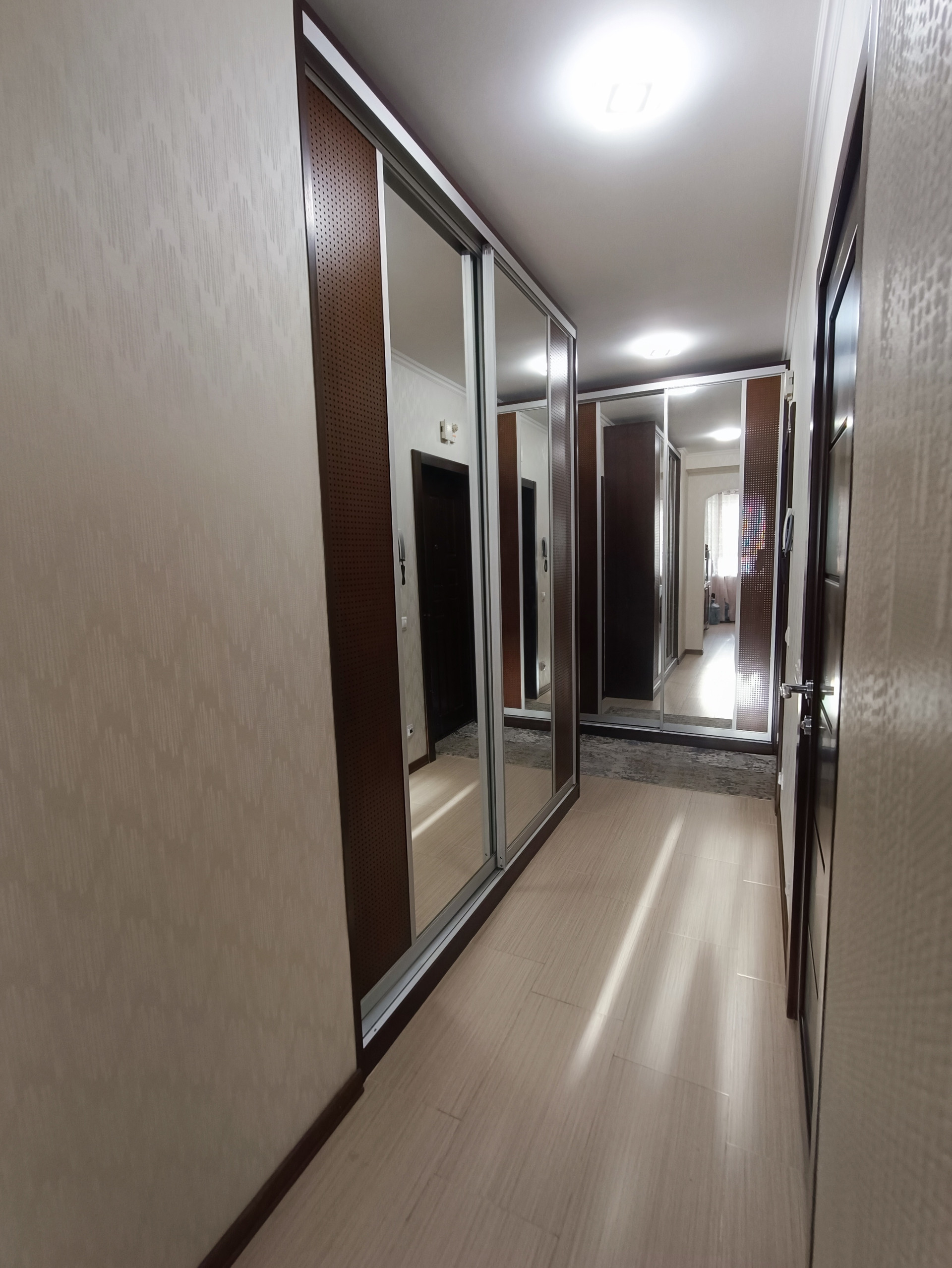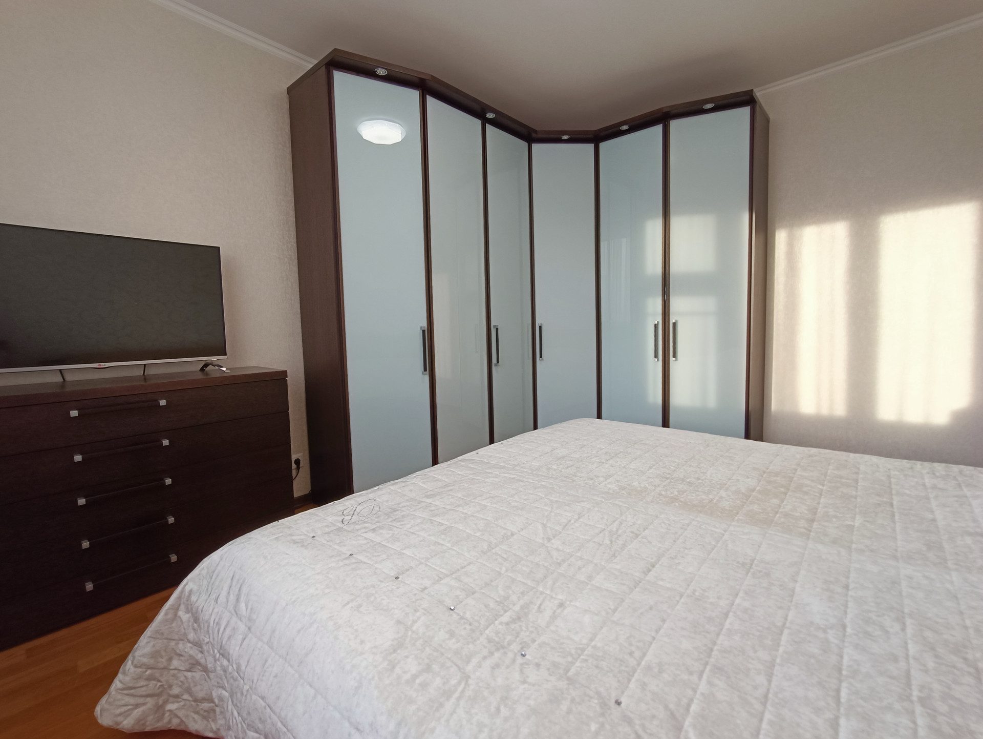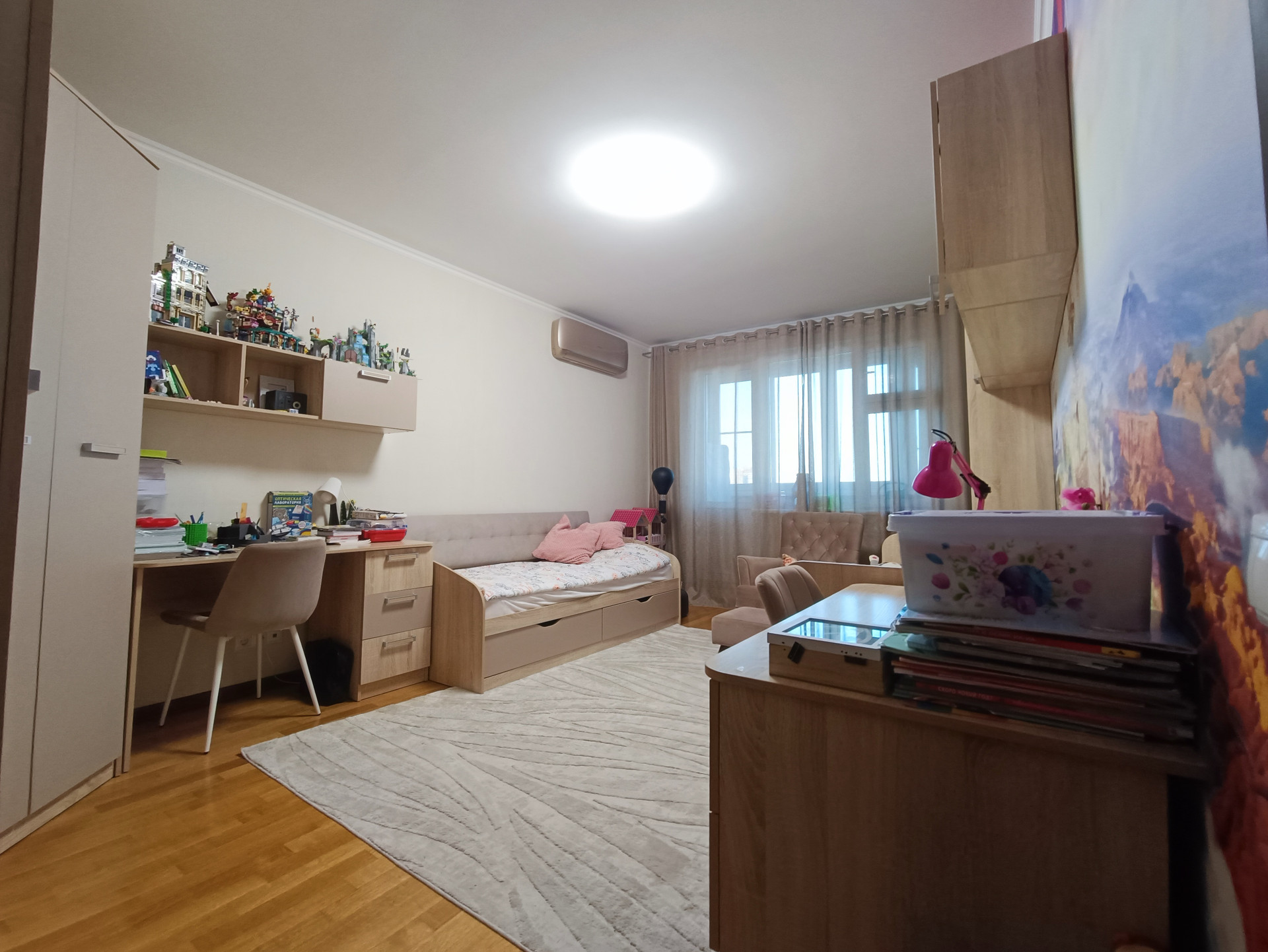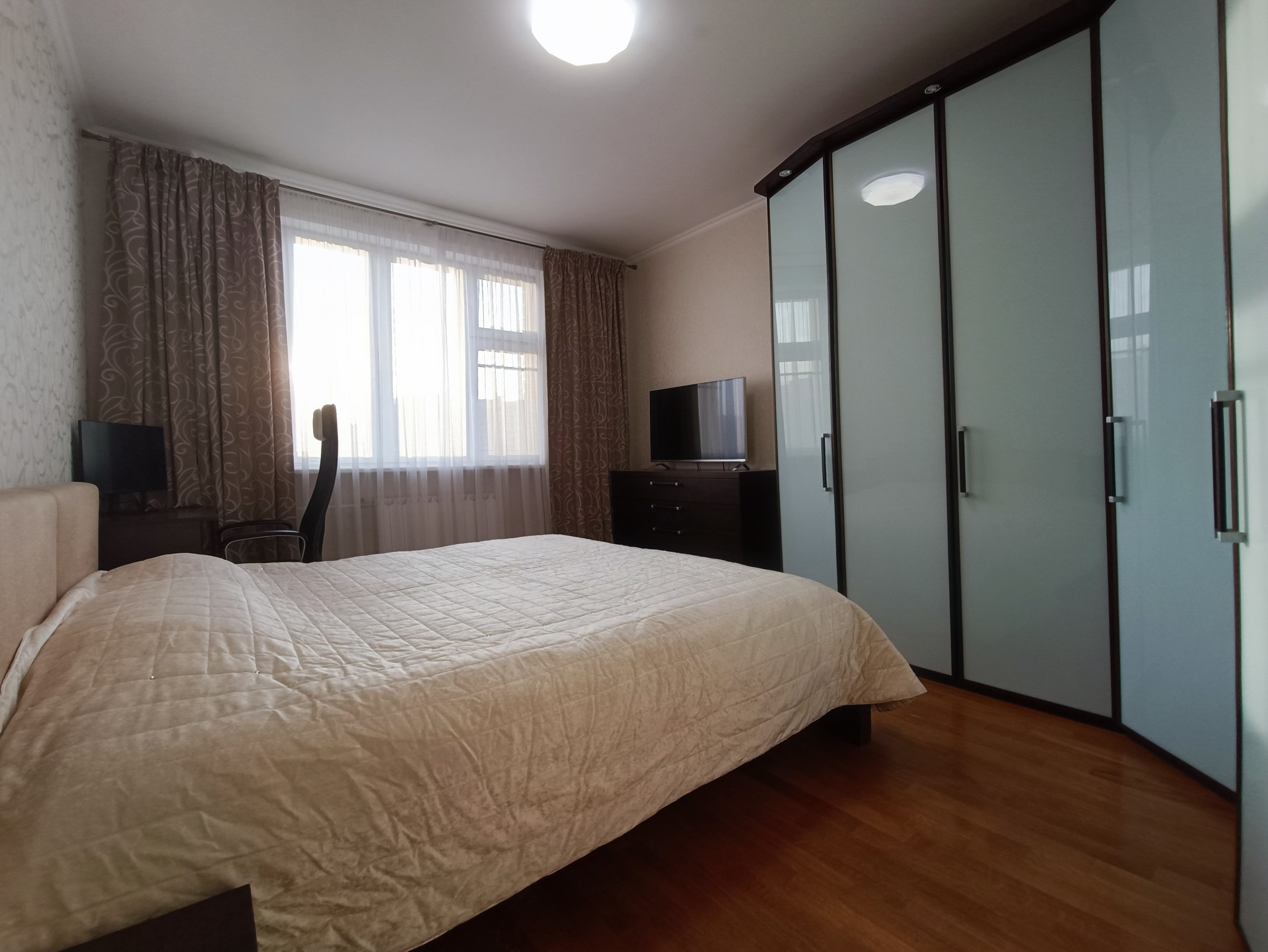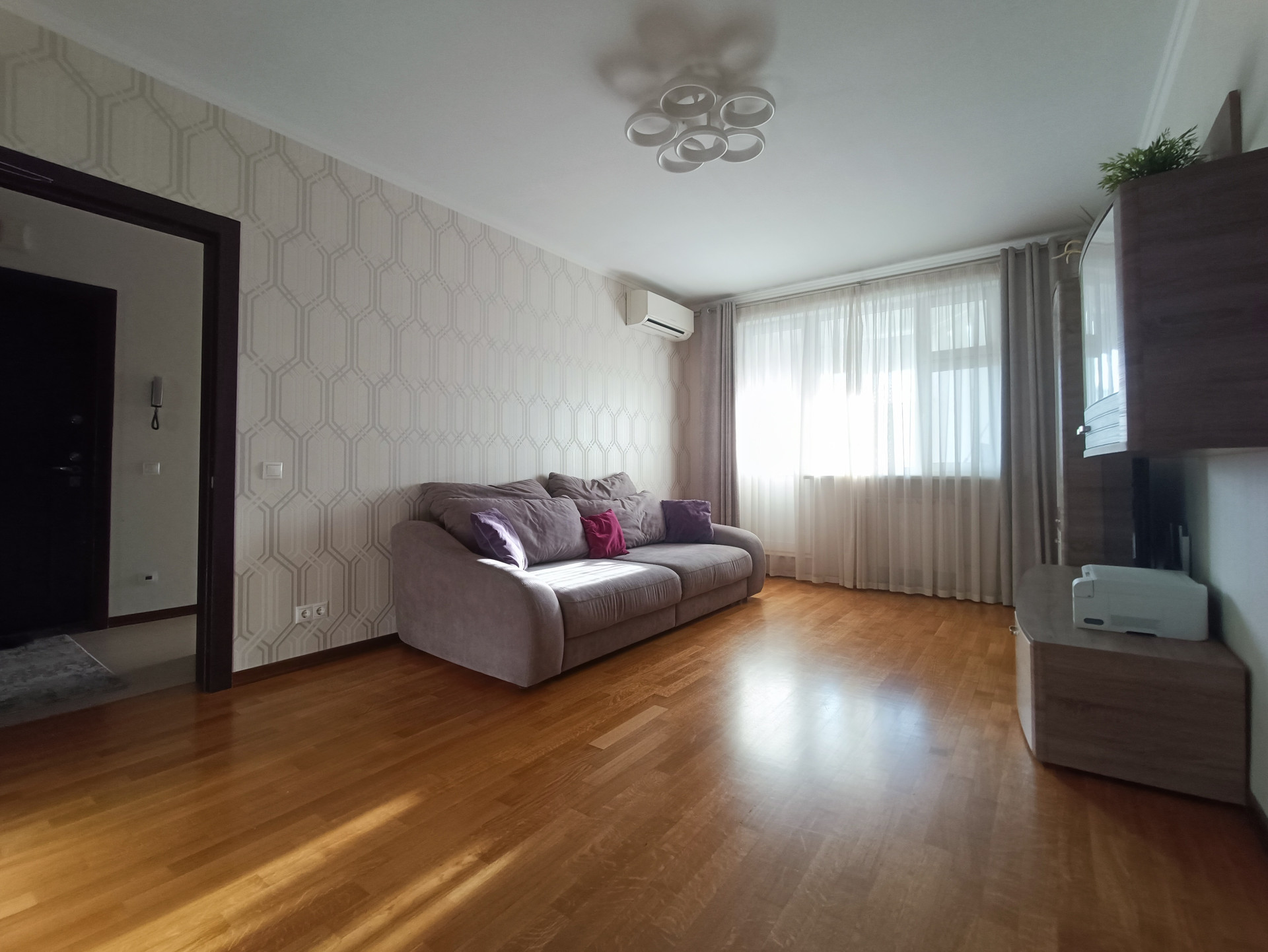 Ремонт выполнен в светлых тонах, стены ровные, швы все заделаны, полы - дубовый паркет, потолки - белая краска, проводка менялась в 2017 году. Окна пластиковые, выходят во двор и на улицу. Балкон и лоджия застеклены. Кондиционеры в комнатах и на кухне.