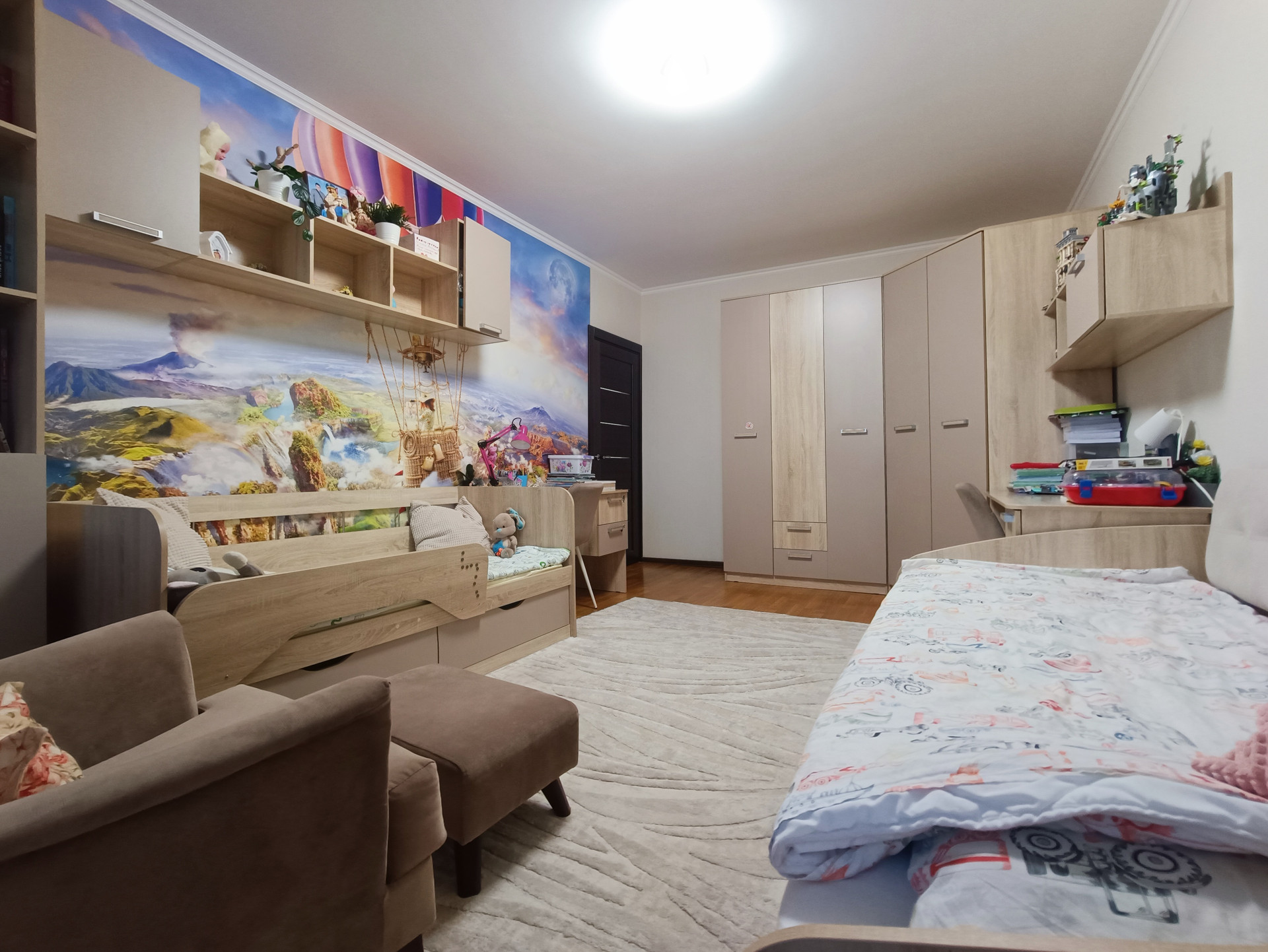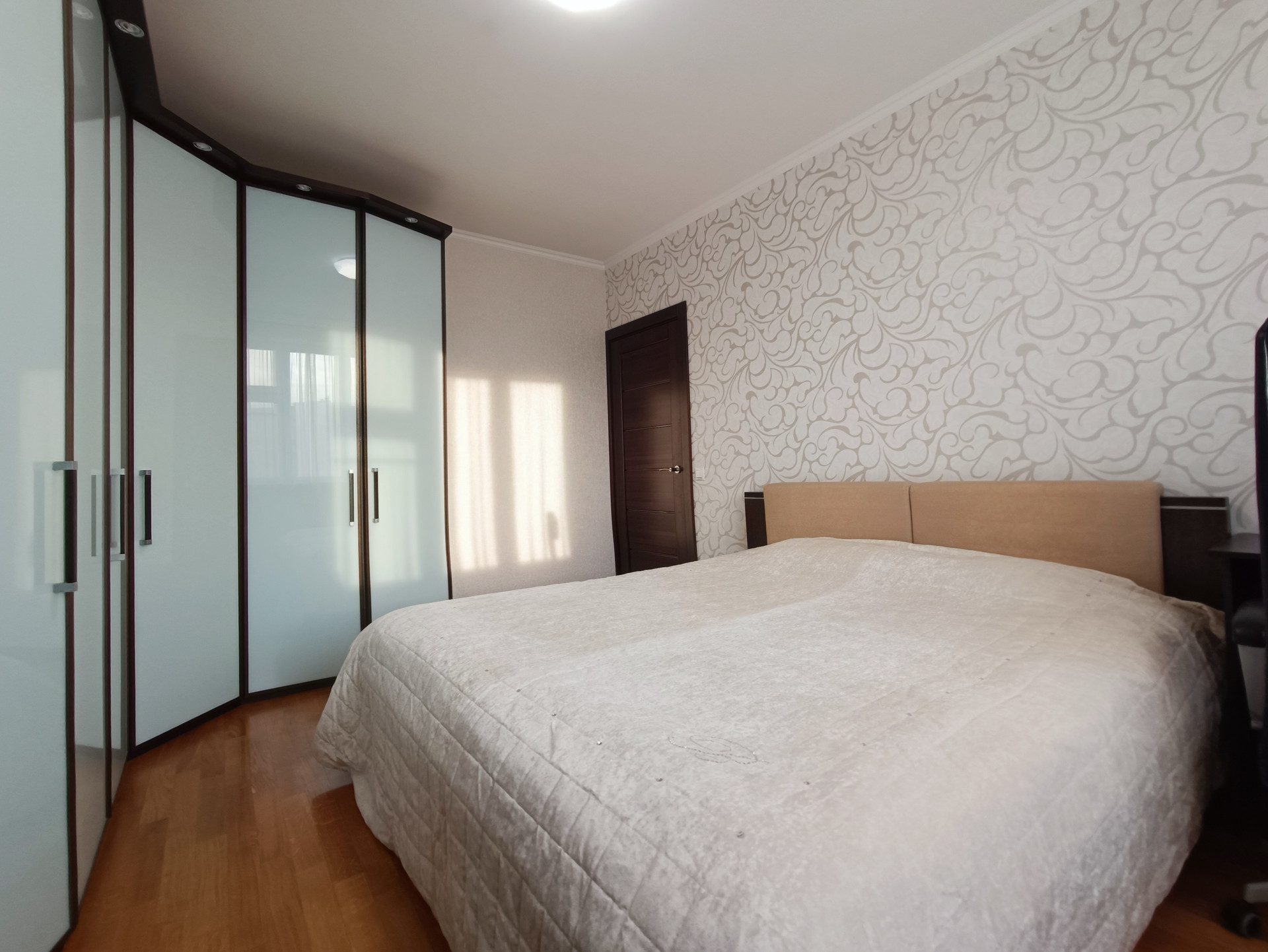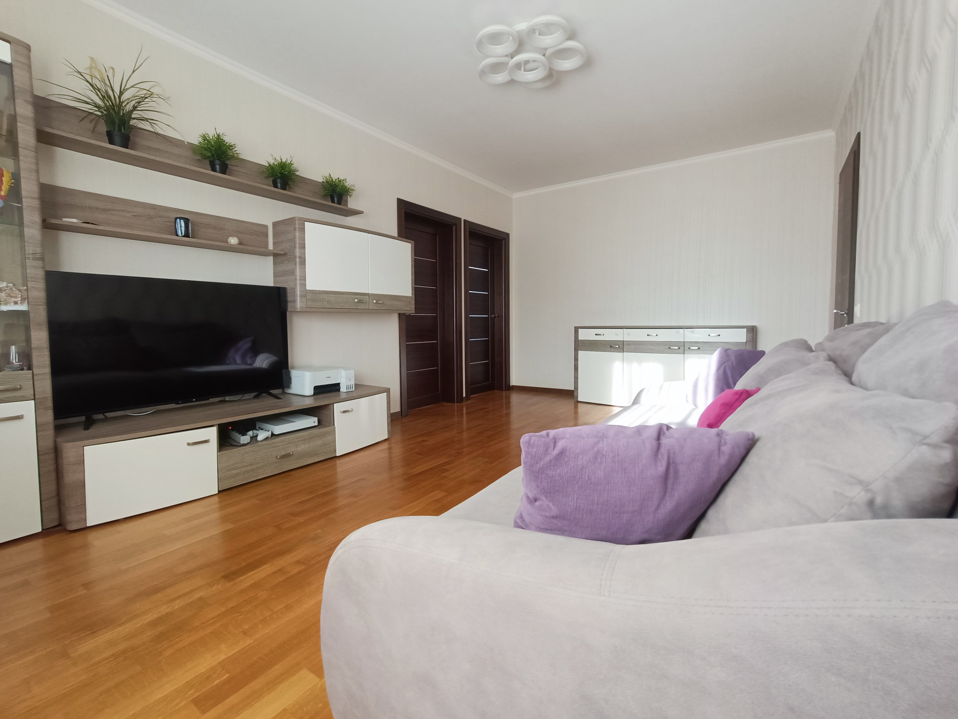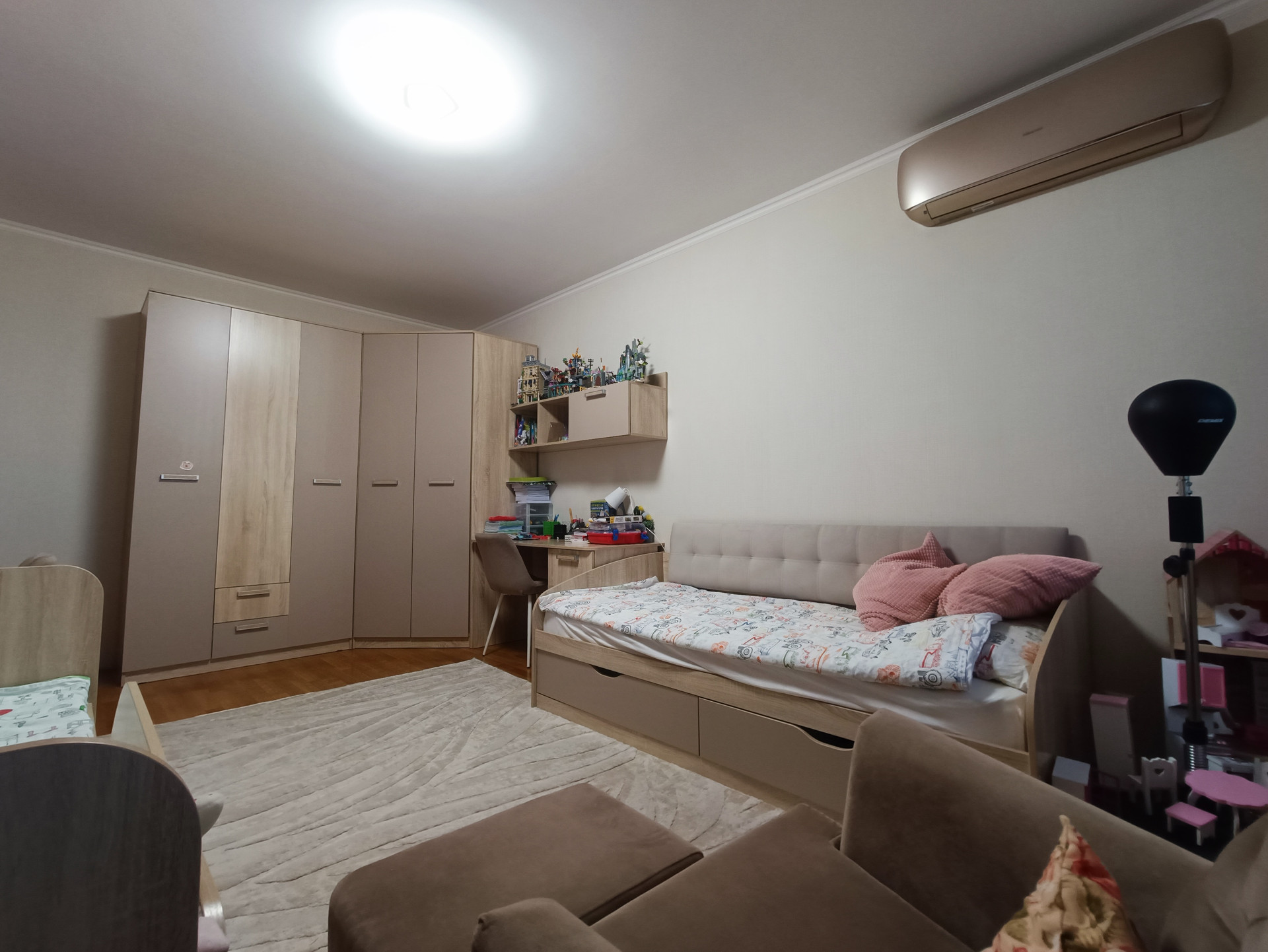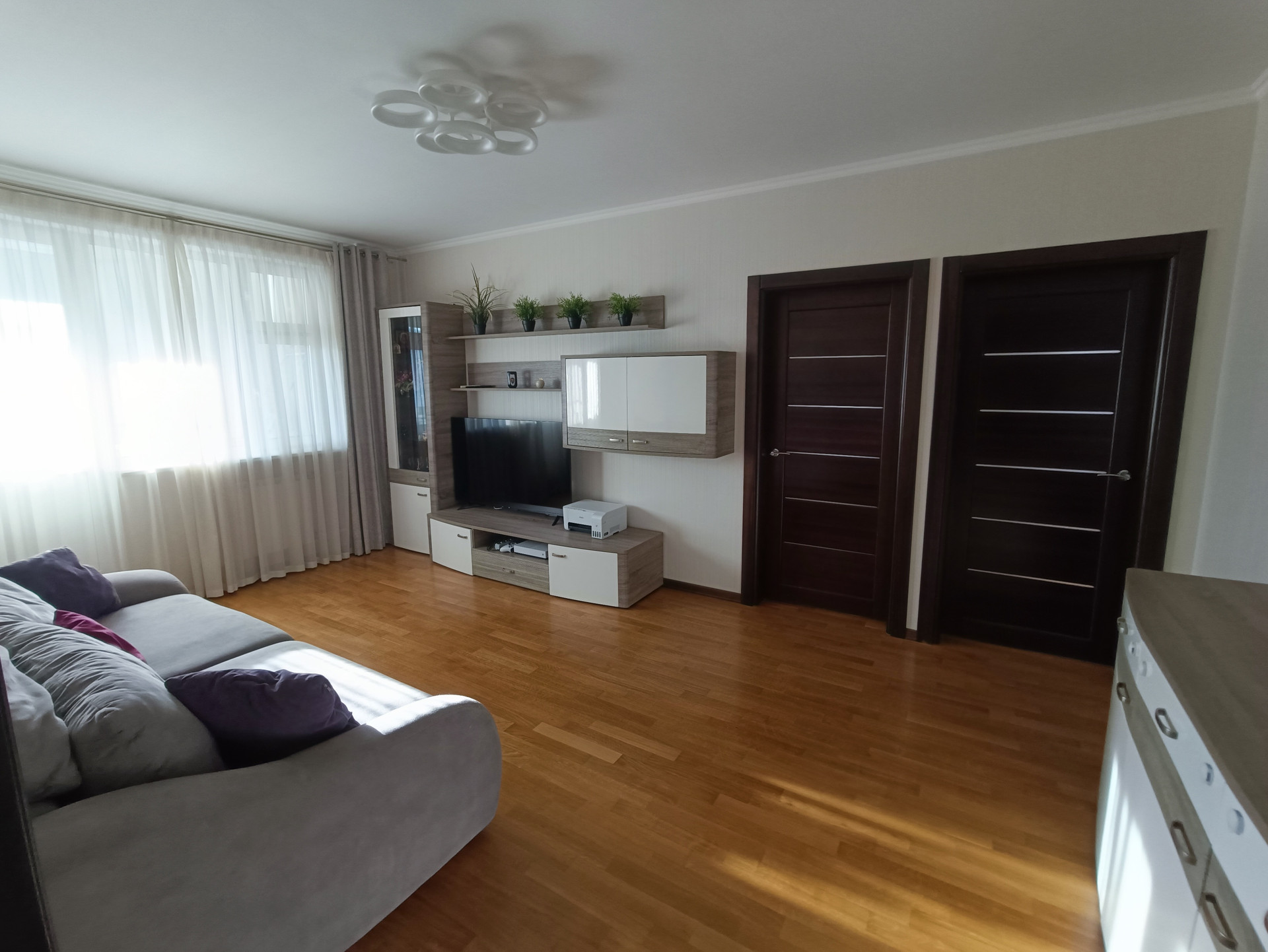 Ремонт выполнен в светлых тонах, стены ровные, швы все заделаны, полы - дубовый паркет, потолки - белая краска, проводка менялась в 2017 году. Окна пластиковые, выходят во двор и на улицу. Балкон и лоджия застеклены. Кондиционеры в комнатах и на кухне.