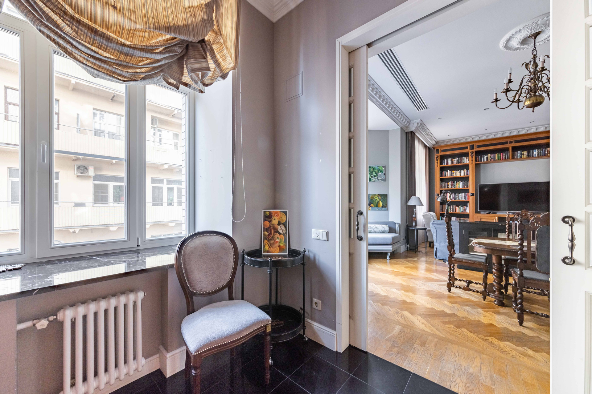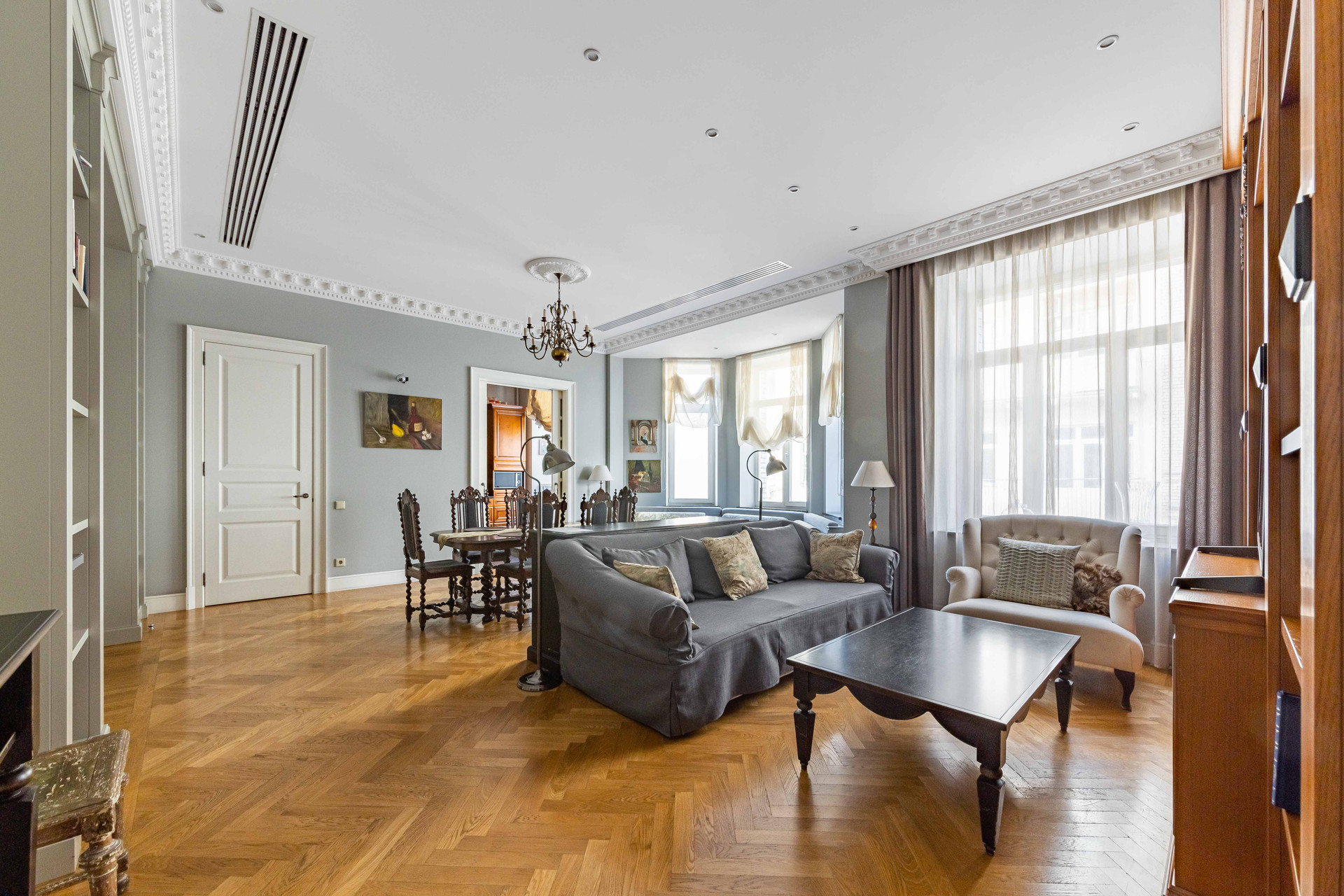 -------Дизайн проект выдержан в современной классике, превалируют пастельные тона очень тёплая уютная атмосфера. Использованы премиальные натуральные материалы. Авторская мебель выполнена на заказ. Комнаты выходят на две стороны дома Малую Бронную и тихий внутренний двор. Дом имеет собственную придомовую закрытую территорию с паркингом, видео наблюдением и охраной.