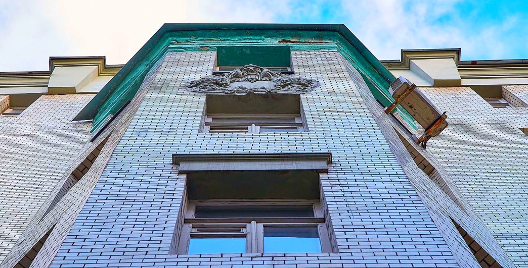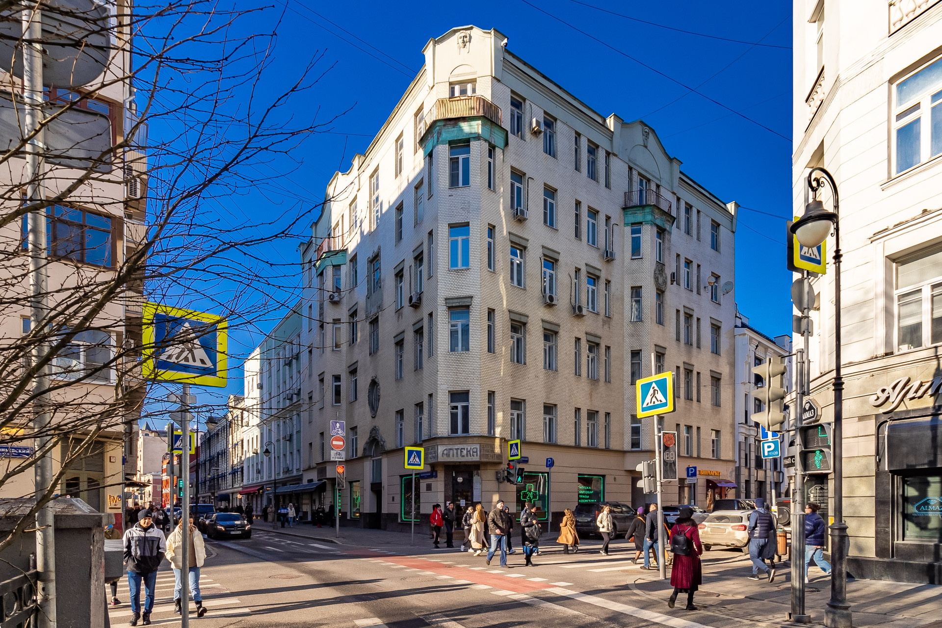 Доходный дом 1913 года построен по проекту архитектора Сигизмунда Карловича Вульфсона, в 1985 году дом был полностью реконструирован установлены железобетонные перекрытия, усилен фасад, заменены все коммуникации. В 2010 году случилось событие, которое сделало здание доминантой Малой Бронной и местом притяжения для туристов. По инициативе жителей дома были отреставрированы исторические вывески 1920-х годов с названиями учреждений, которые здесь работали. Кабинет зубного врача, бюро студенческих кооперативов Централ и аптеки.