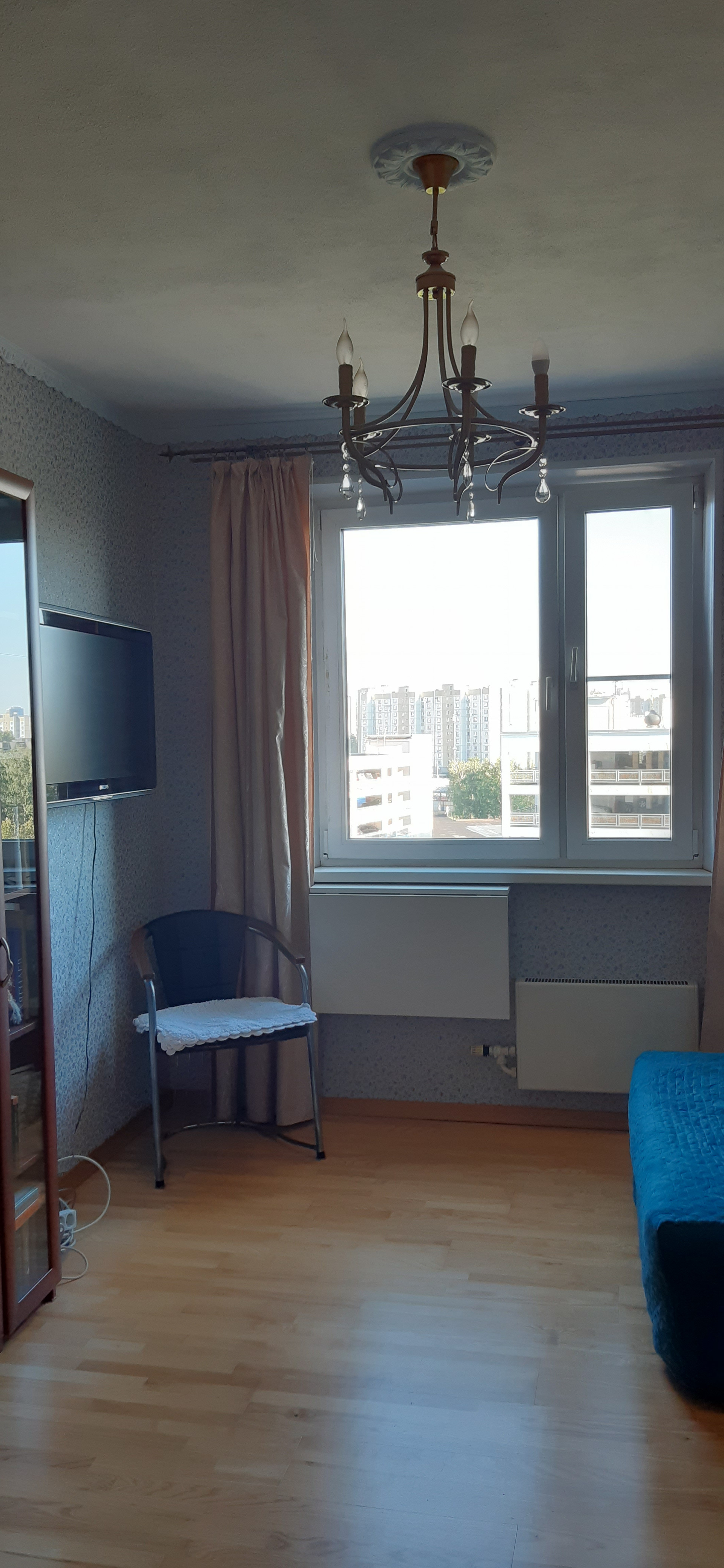 В комнатах на полу паркетная доска, в остальных помещениях, включая балкон, -   керамическая плитка/керамогранит. Большая комната зонирована на две части двумя потолочными светильниками, натяжной потолок (не термоусадочный! Полотно натягивалось вручную).