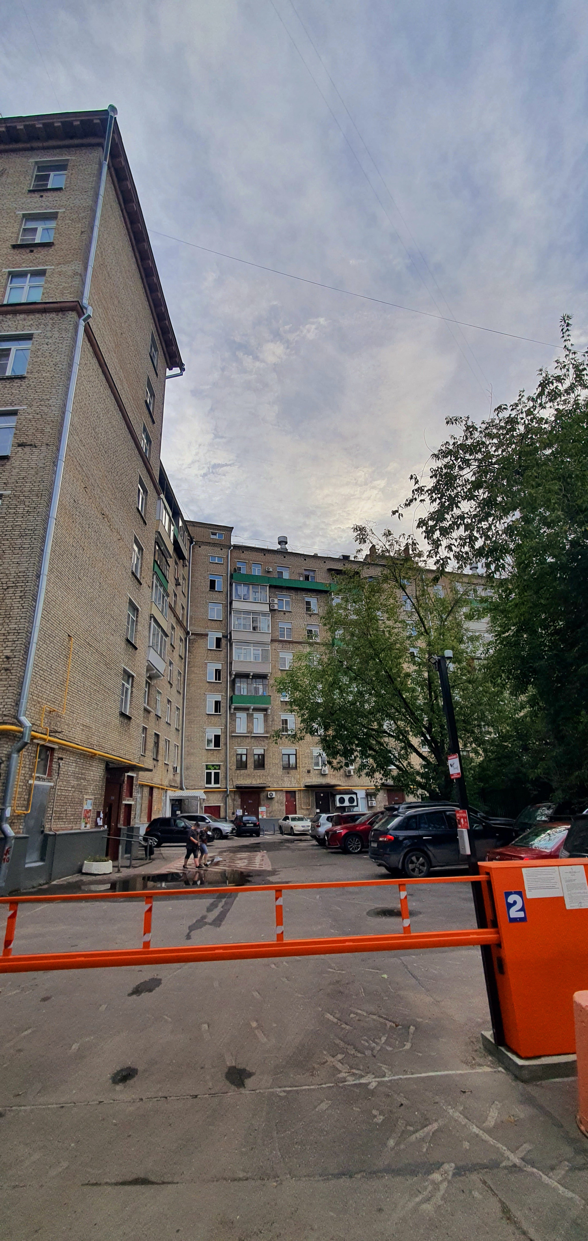 Парковка во дворе дома с большим количеством мест и огорожена шлагбаумами с двух сторон.