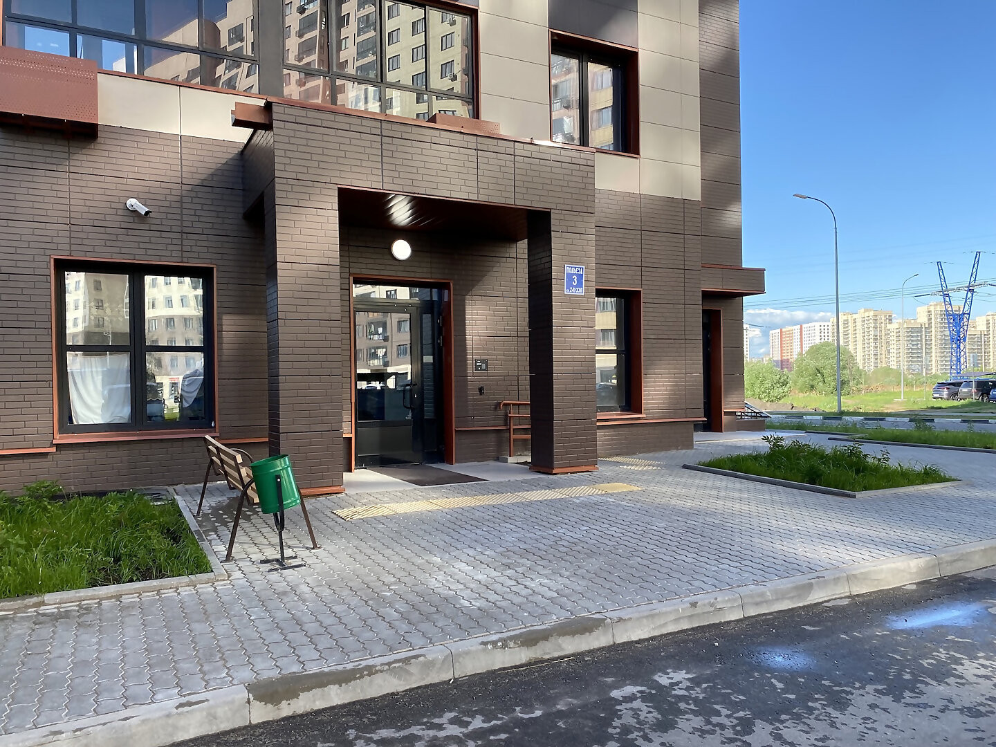 Благоустроенный двор с игровыми площадками на мягком покрытии, прогулочные зоны.