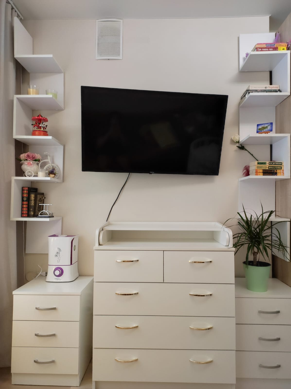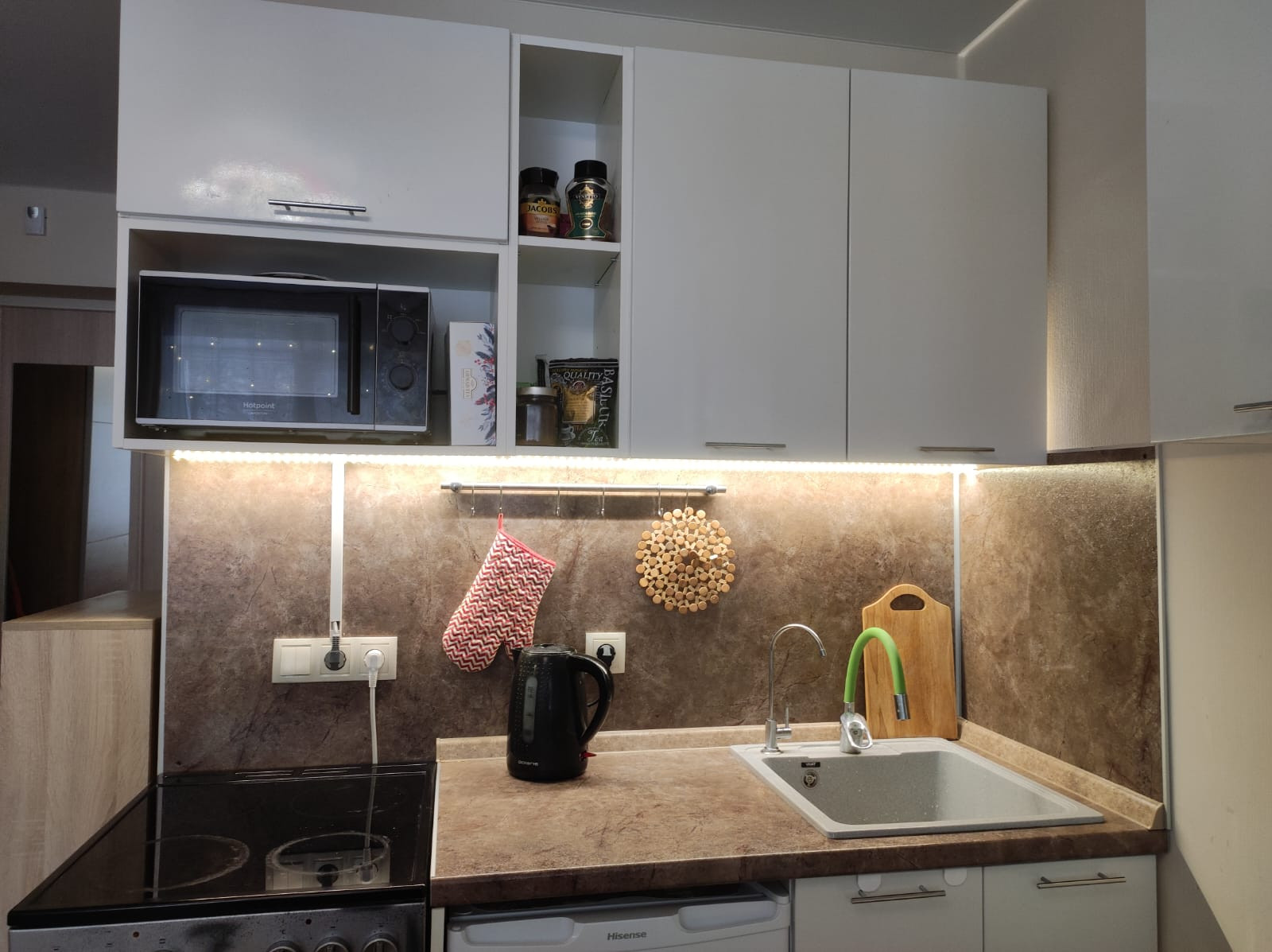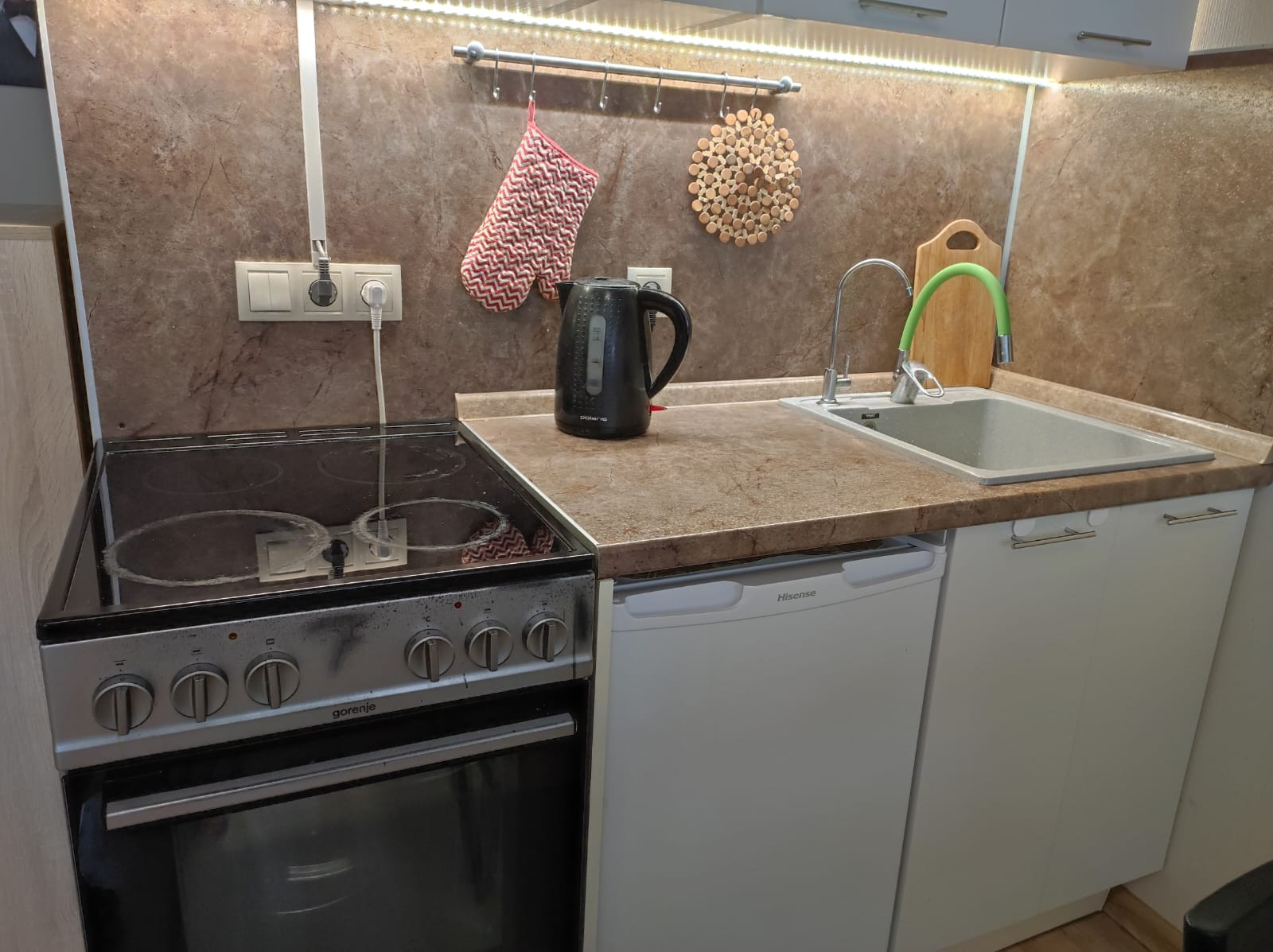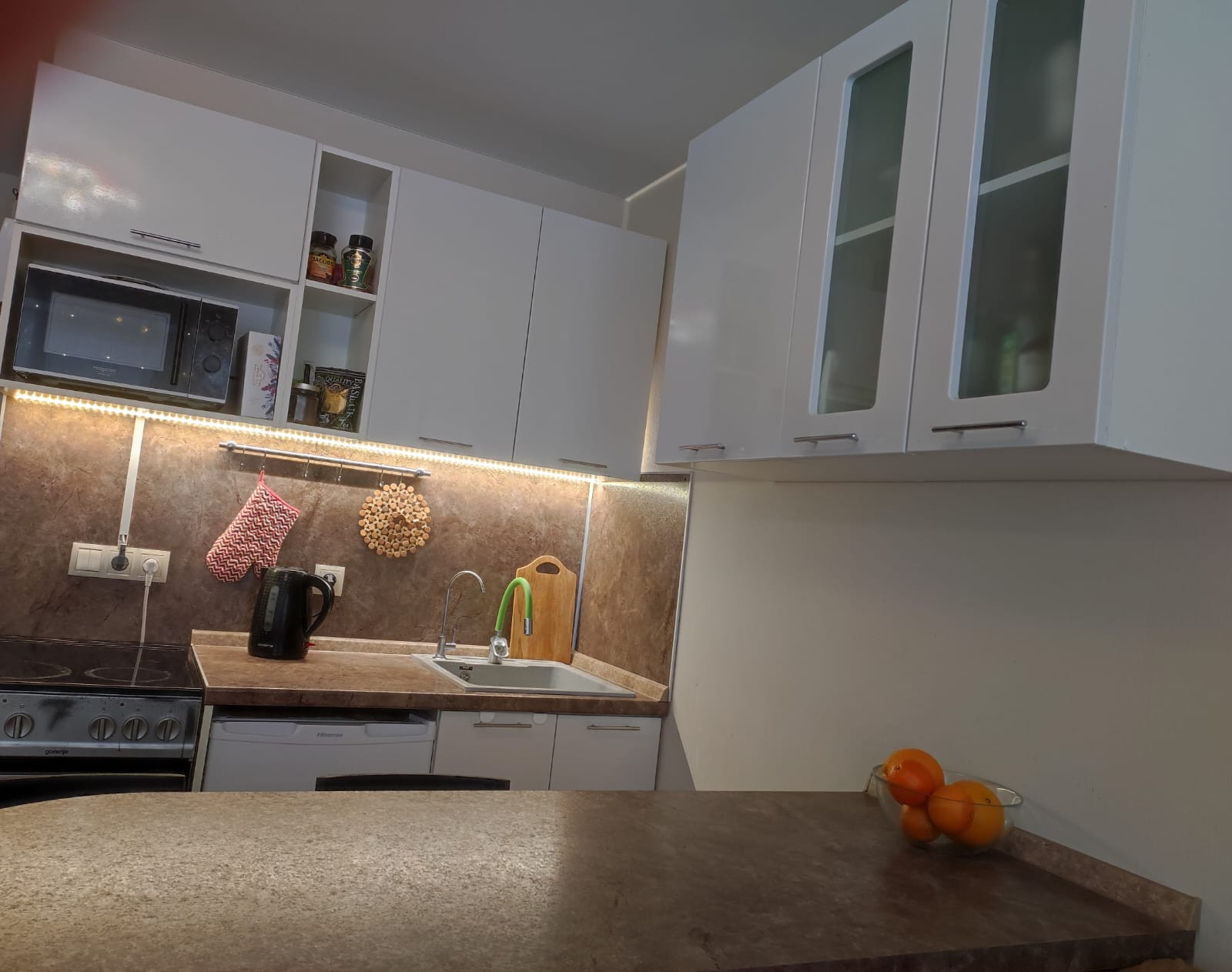 -телевизор, микроволновка, электрический духовой шкаф, фильтр для воды встроен, холодильник, стиральная машина, электрическая сушилка, бойлер для воды.