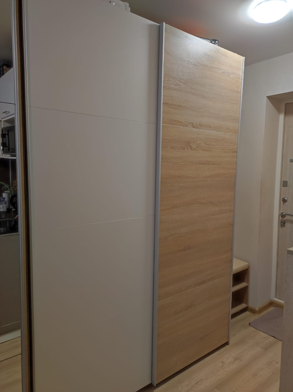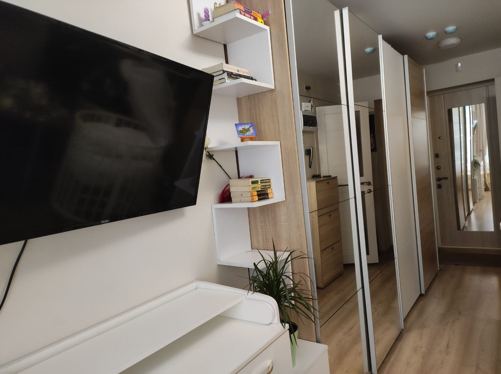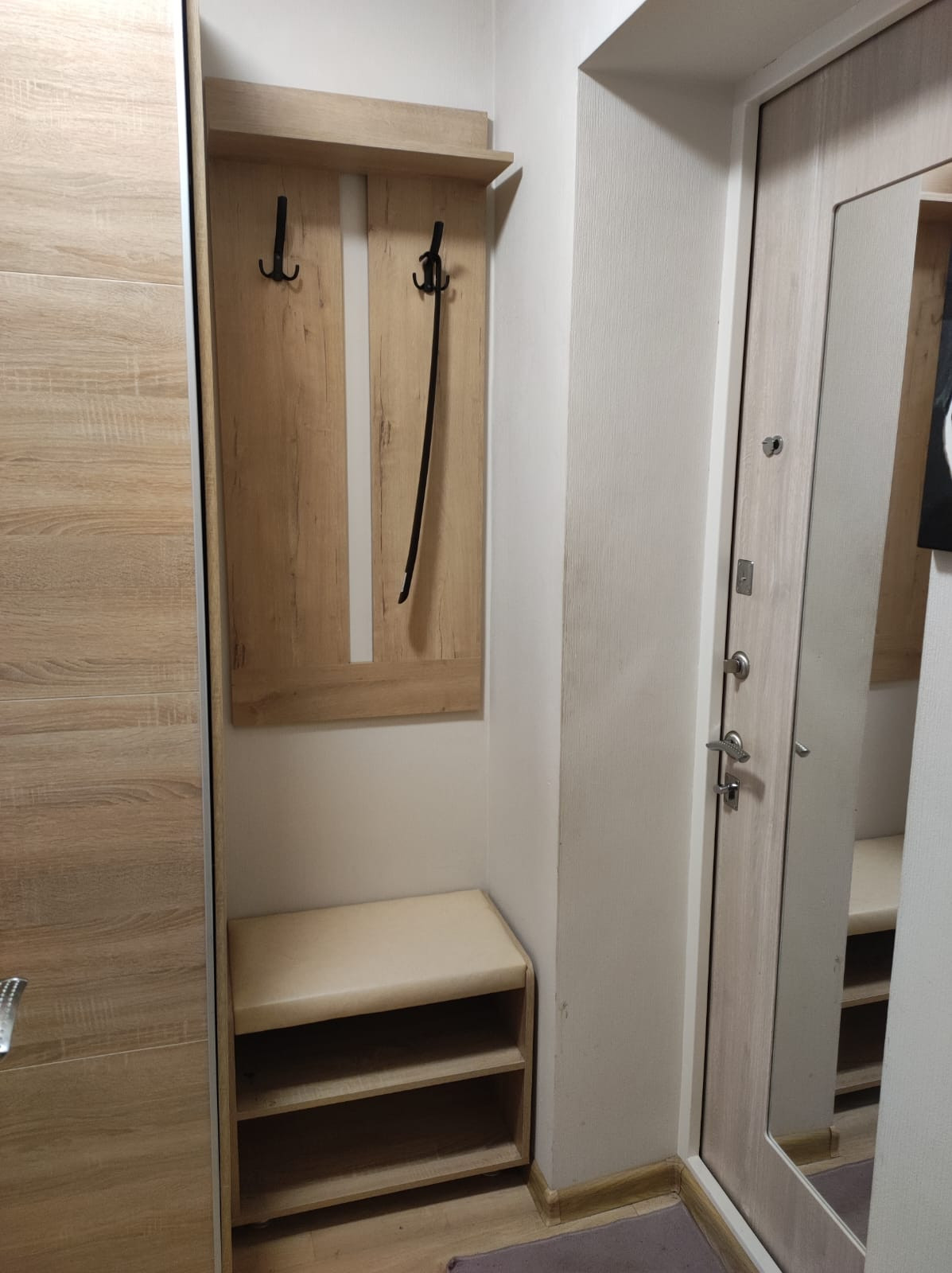 - два шкафа-купе один из них зеркальный, обувница, две прикроватные тумбочки, два барных стула, диван-книжка