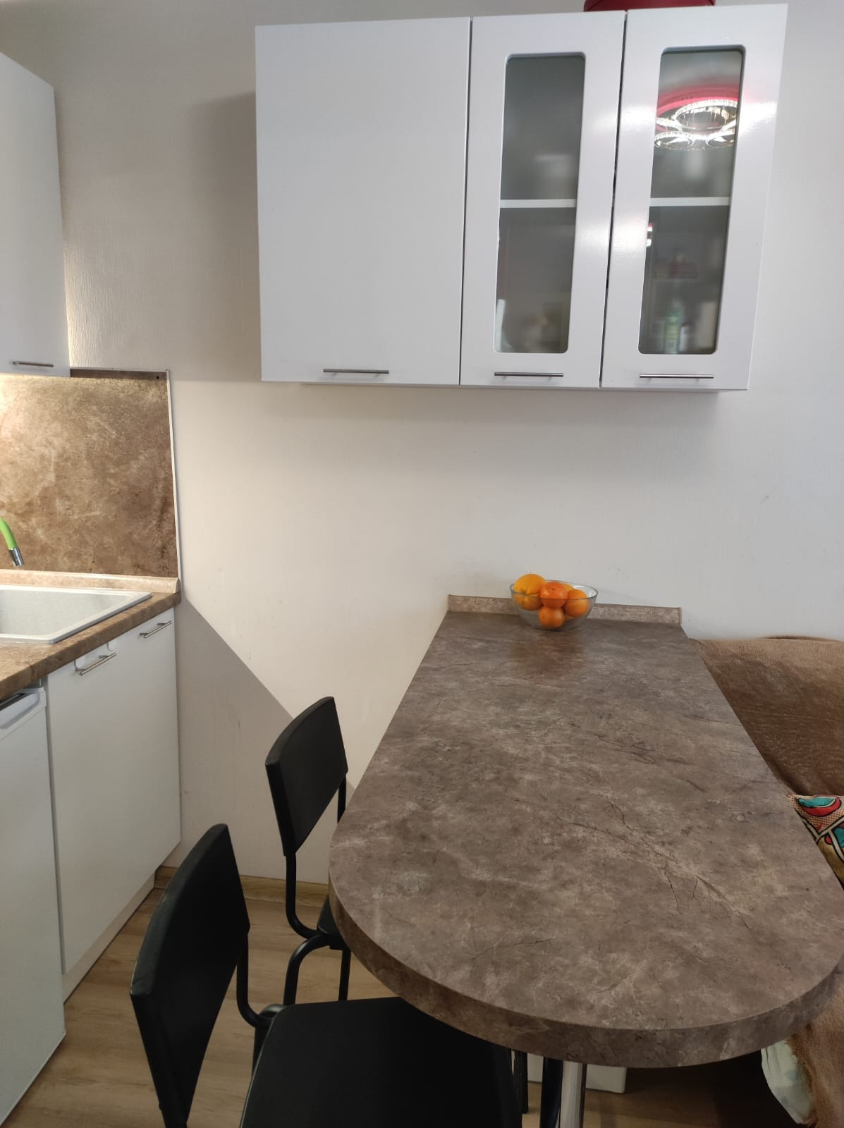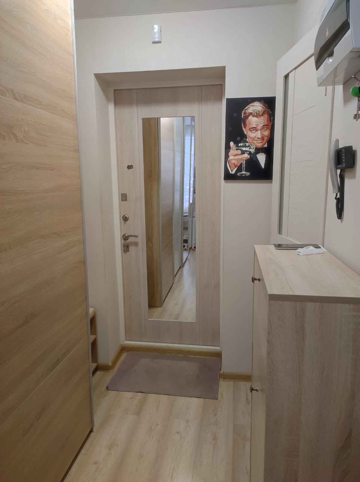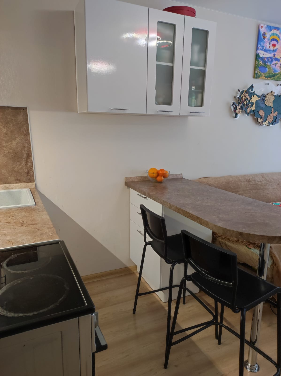 - два шкафа-купе один из них зеркальный, обувница, две прикроватные тумбочки, два барных стула, диван-книжка