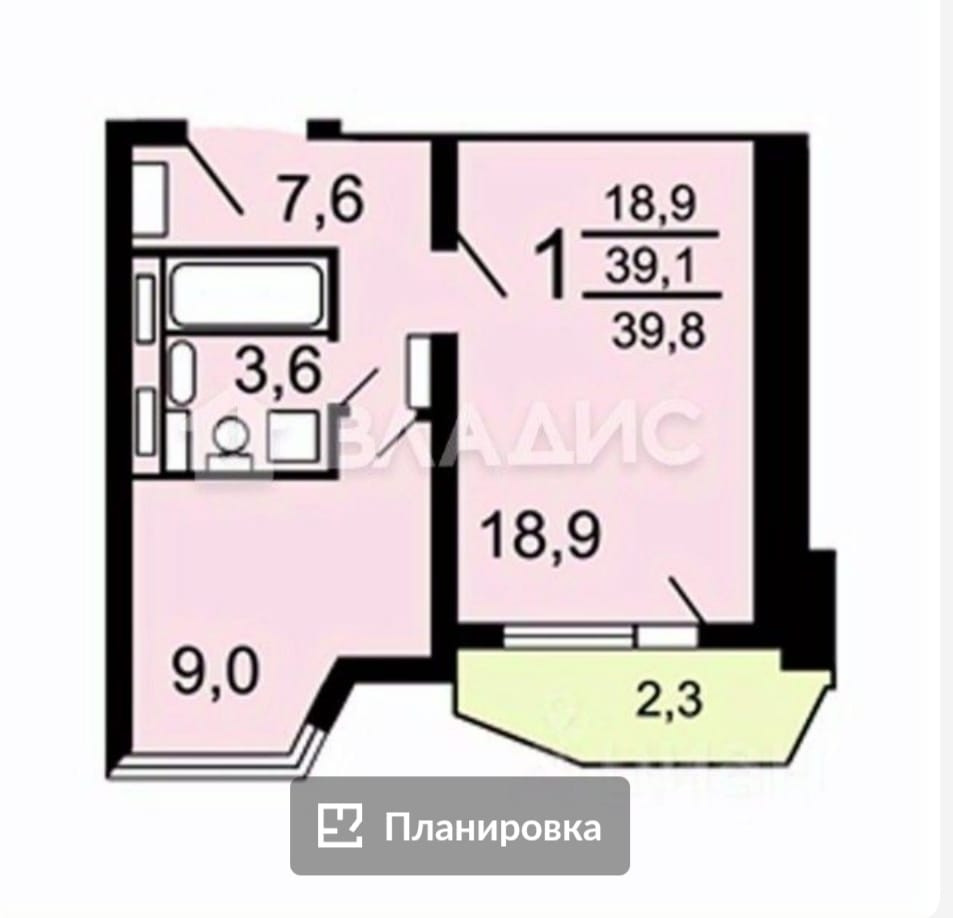 Общая площадь 39.5 м2