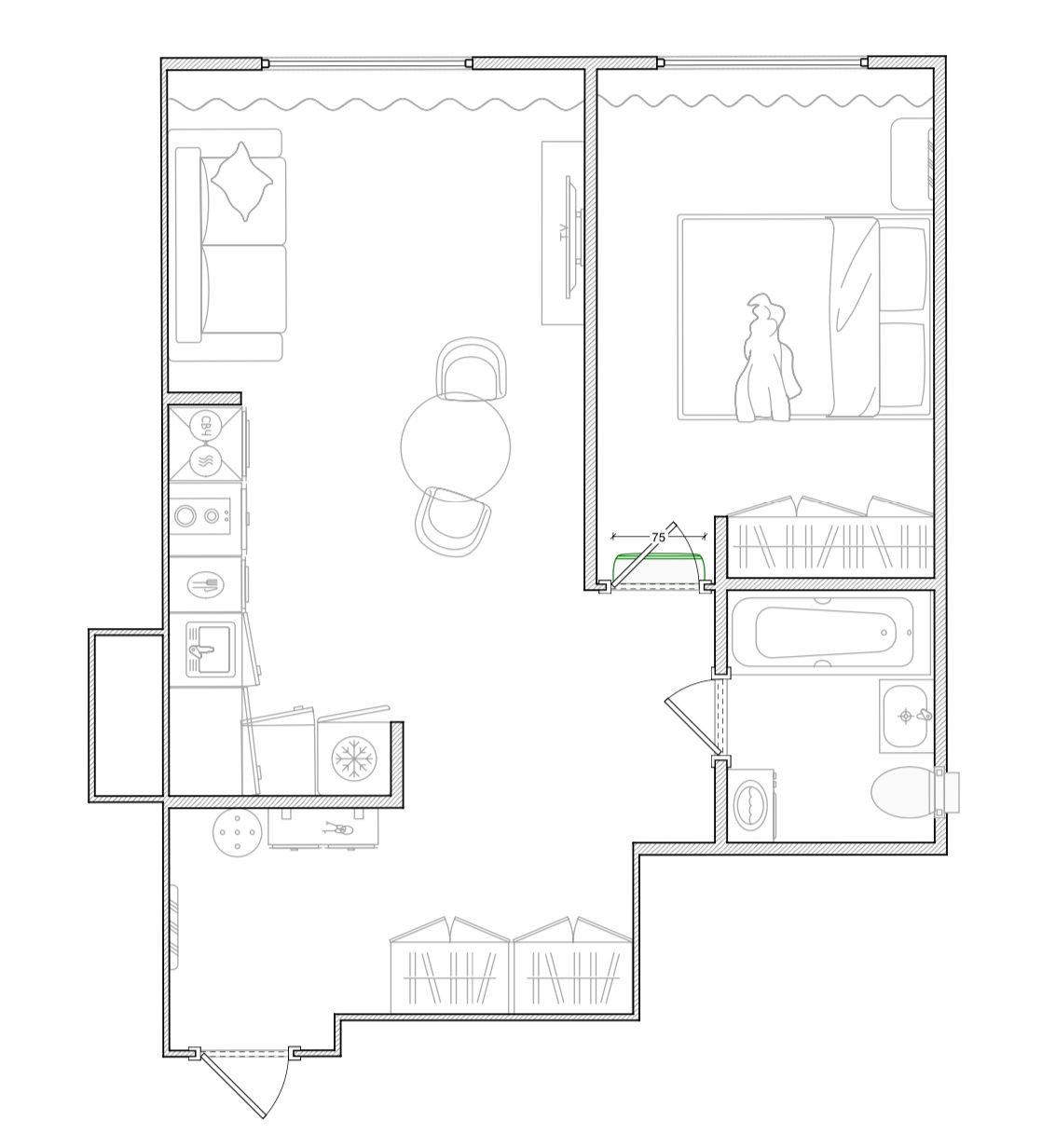 В квартире продуманная до мелочей планировка с выделенной спальней, просторной кухней-гостиной и санузлом с полноценной ванной.