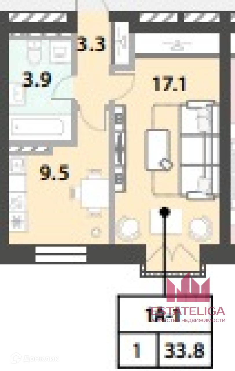 Общая площадь 33.8 м2