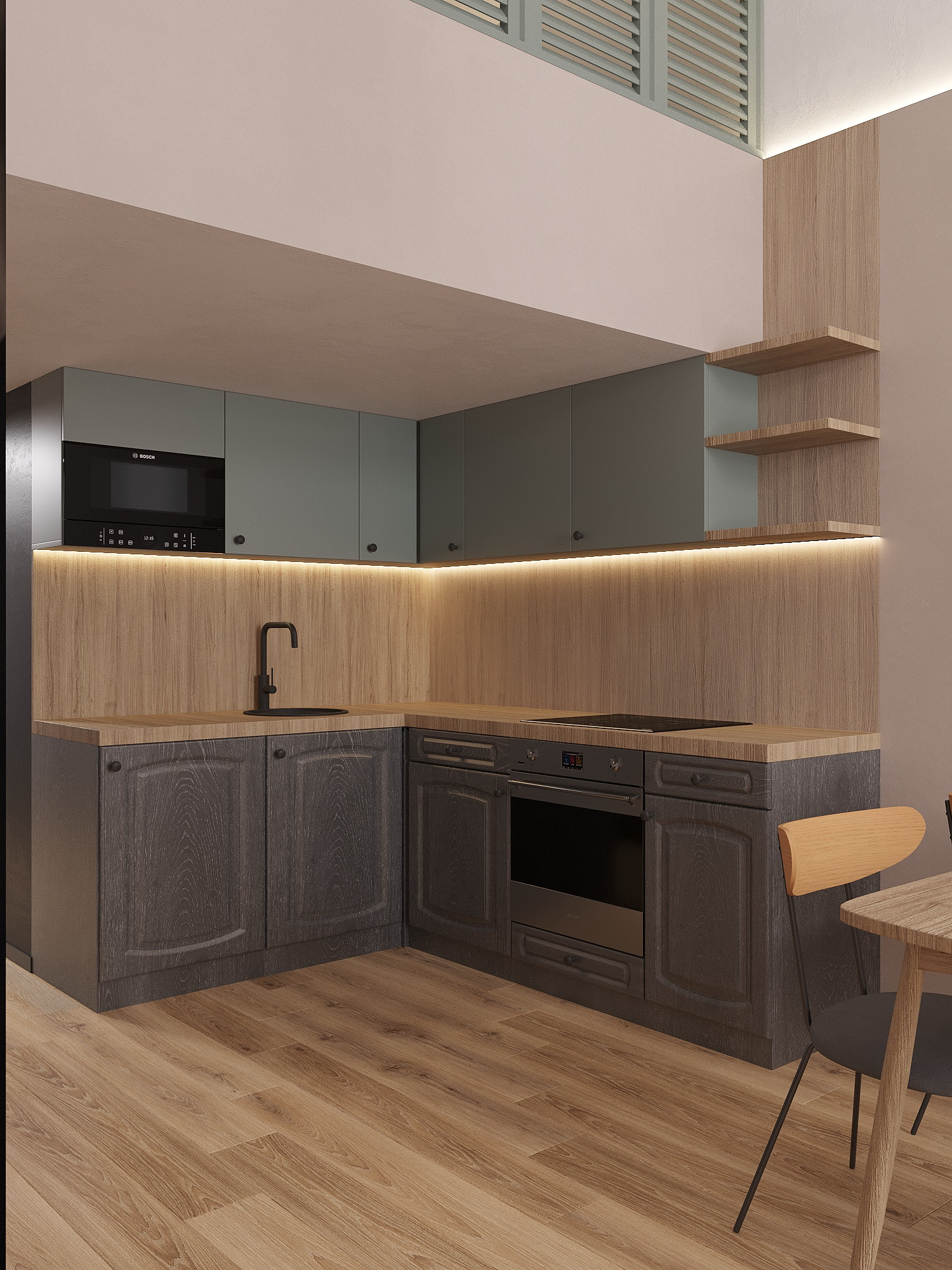 Полная дизайнерская отделка, включающая укомплектованную кухню от российского производителя  и ванную комнату с сантехникой