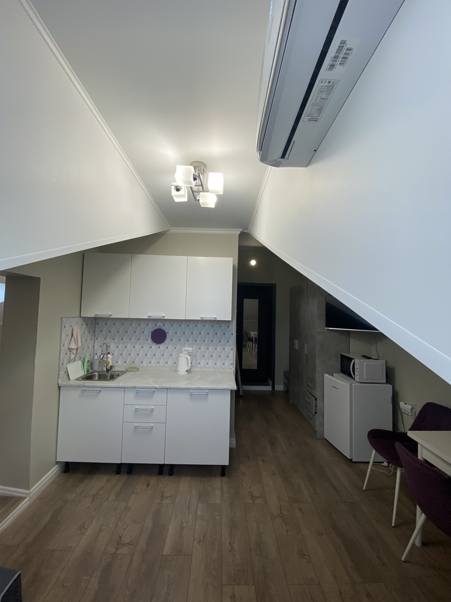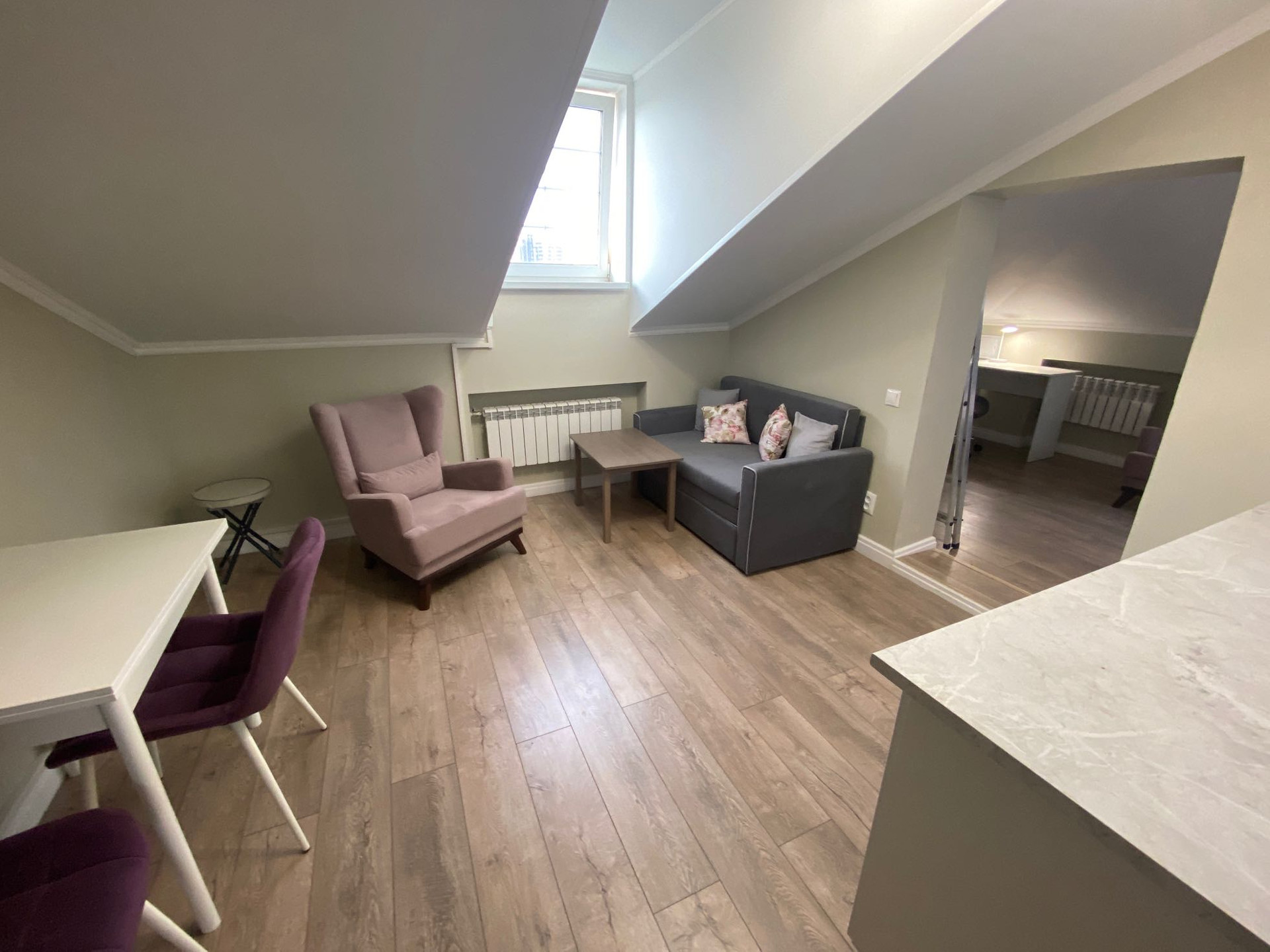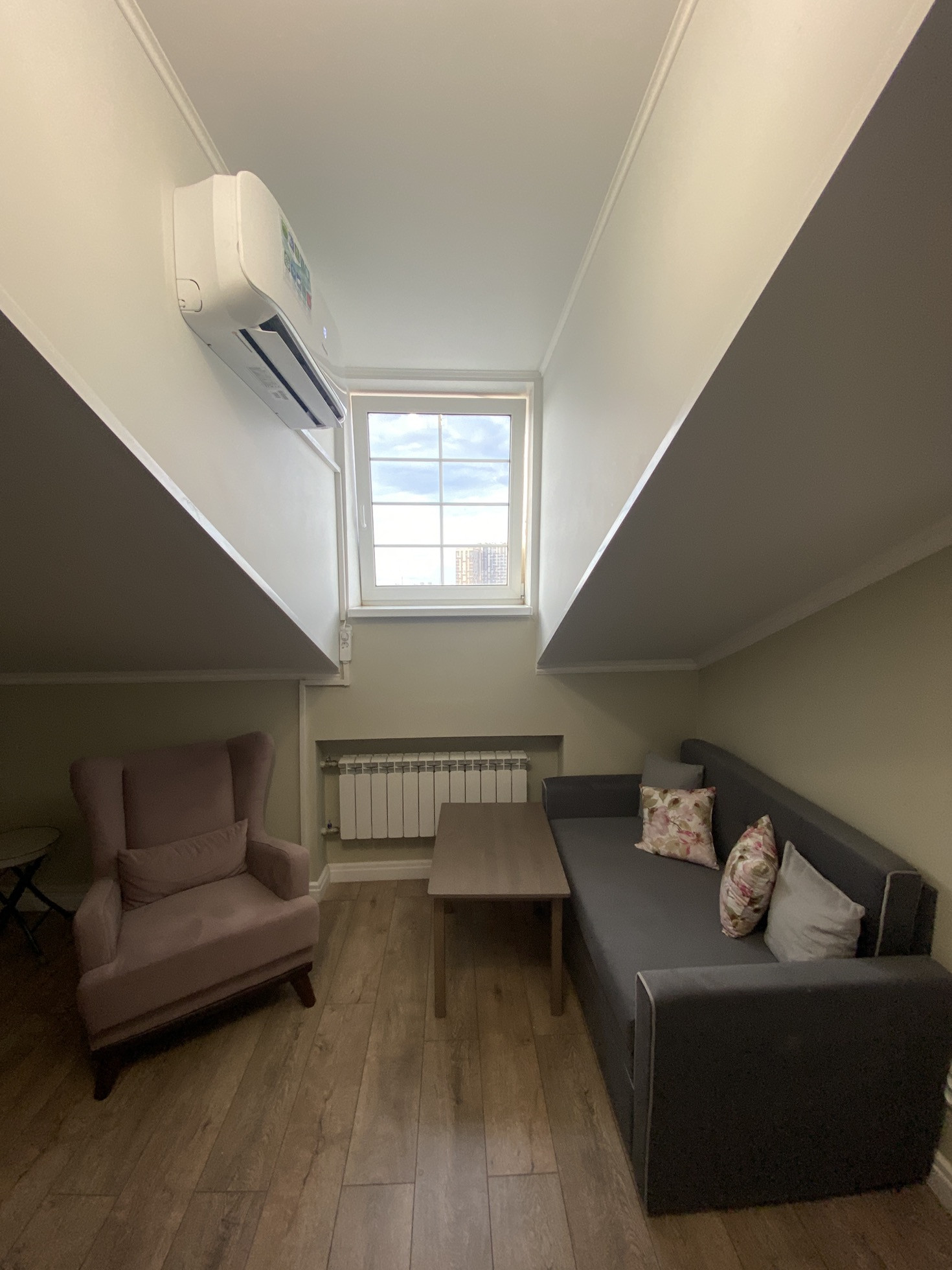 Двухкомнатные аппартаменты 32.2 м, на мансардном этаже, полностью готовые к проживанию, все новое. Соседи - только через одну стенку, тихо и спокойно. Кондиционер добавляет уюта.