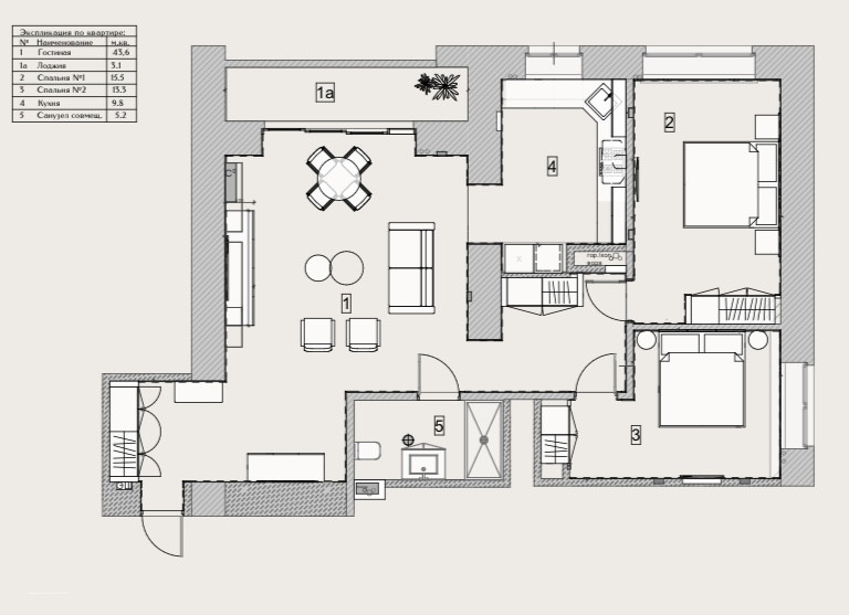 Экспликация по кваpтиpе: гостиная 43,6м2, спальня 15,5 м2 , спальня 13,3 м2, кухня 9,8м2, санузел совмещенный 5,2 м2, лоджия 3,1 м2 .