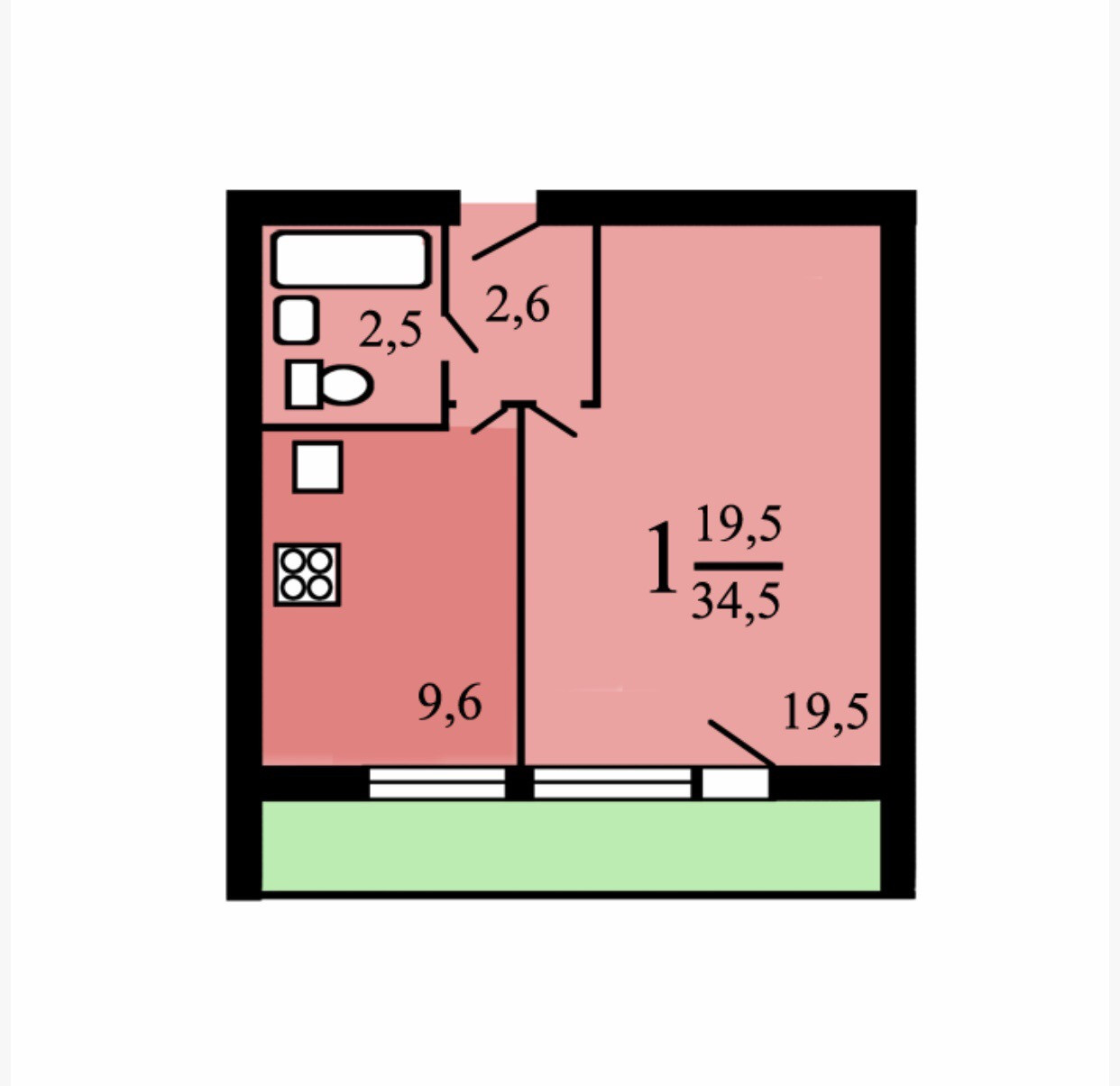Общая площадь 34.5 м2