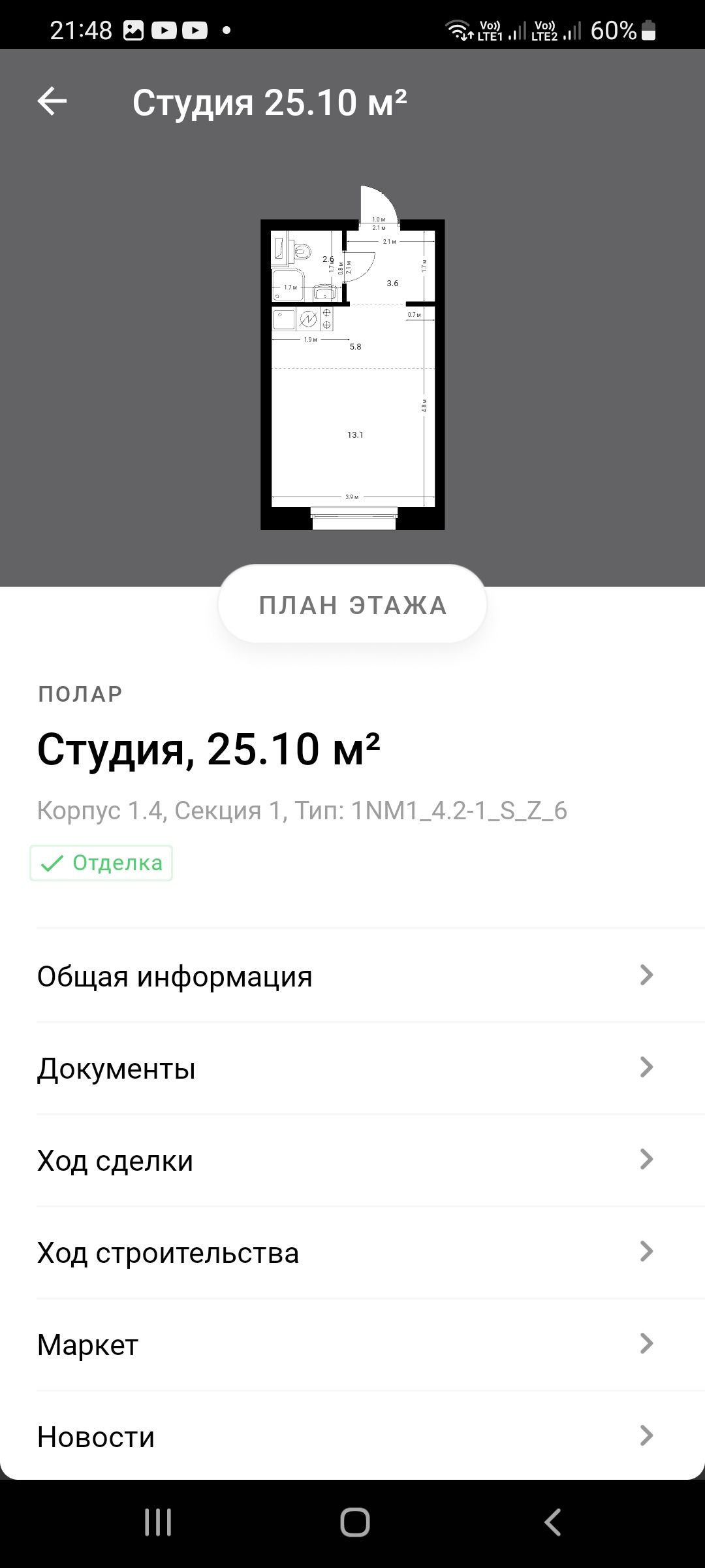 Общая площадь 25.1 м2