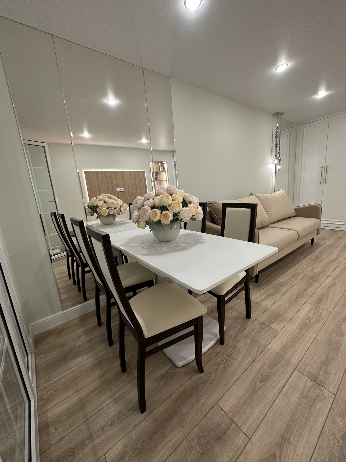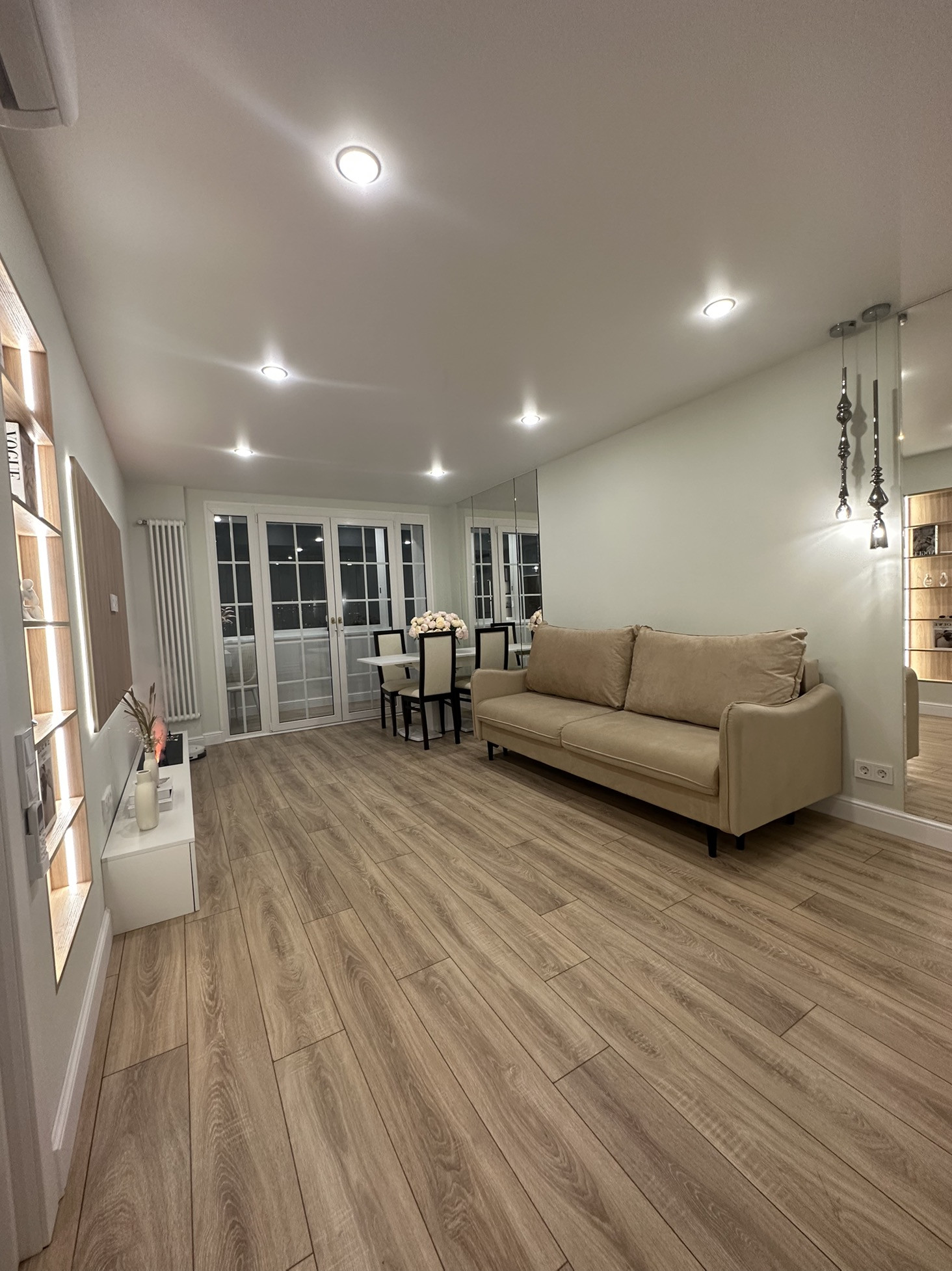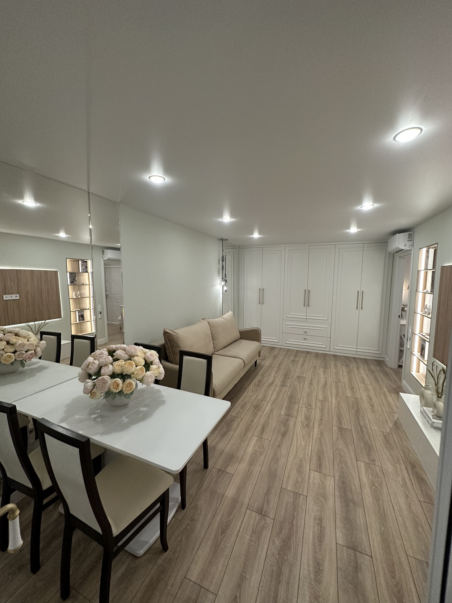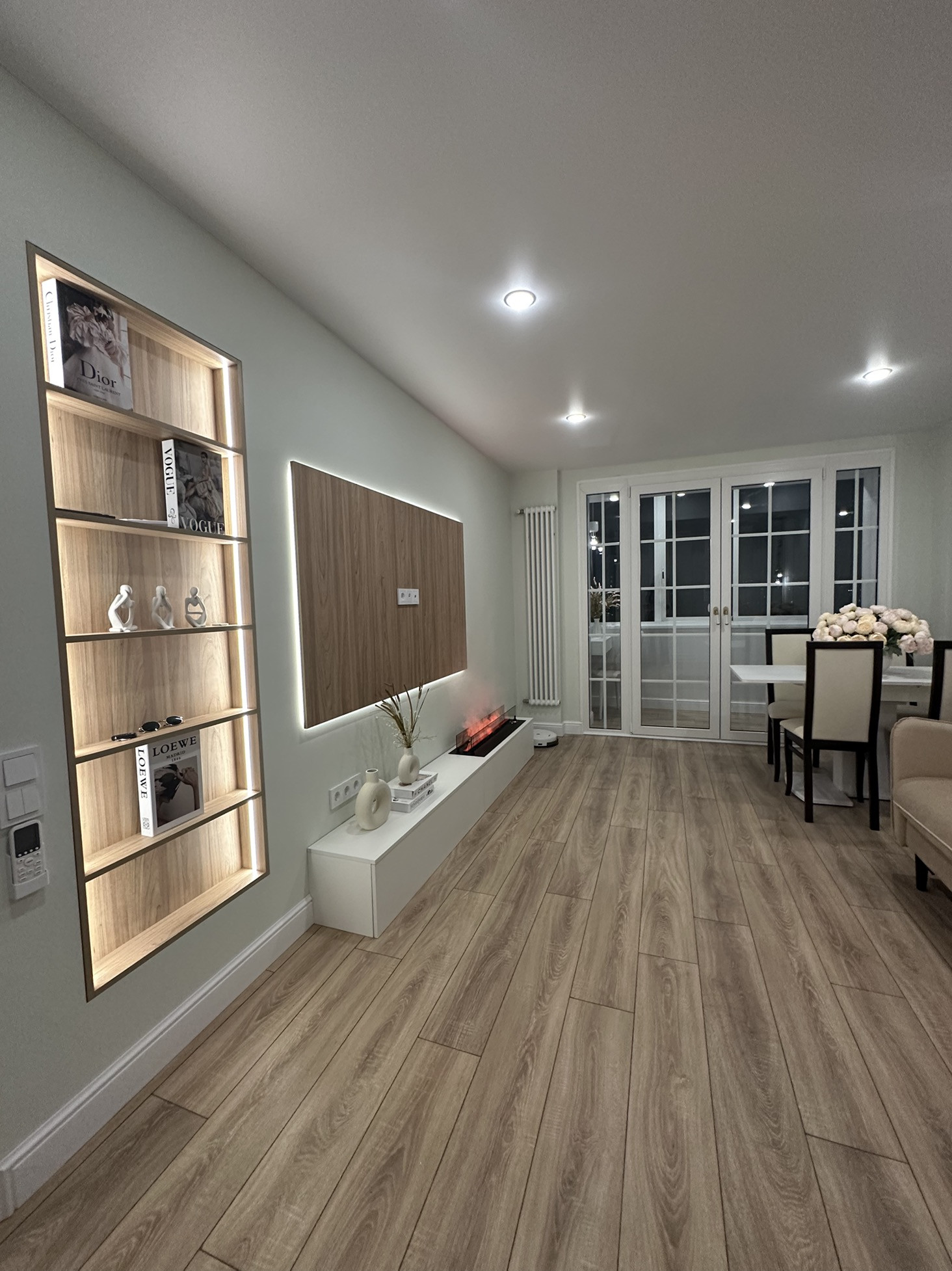 Гостиная обладает удобствами в виде огромного встроенного шкафа,обеденной зоны, встроенным паровым камином,роботом-пыле