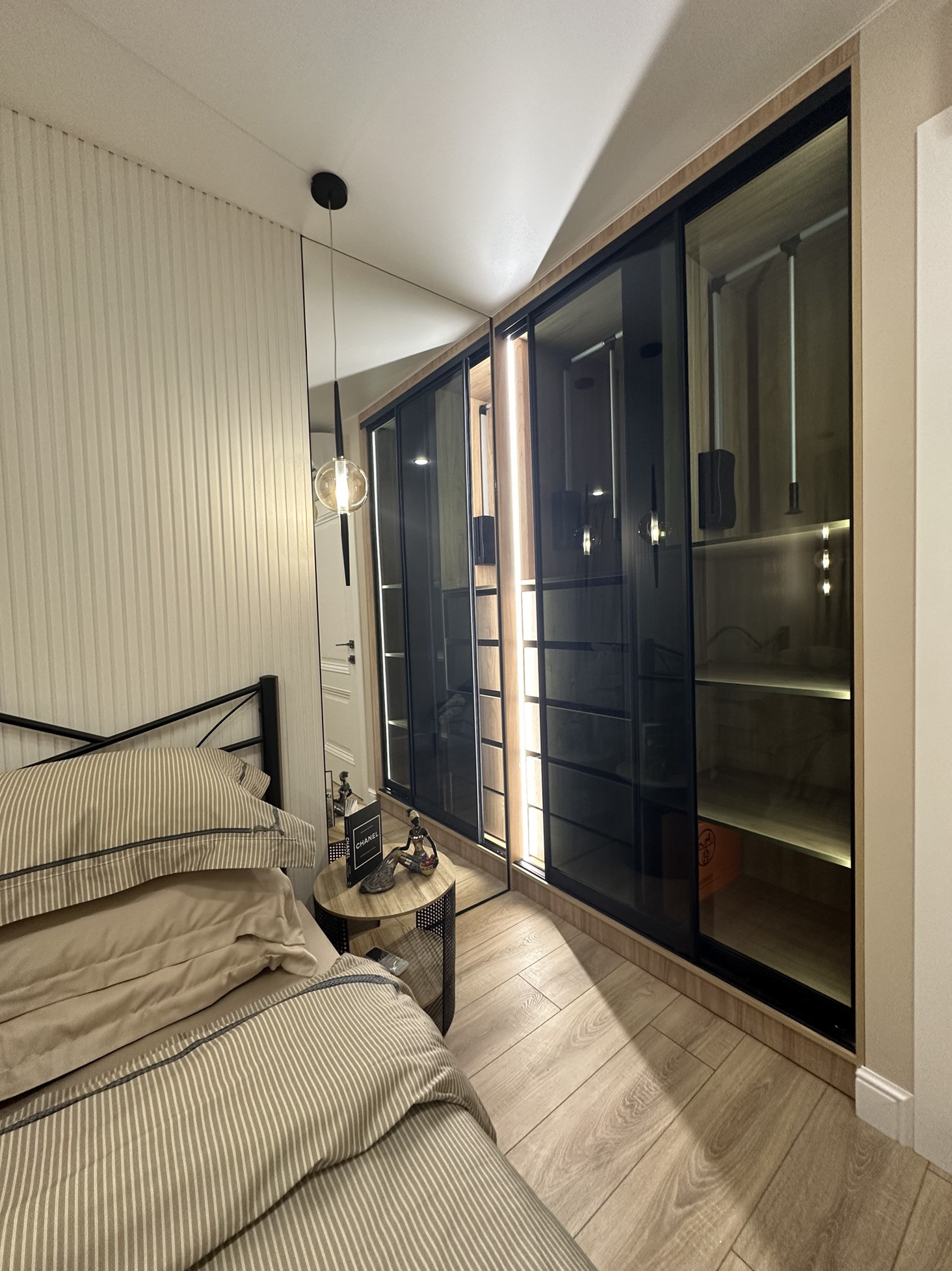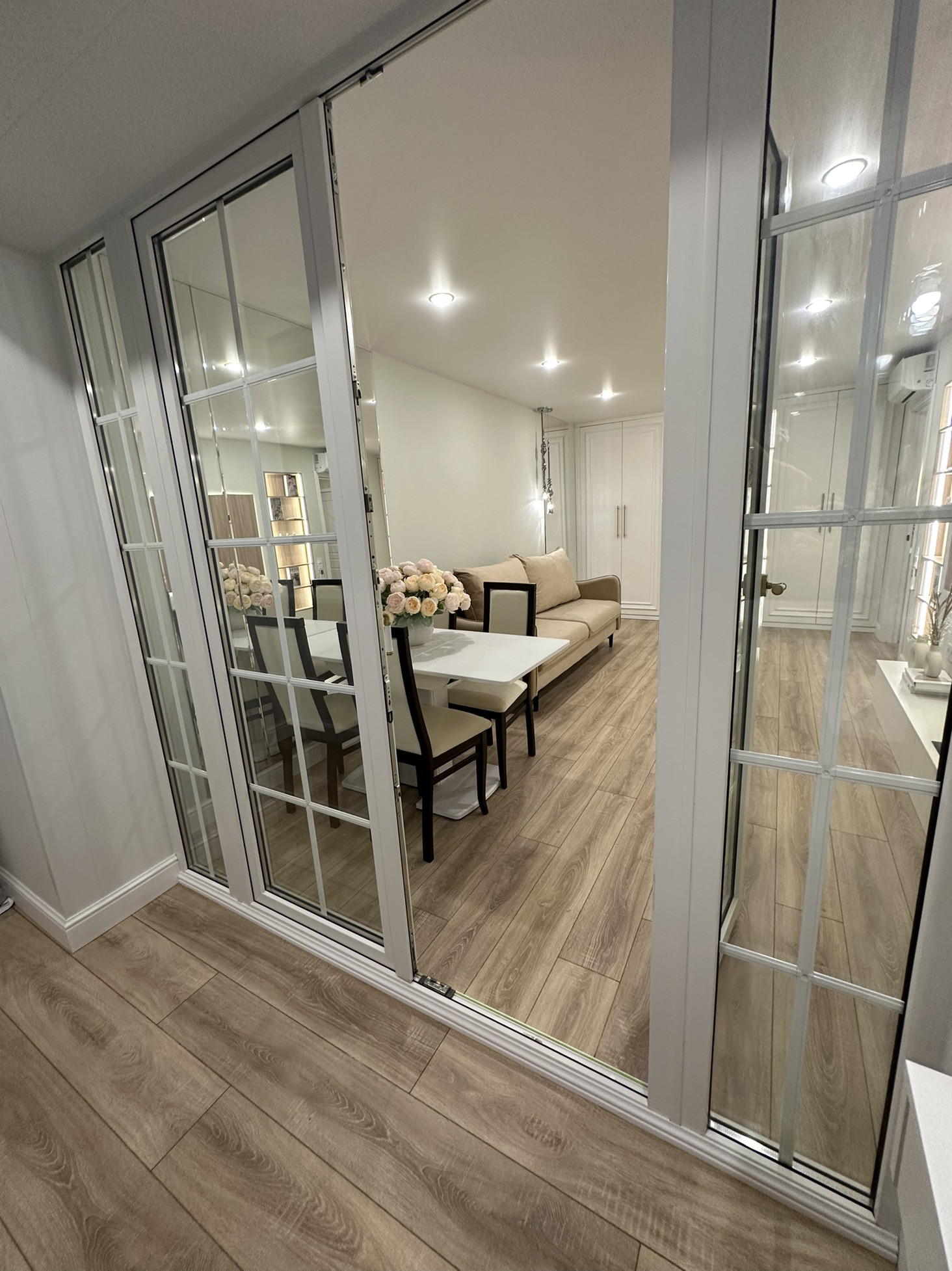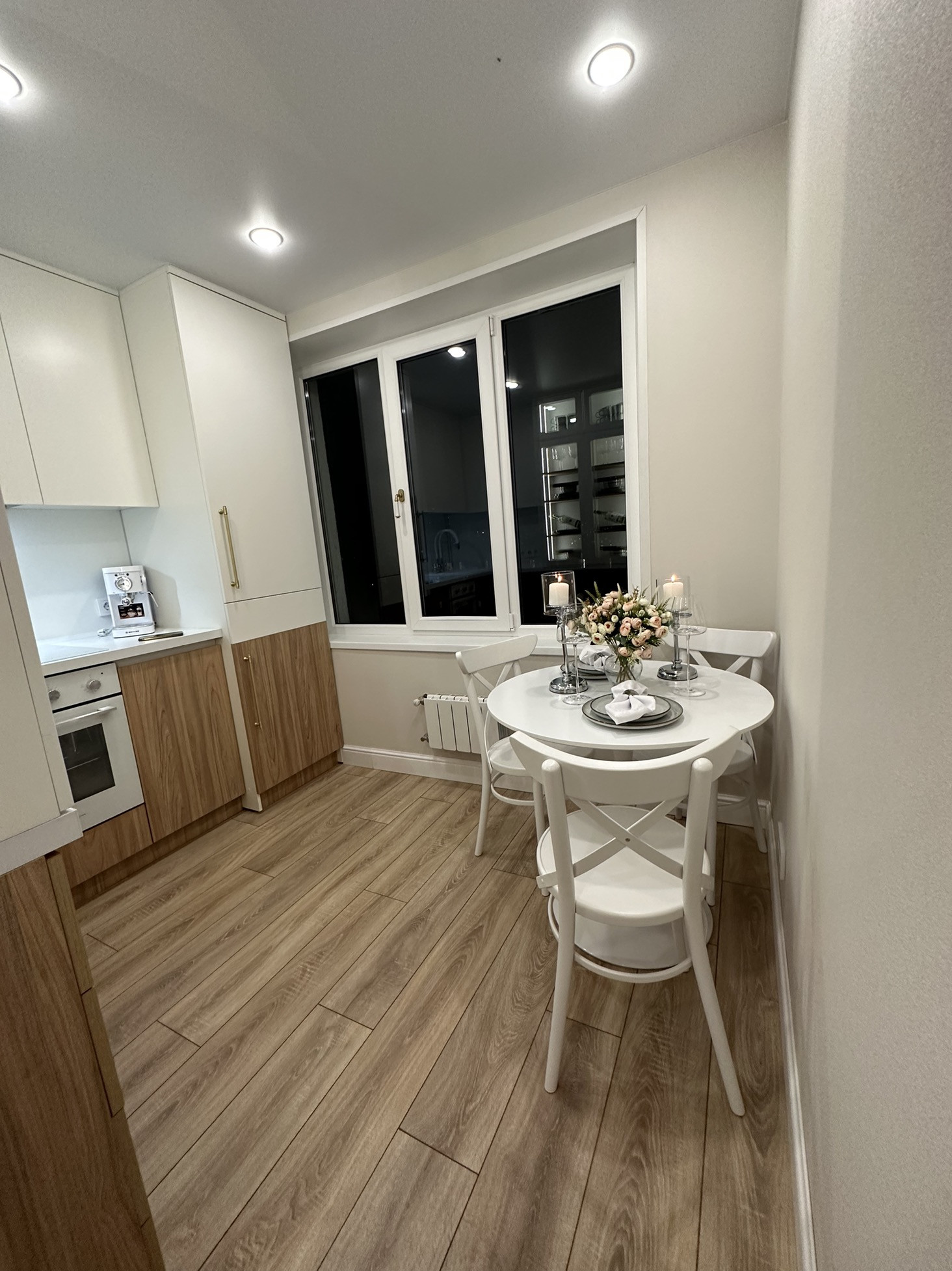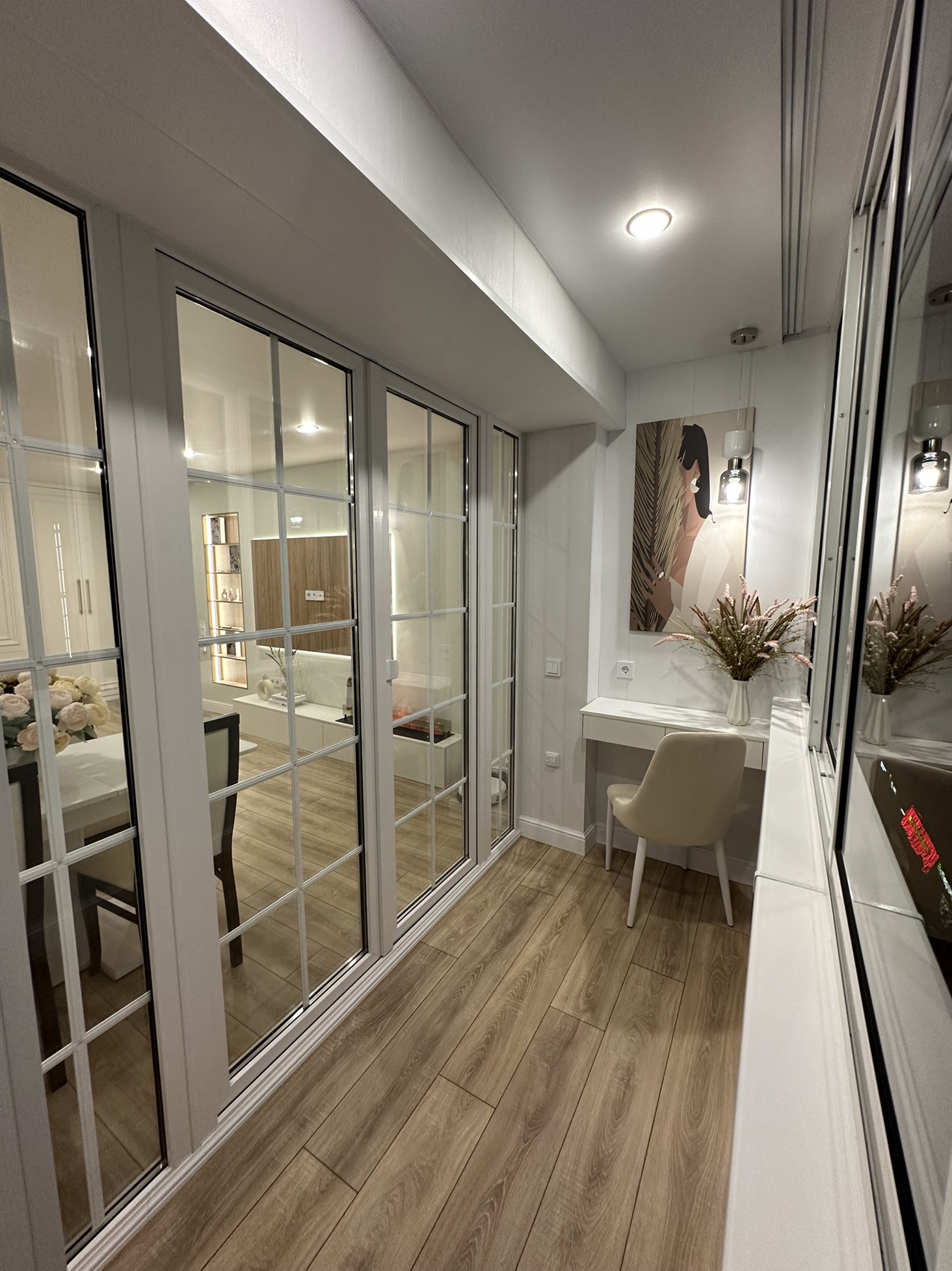 Гостиная обладает удобствами в виде огромного встроенного шкафа,обеденной зоны, встроенным паровым камином,роботом-пыле