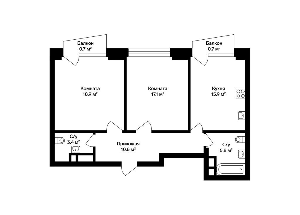 Две изолированные спальни- 17.1м2 и 15.9м2.