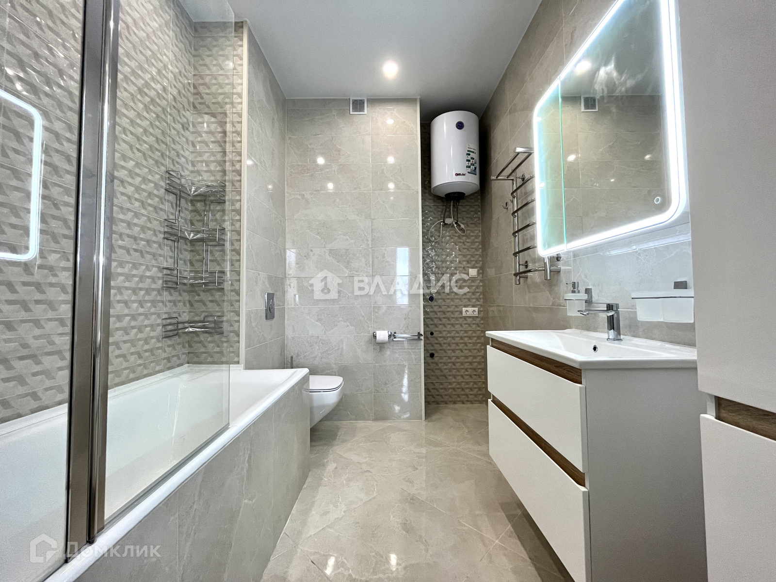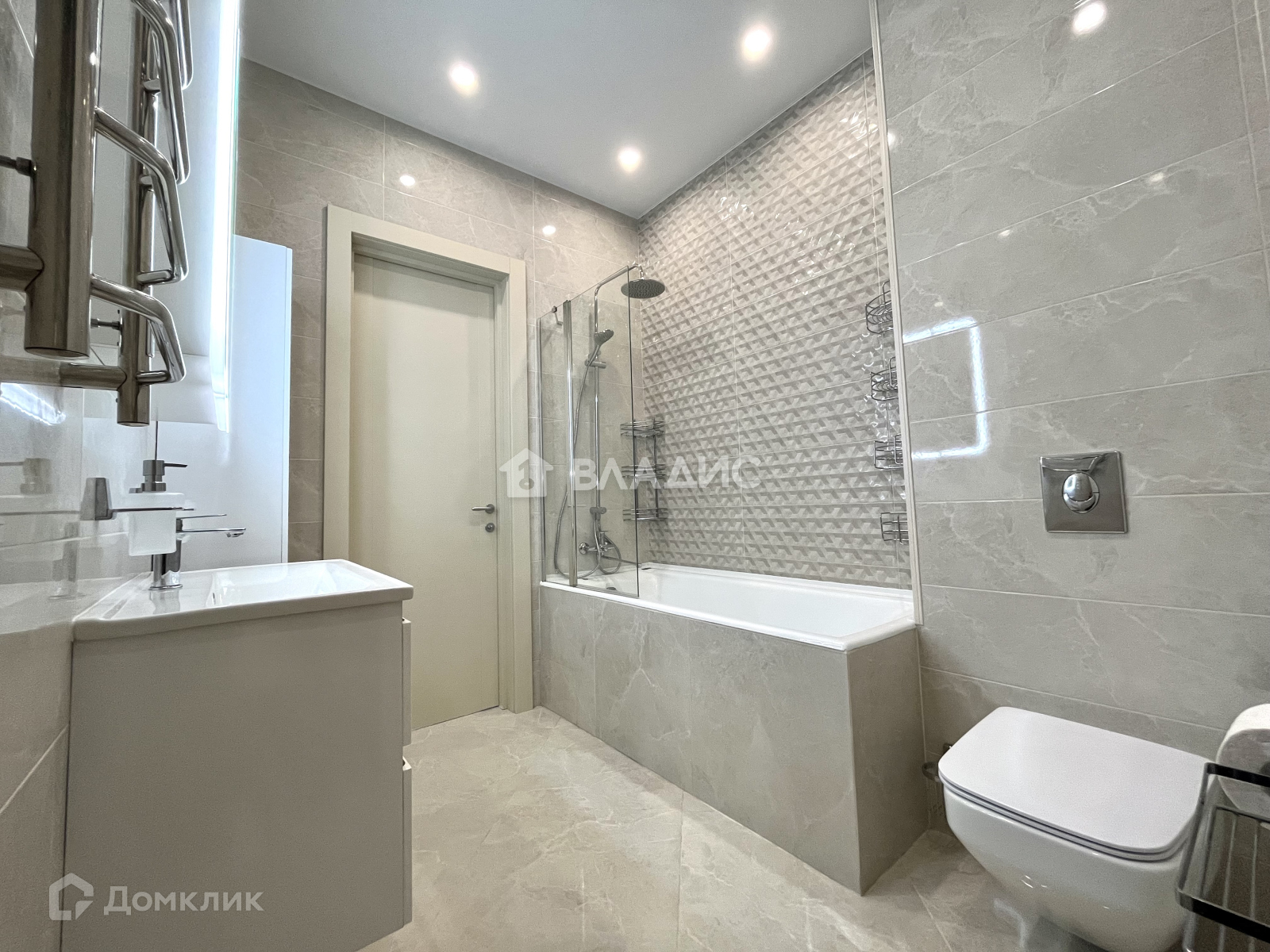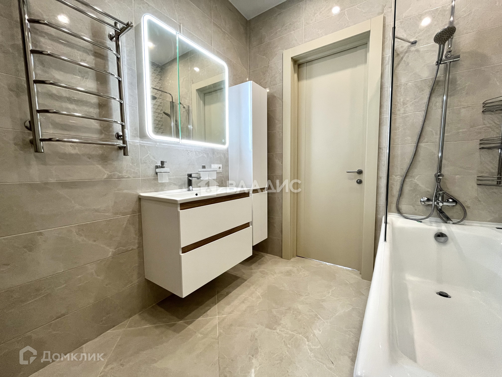 Полы - кварцвинил Pergo (Бельгия), сантехника и мебель в ванной - AmPm. Ванна чугунная Byon (Швеция).