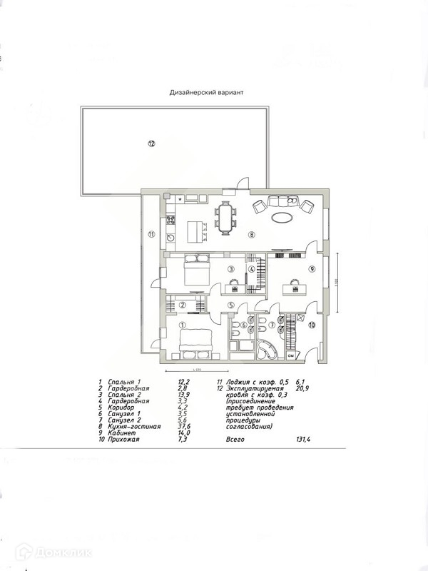 Общая площадь квартиры составляет 131 кв.м., из которых 20,9 кв.м. - площадь террасы.