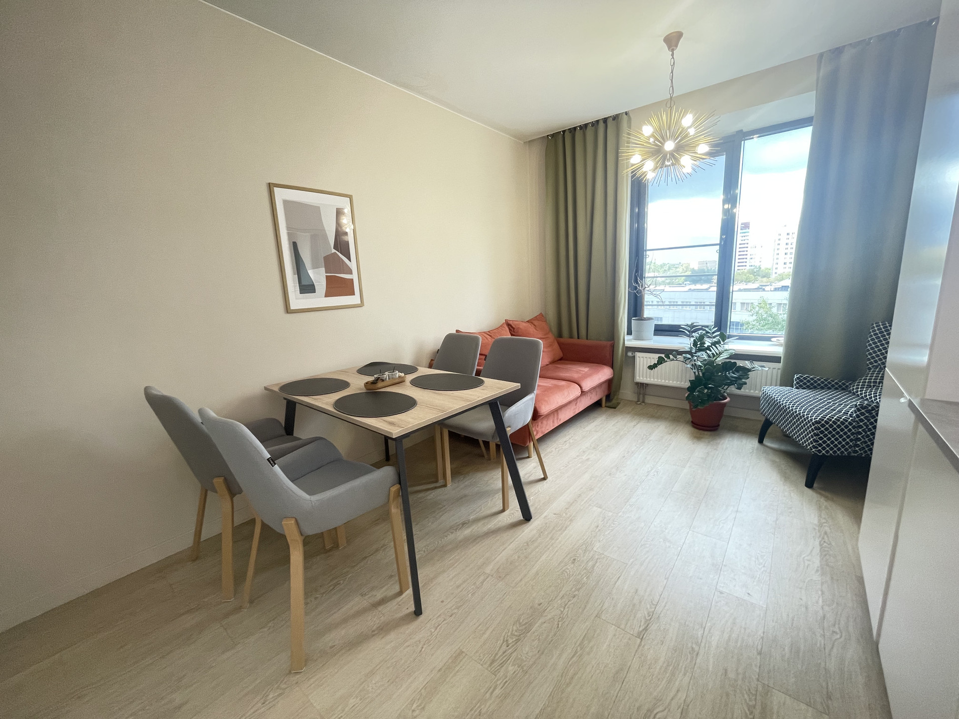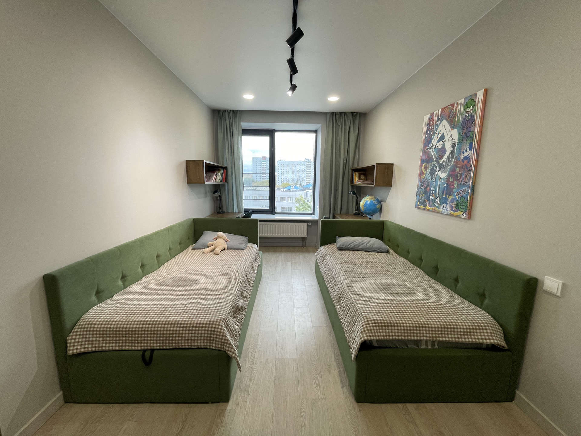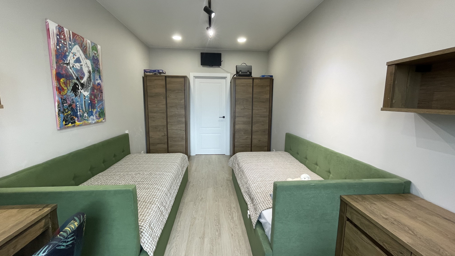 Планировка: две изолированный спальни, кухня-гостиная, гардеробная, сан узел.