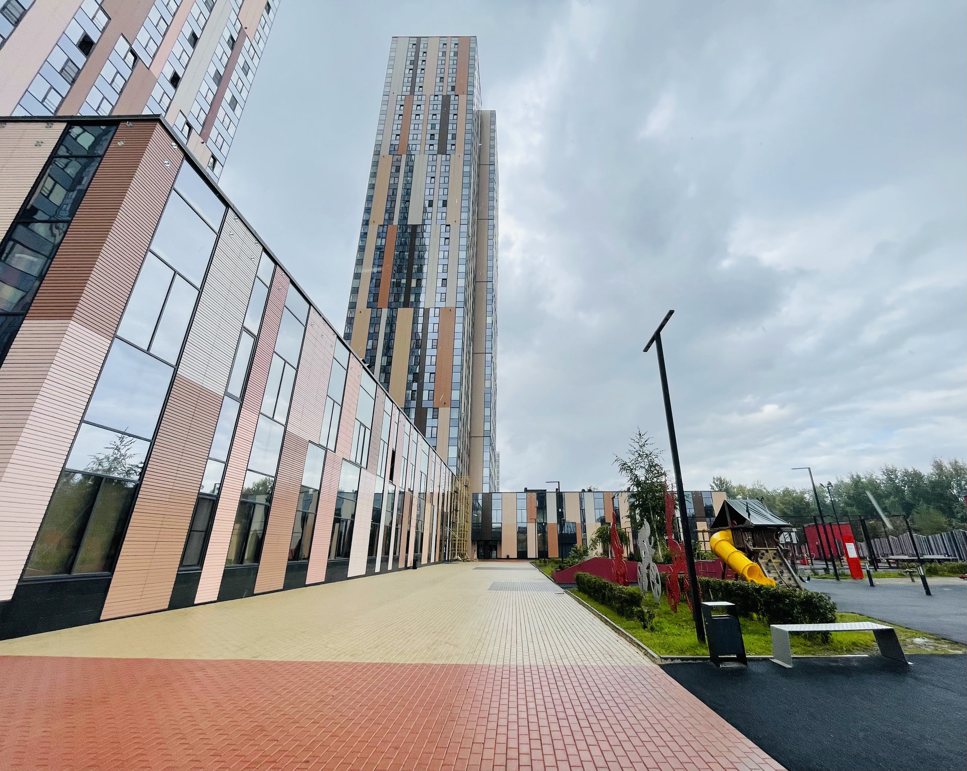 Огороженная территория, огромный двор без машин, во дворе несколько детских и спортивных площадок, зоны отдыха.