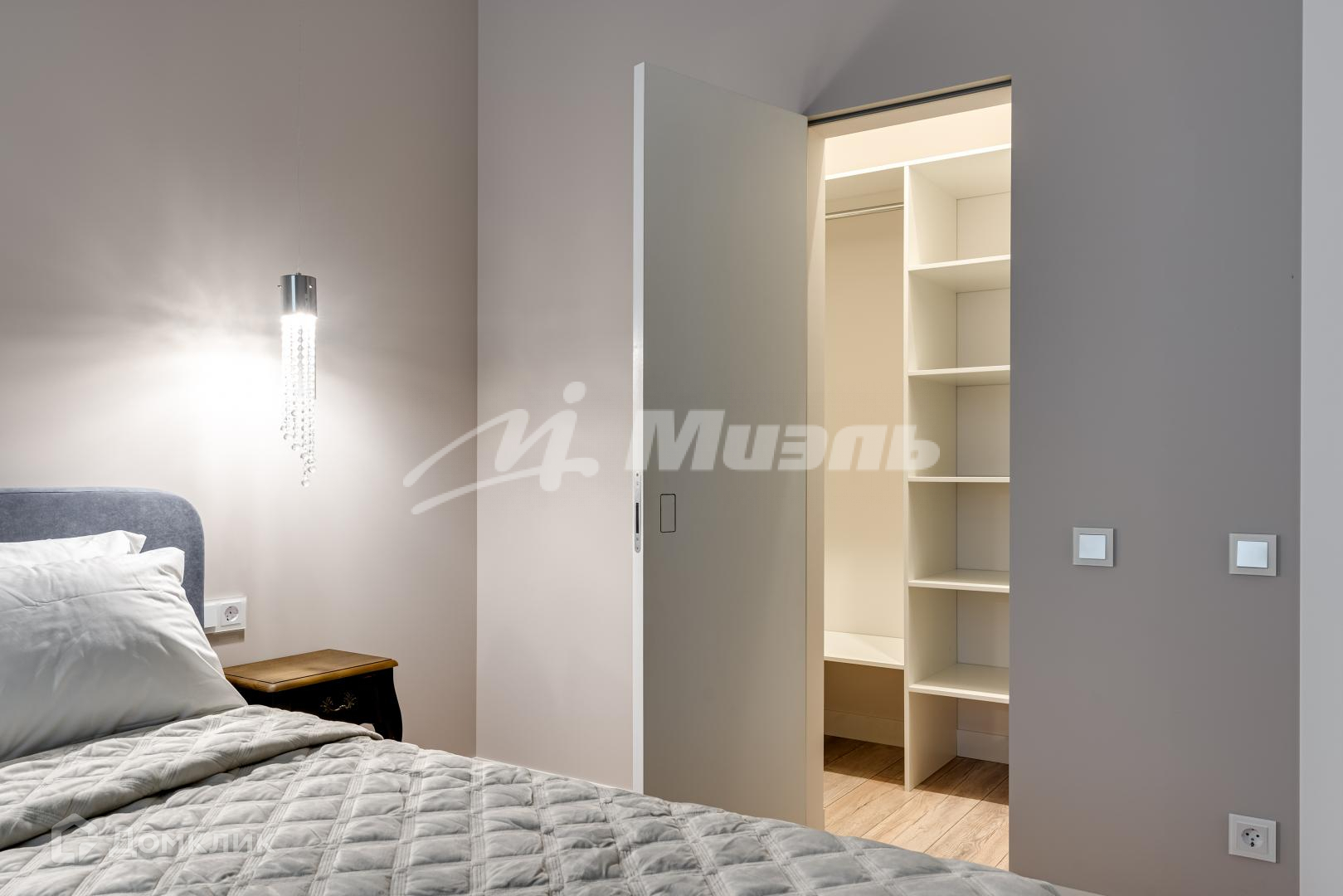 Организованы места для хранения, в спальне — гардеробная комната со скрытой дверью, в коридоре – 2 вместительных шкафа.