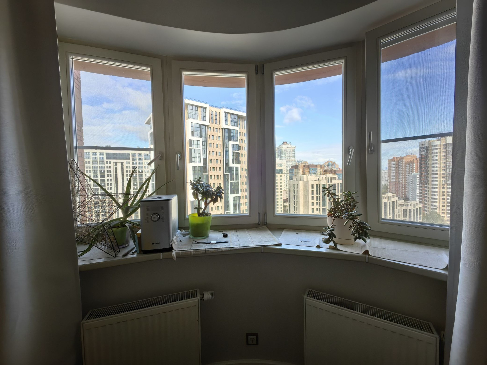 Деревянные стеклопакеты во всех комнатах. В кухне два окна. Окна на 2 стороны: восток и запад - идеальное освещение солнцем и при этом нет южной/северной стороны. Электрика новая.