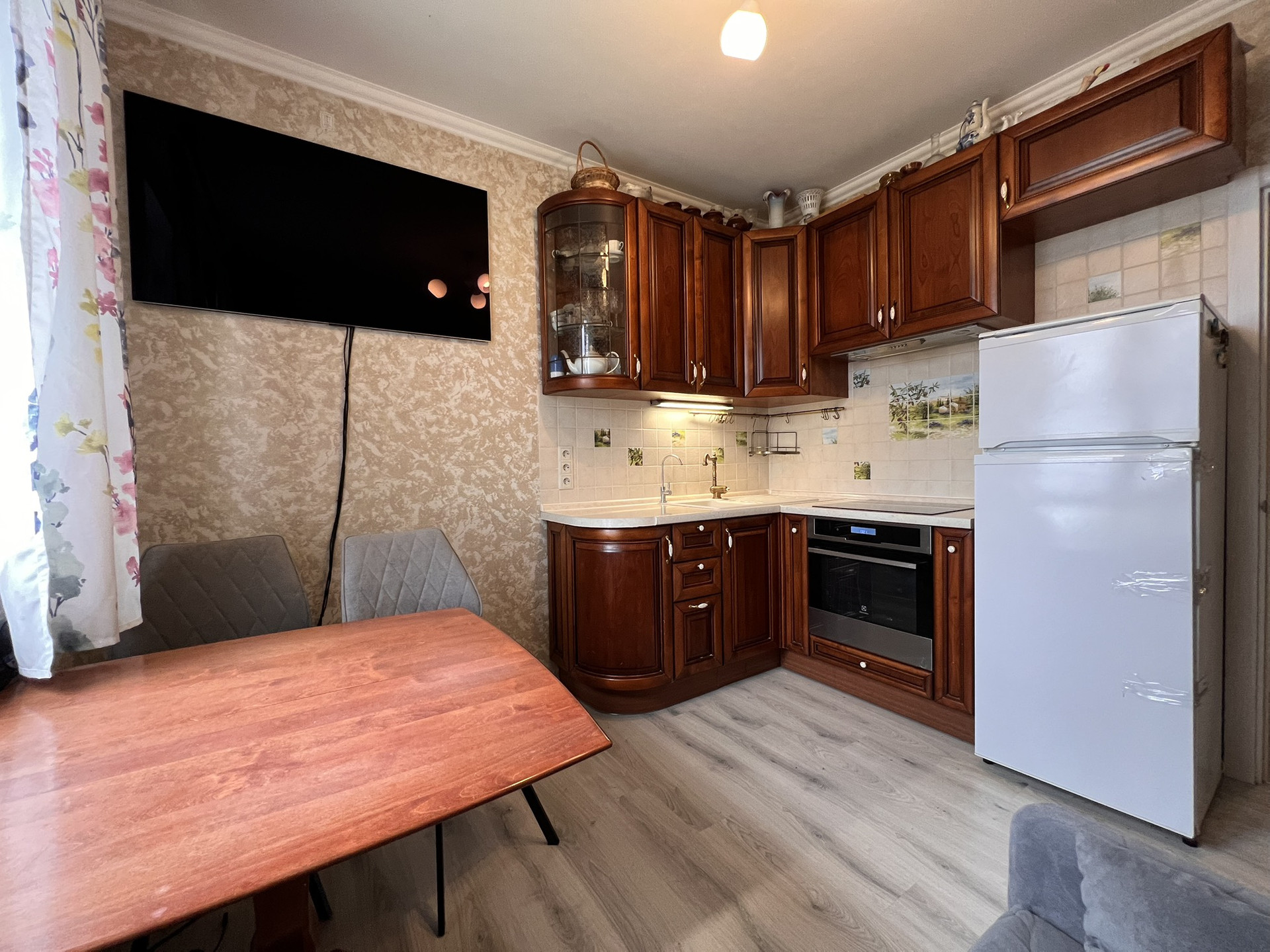 Просторная комната 22м с застекленной лоджией 4м, кухня квадратной формы 10м.