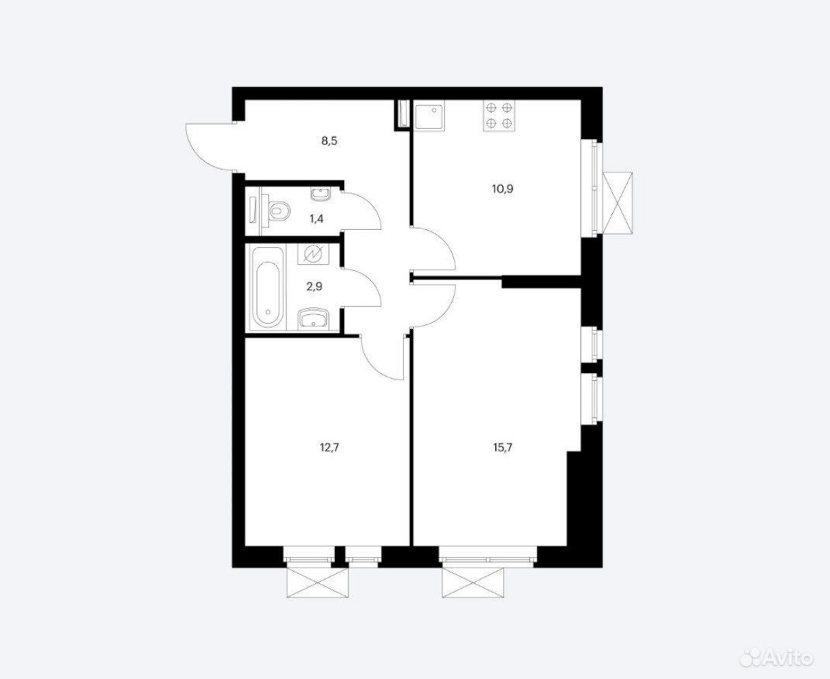 2 раздельных санузла, просторная кухня 10,9 кв.м, большая спальня 15,7 кв.м, 2 спальня 12,7 кв.м.