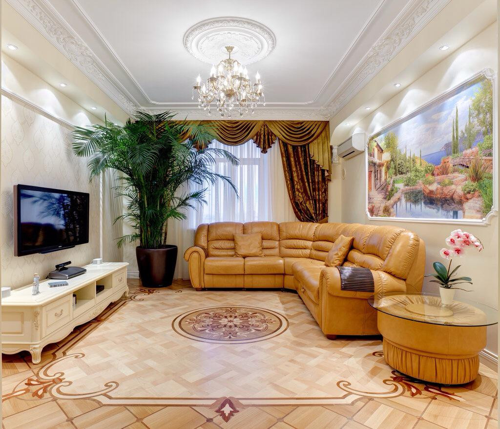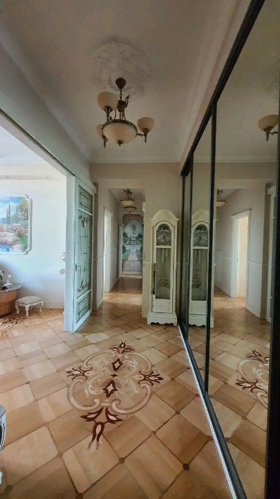 Художественный 3D паркет SHENDER Декор акцентирован орнаментом, набранным из четырех видов дерева - клена, дуба, ореха и мербау, которому соответствует оригинальная, отреставрированная, лепнина на потолке и стенах. Фрески с романтическими пейзажами.