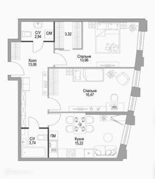 По планировке: 2 изолированные спальни, кухня, просторная зона холла, 1 раздельный санузел и 1 совмещенный.