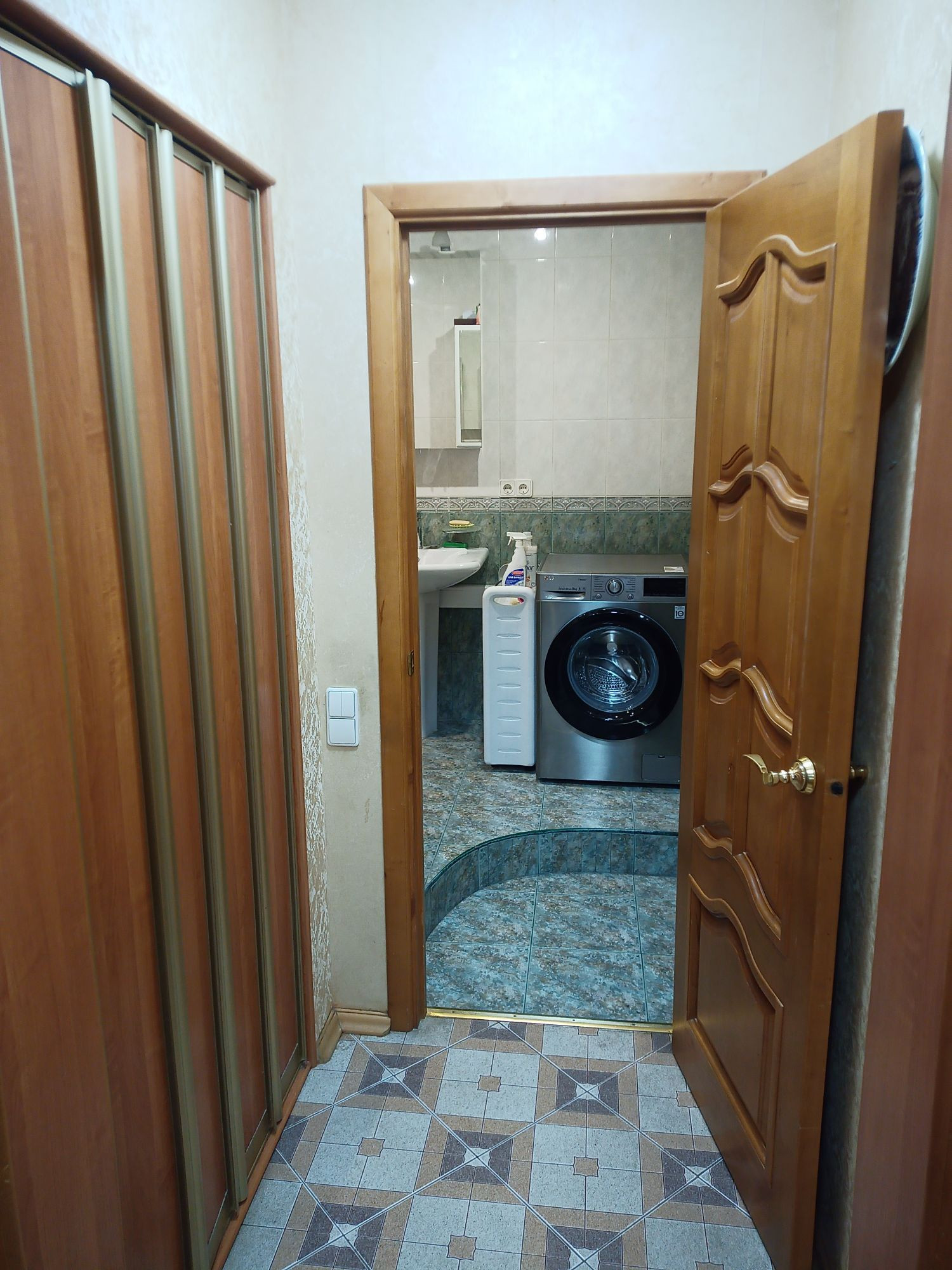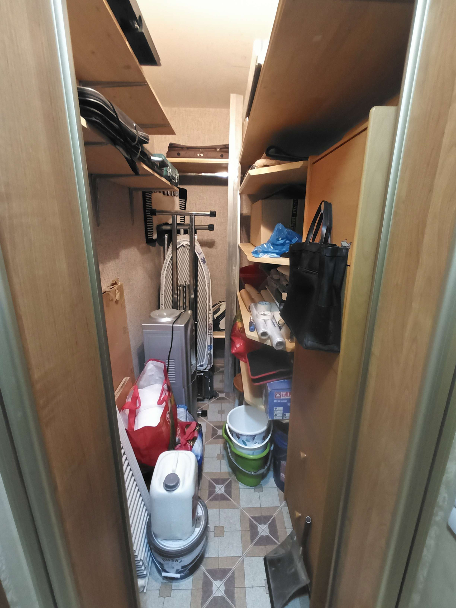 При объединении квартир появилась возможность пользоваться длинным коридором с окном от лифта как прихожей с дополнительными местами  для хранения (шкафы-купе, обувница...).