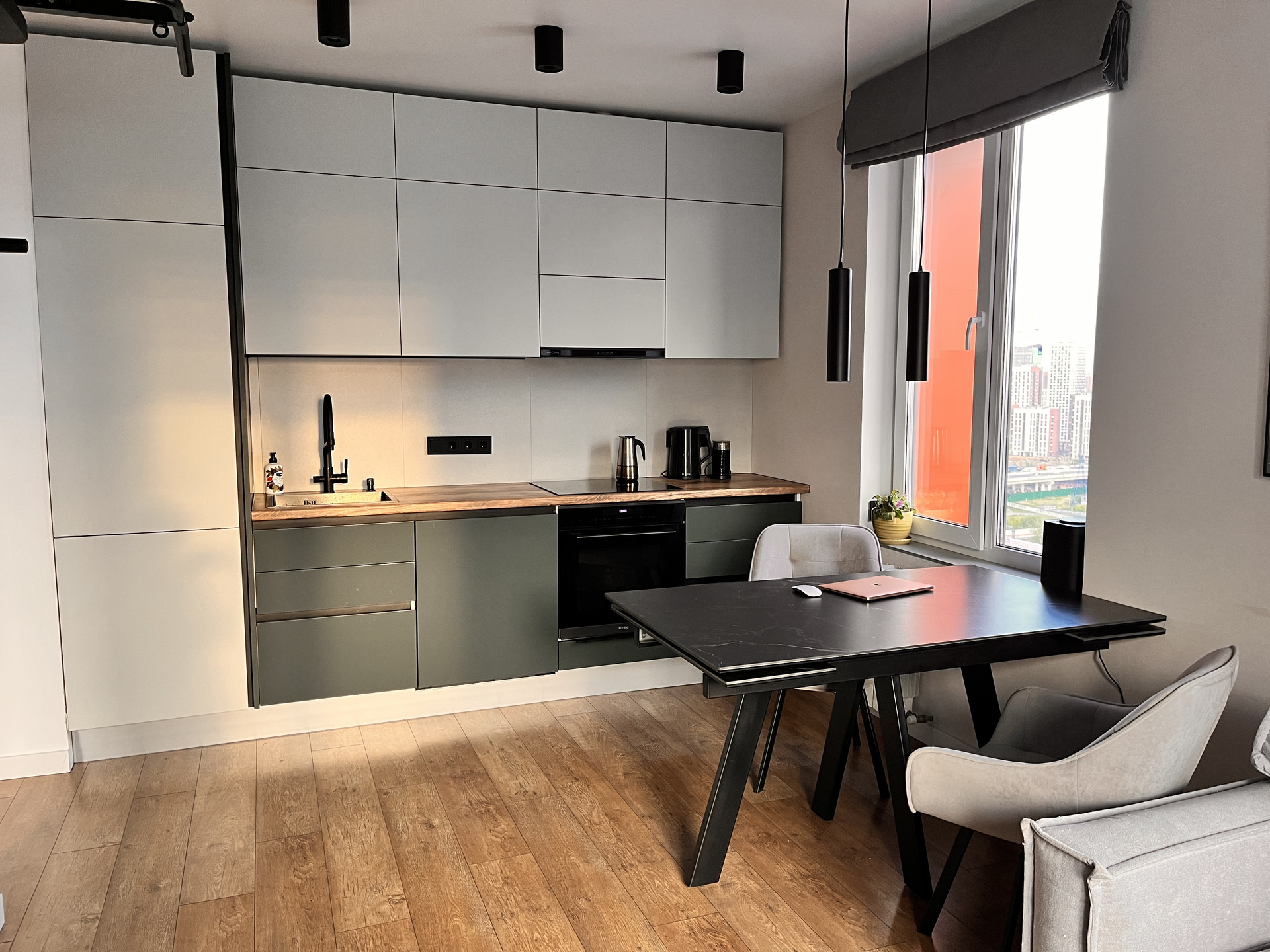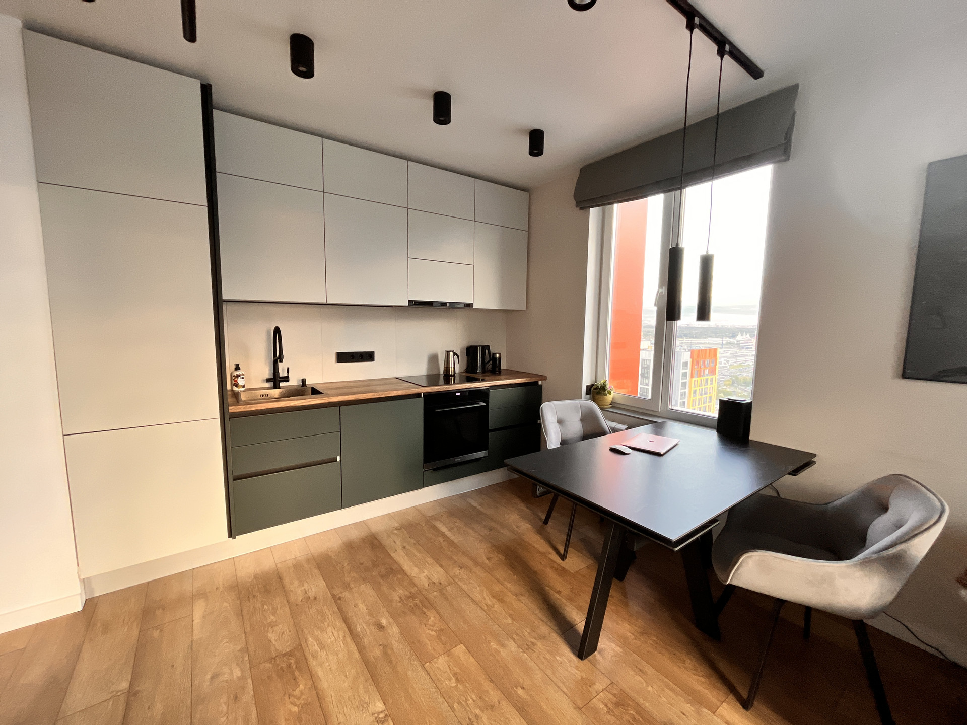 Квартира полностью укомплектована техникой: встроенный холодильник, духовой шкаф совмещенный с микроволновой печью, посудомоечная машина, индукционная плита, вытяжка, фильтр для воды, ТВ, стиральная машина, проточный водонагреватель.