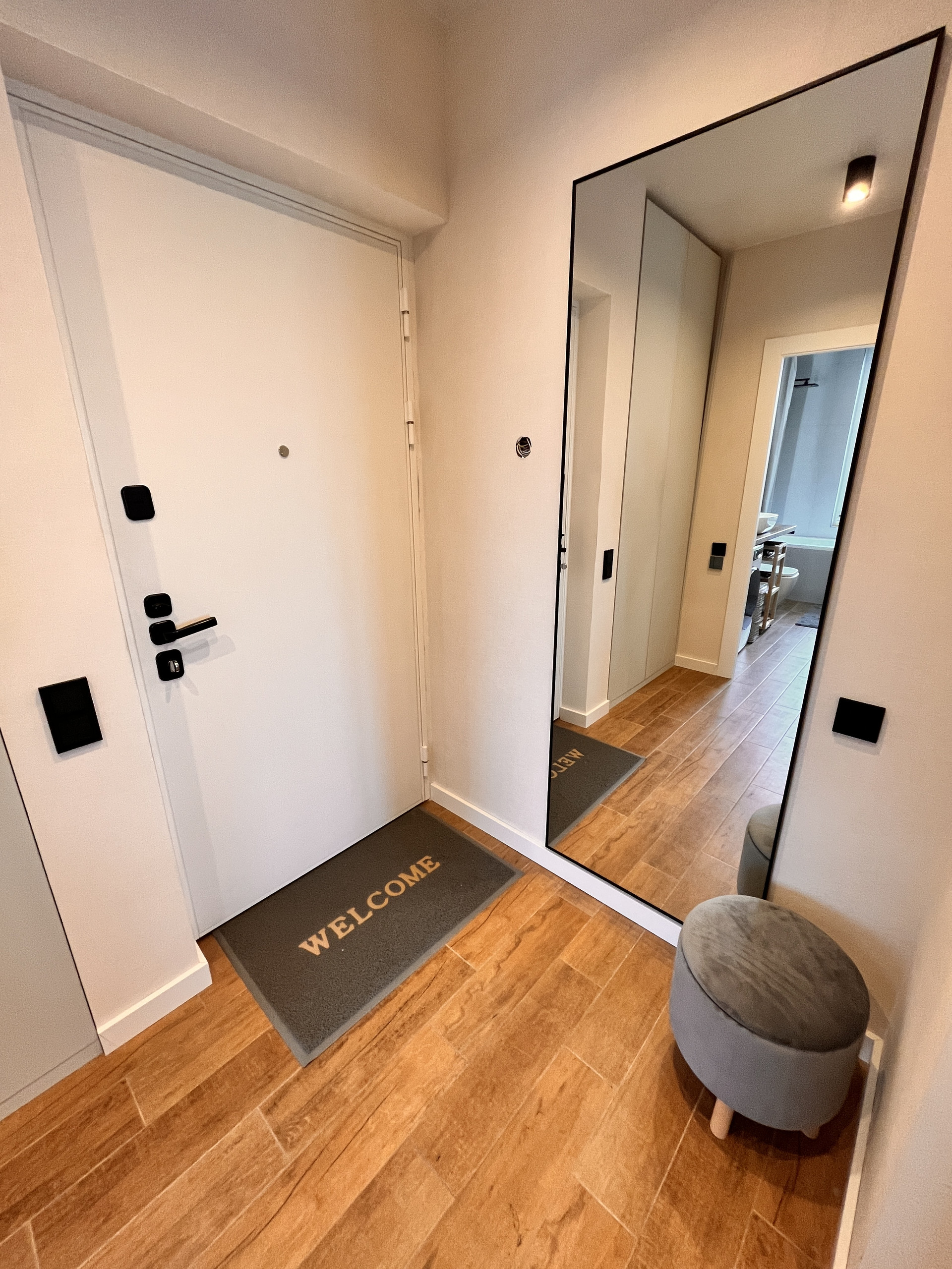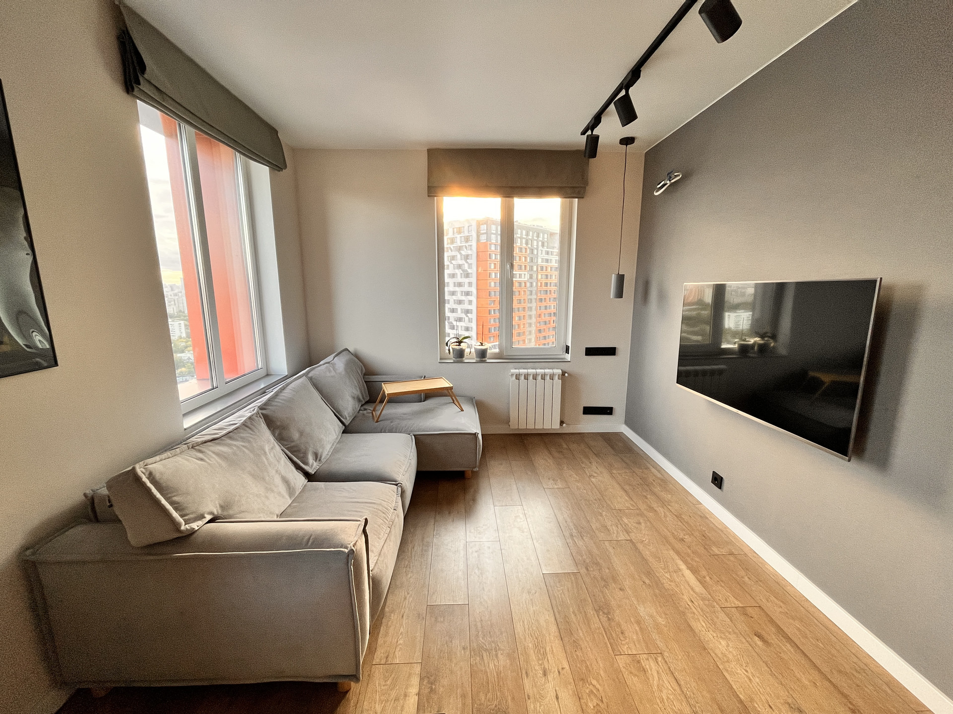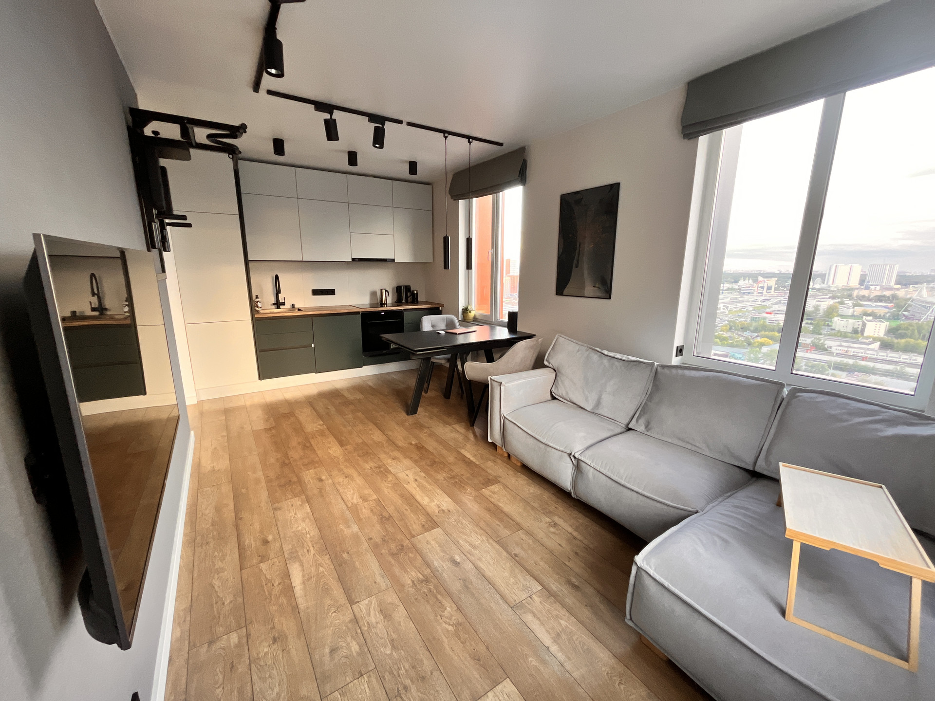 Подоконники из искусственного камня. На полу: плитка в ванной и в прихожей, в остальной квартире ламинат (33 класс). В ванной установлен теплый пол, управление с телефона. Кондиционеры в обеих комнатах будут установлены до конца сентября.