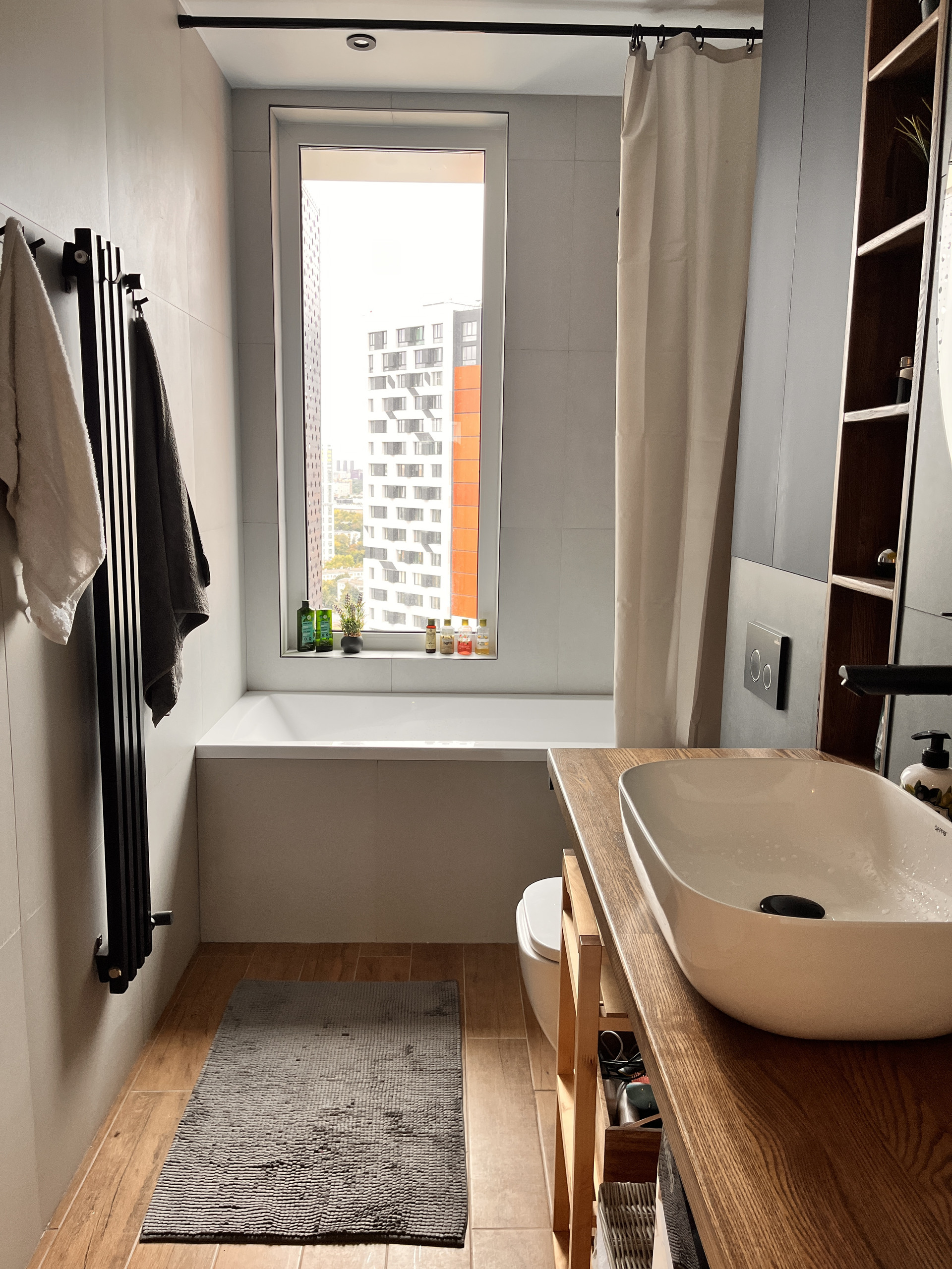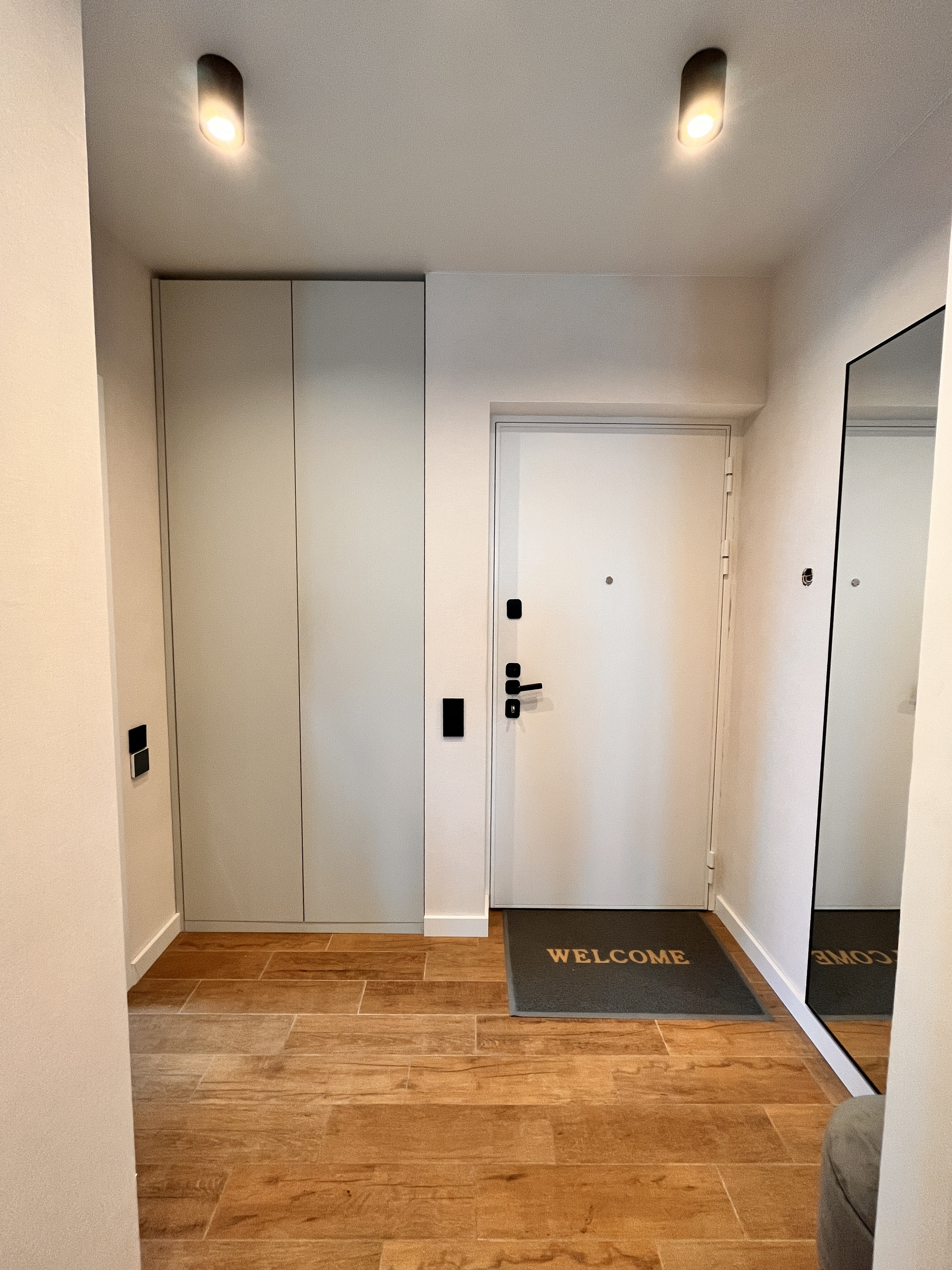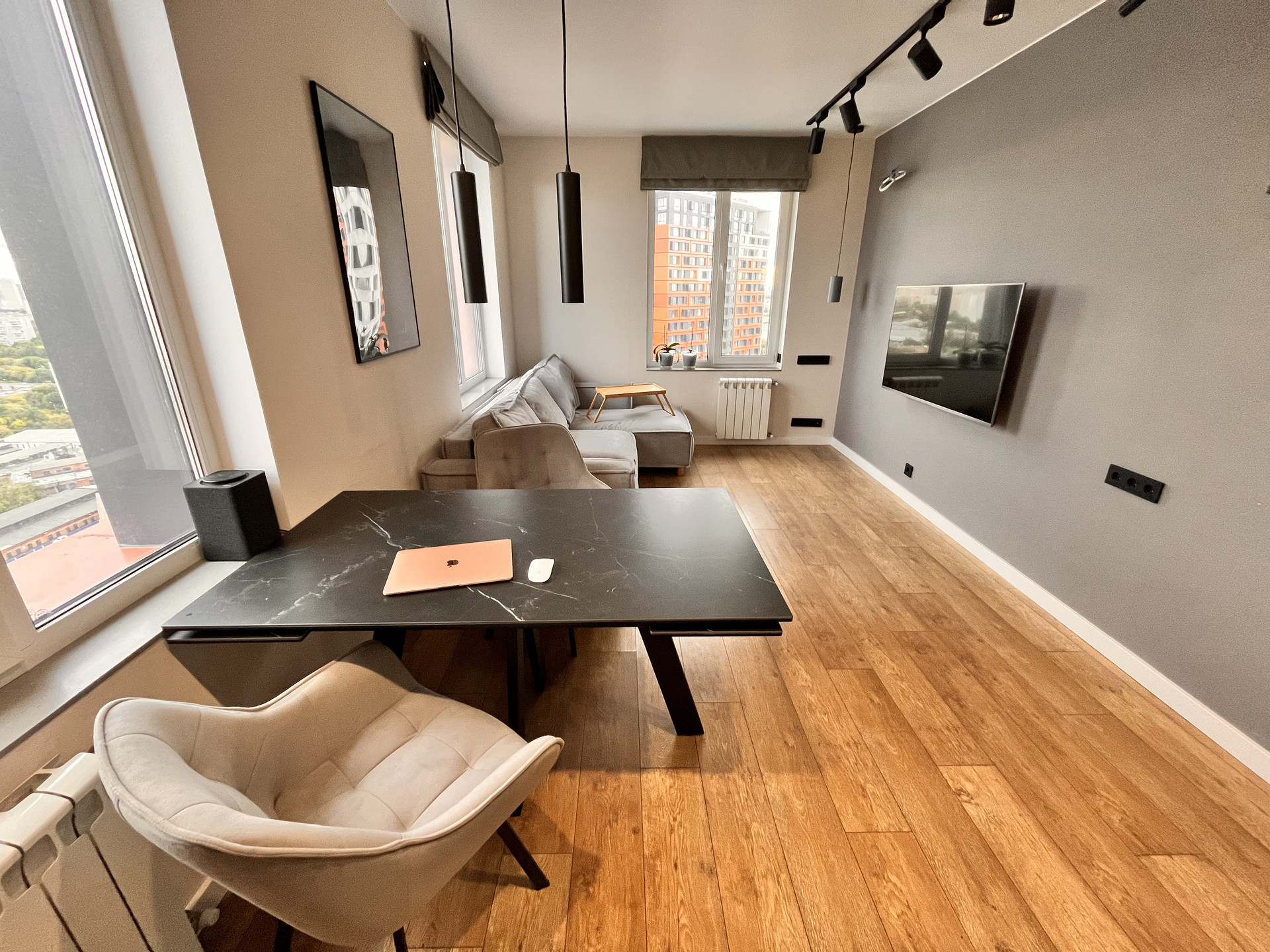 Подоконники из искусственного камня. На полу: плитка в ванной и в прихожей, в остальной квартире ламинат (33 класс). В ванной установлен теплый пол, управление с телефона. Кондиционеры в обеих комнатах будут установлены до конца сентября.