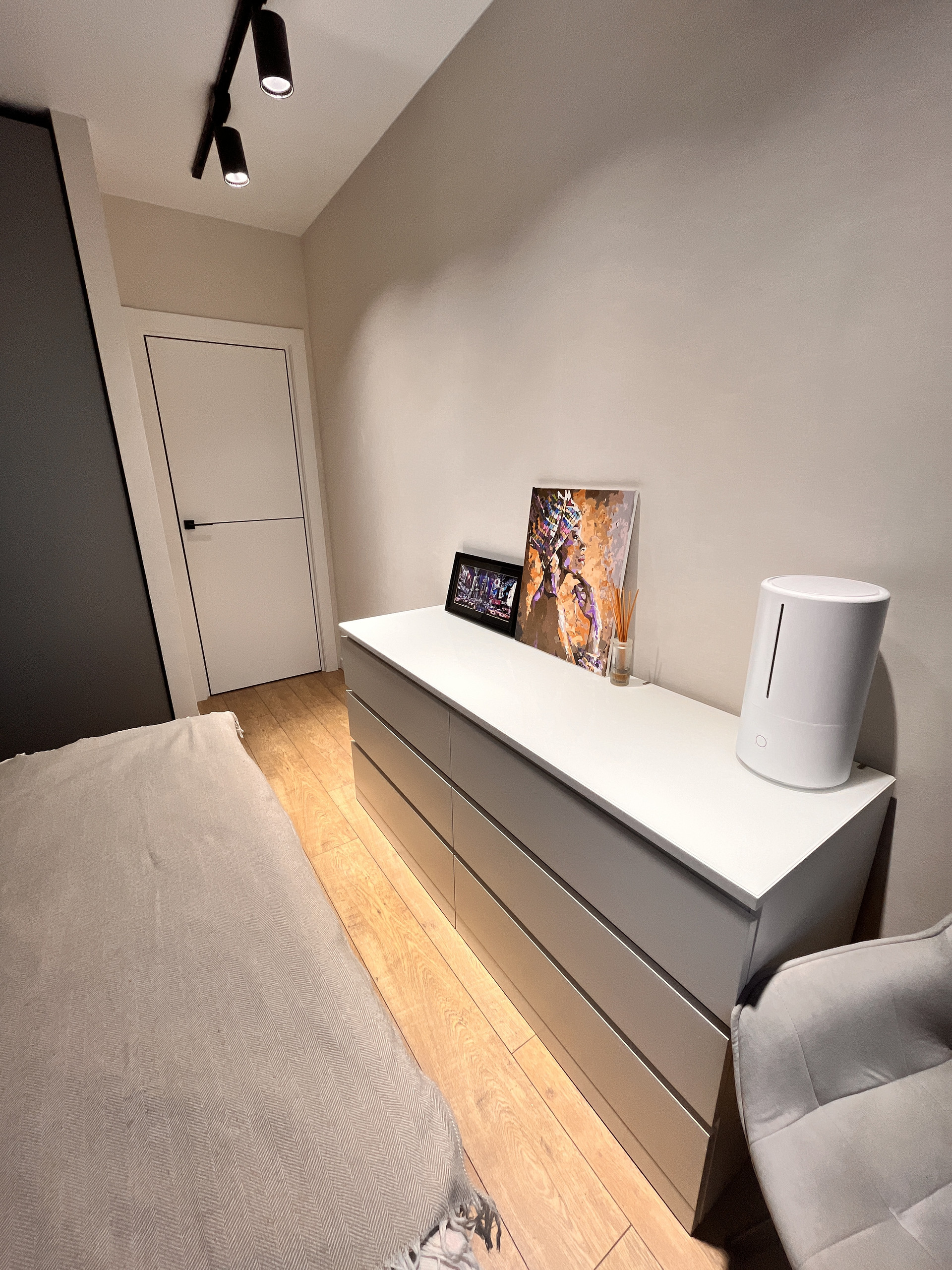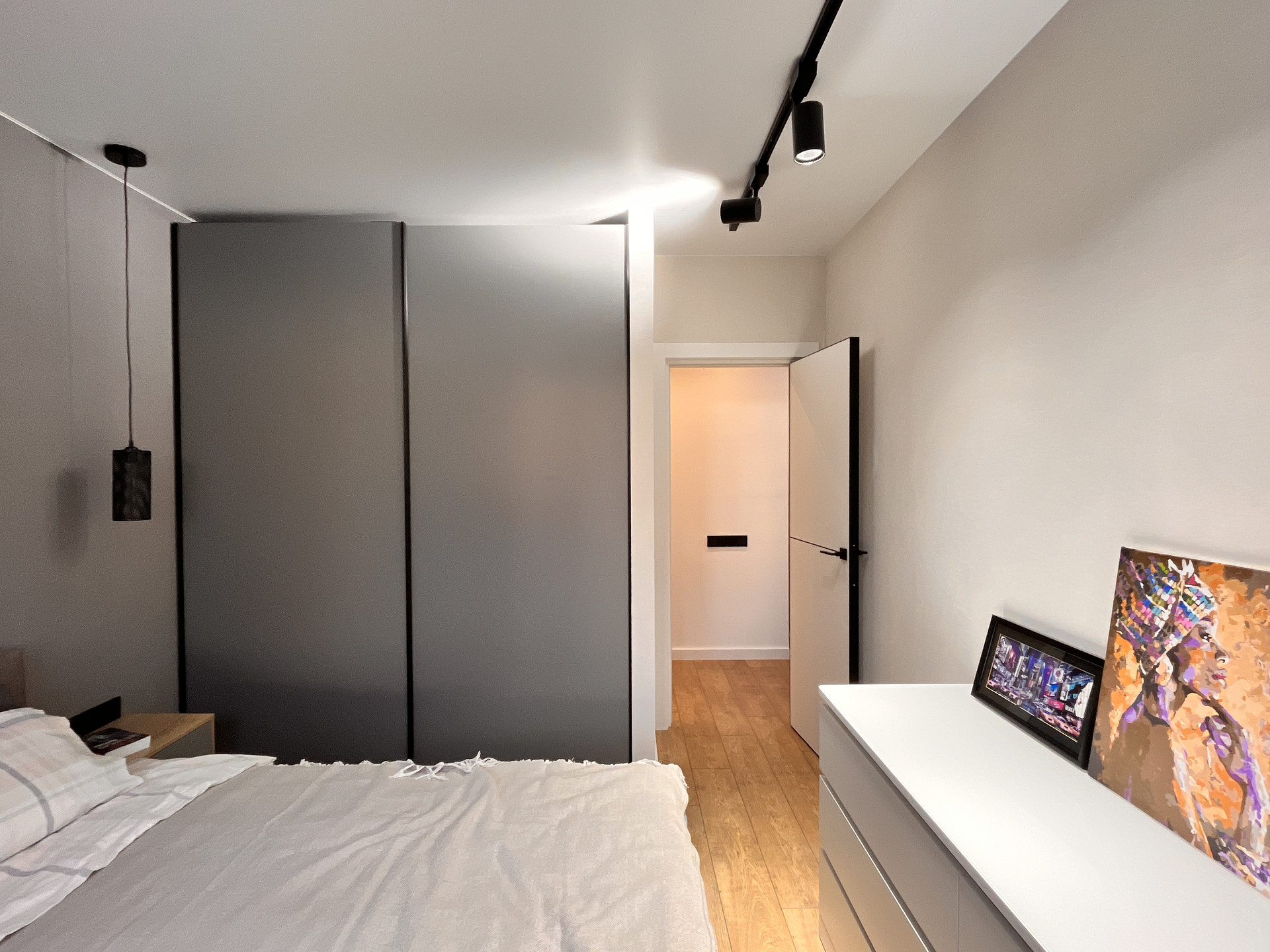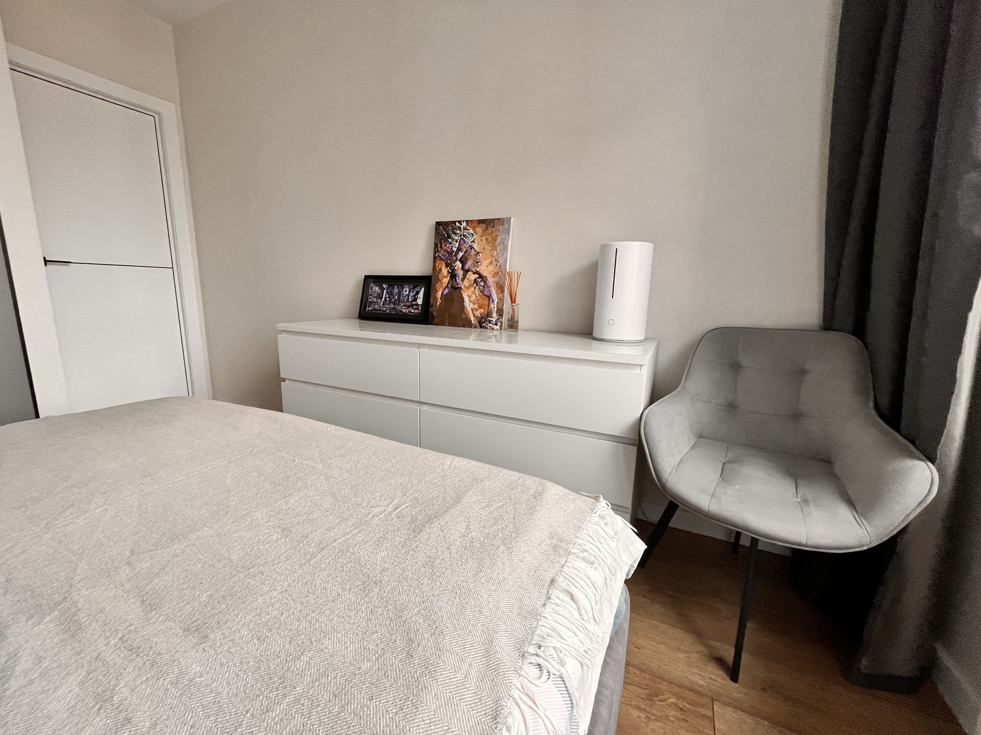 В спальне кровать с подъемным механизмом и 2х-метровый шкаф для одежды.