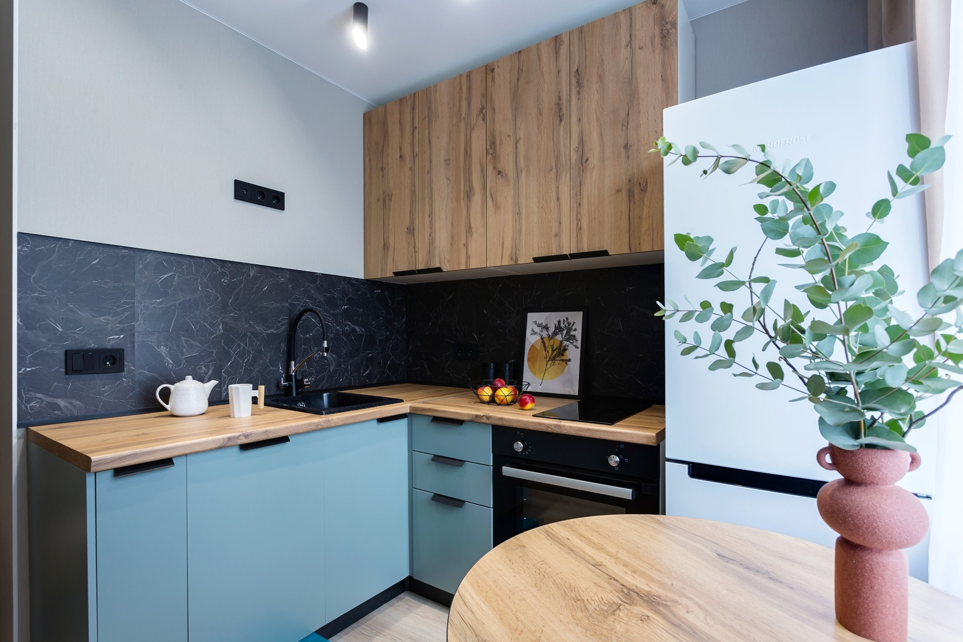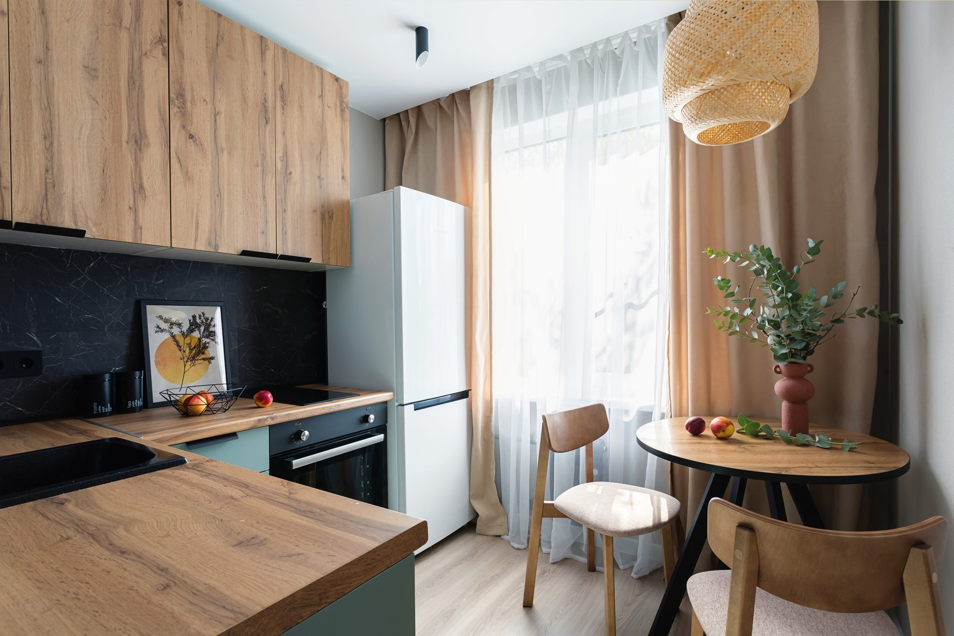 На кухне вся техника новая: холодильник, плита, духовка.