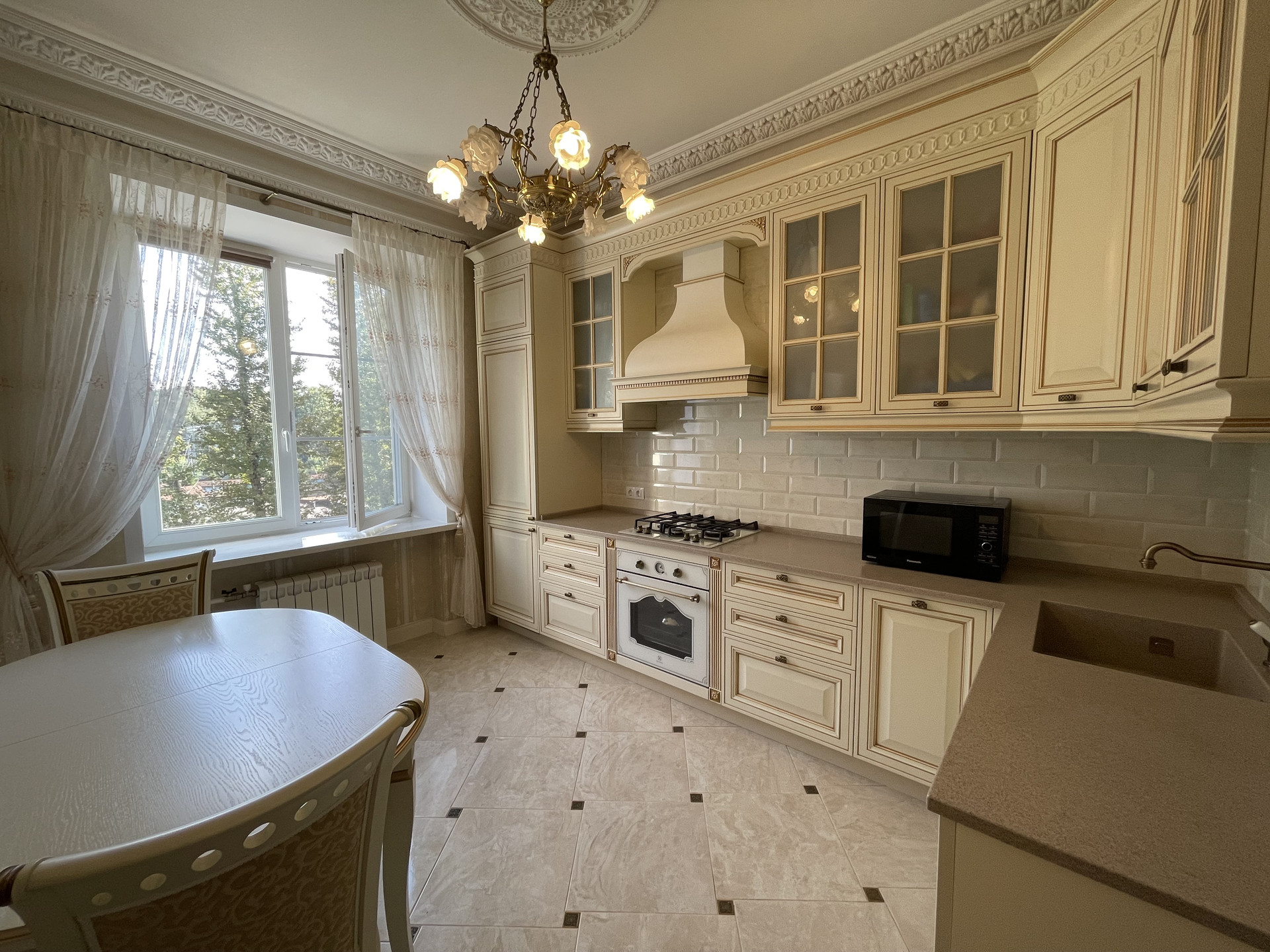 - кухня (с кухонным гарнитуром, столом и стульями, вода фильтруется);