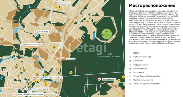 Развитая инфраструктура: В жилом комплексе нижние этажи занимают коммерческие помещения, кафе, магазины и службы быта. Одновременно с уединением природы, где максимально чистый воздух, в ближайшей доступности расположены станции метро «Бульвар Рокоссовского», «ВДНХ», «Бабушкинская», «Свиблово», а также станции МЦК «Ростокино» и «Белокаменная» и ЖД-станции «Ростокино», «Лосиностровская». На автомобиле выезд осуществляется на Ярославское шоссе, которое перетекает в Проспект мира.