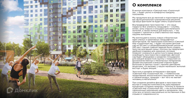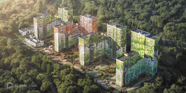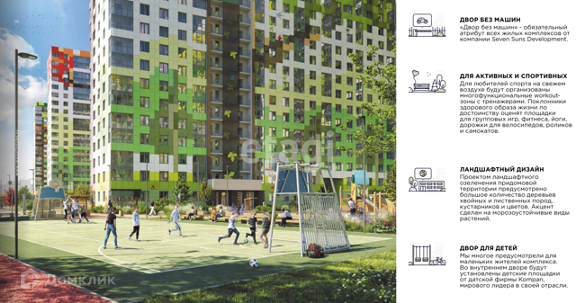 Проект комплекса разработан в концепции «двор без машин» с зонами отдыха для взрослых и детей, современными спортивными площадками. Запланировано строительство детского сада, школы и спортивного клуба.