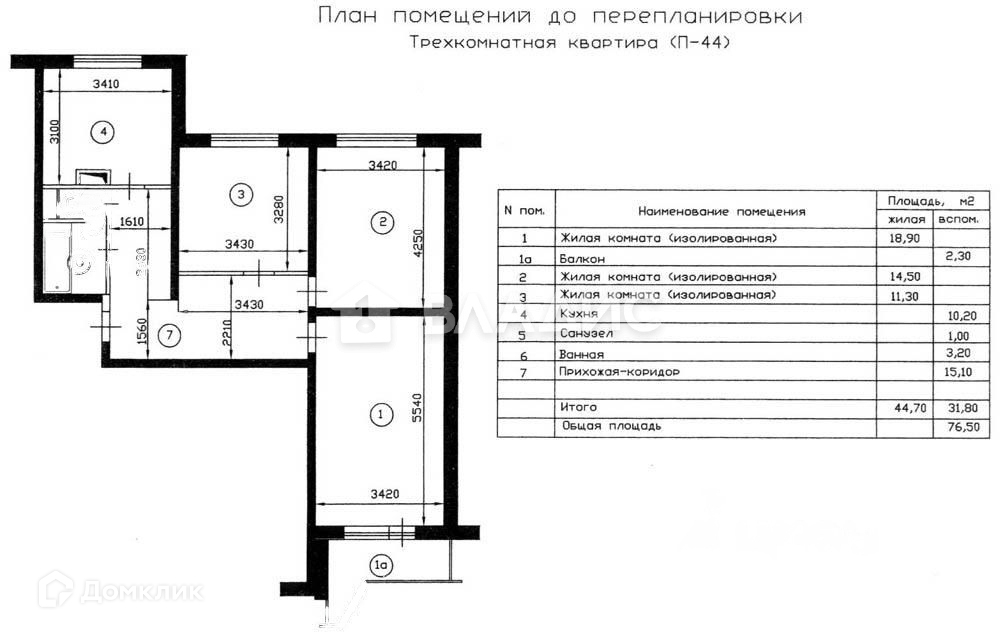 Жилая площадь 44.7 м2