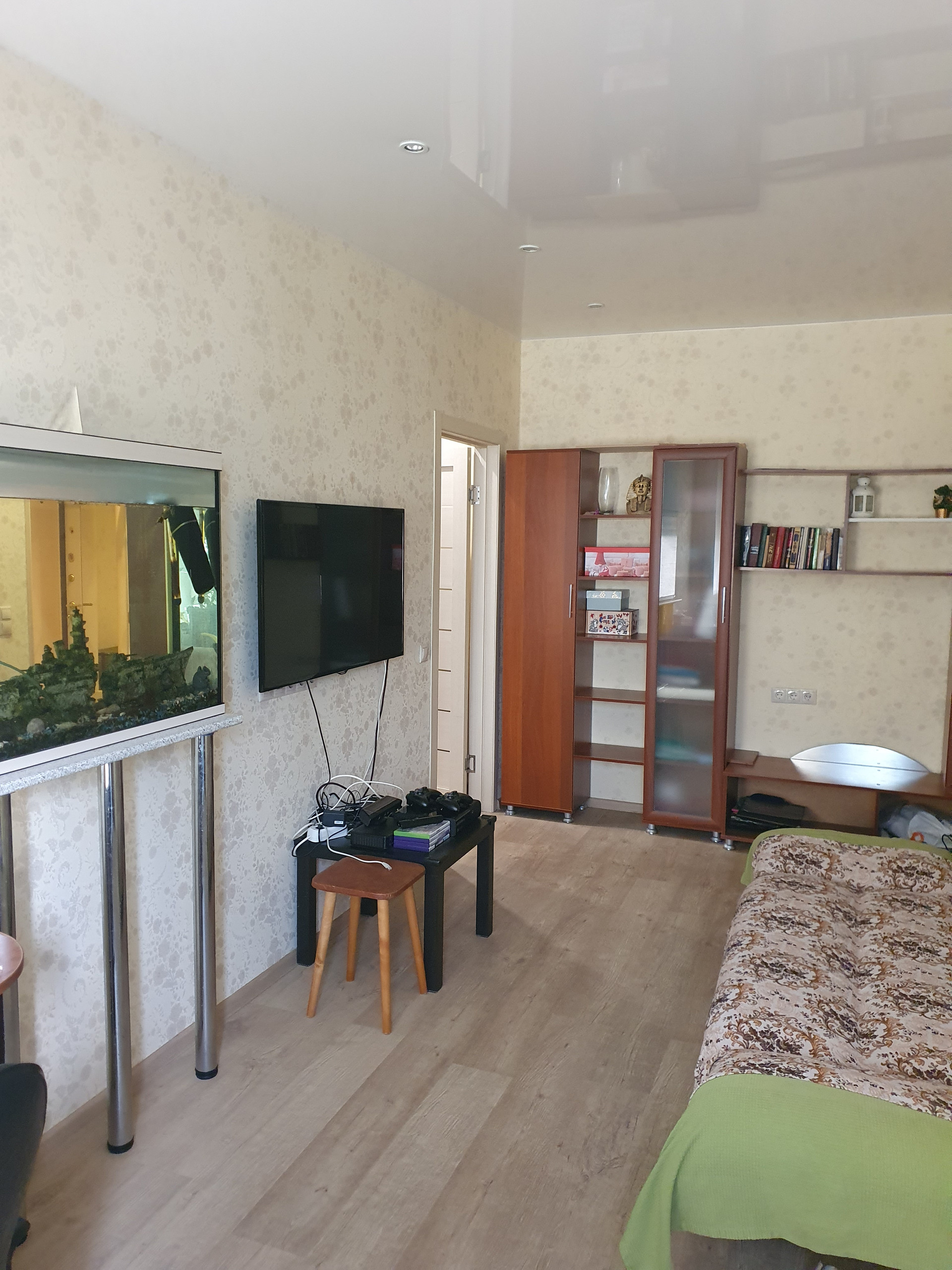 Квартира со свежим евроремонтом с использованием качественных импортных материалов в отличном состоянии, не требующая никаких дополнительных вложений. Выровнeны cтeны и полы, новая проводка и розетки, новые трубы, установлена система очистки воды. В стене сделан аквариум. Вcтроенная кухня c вытяжкой и посудомоечной машиной.