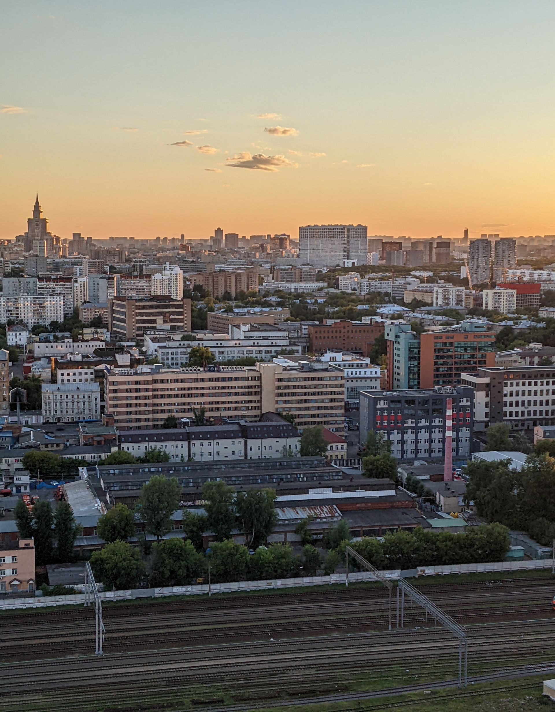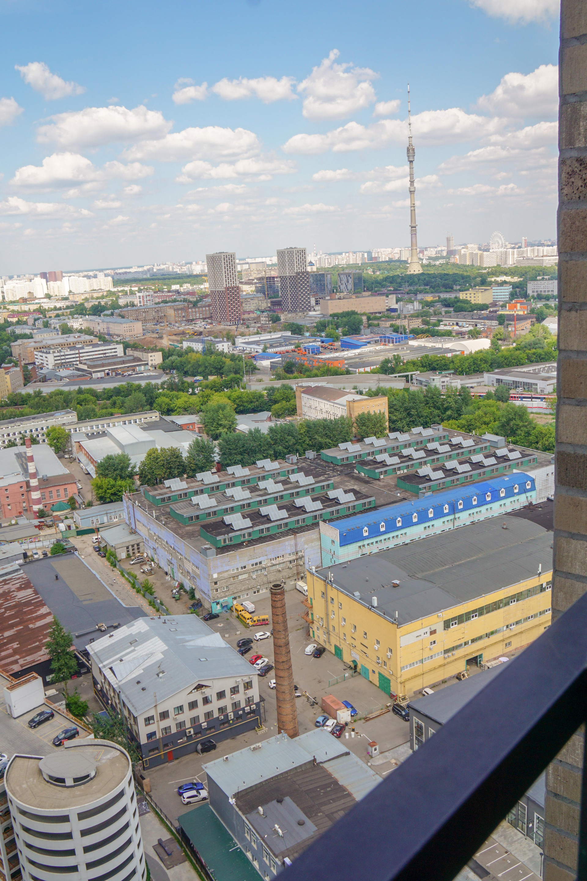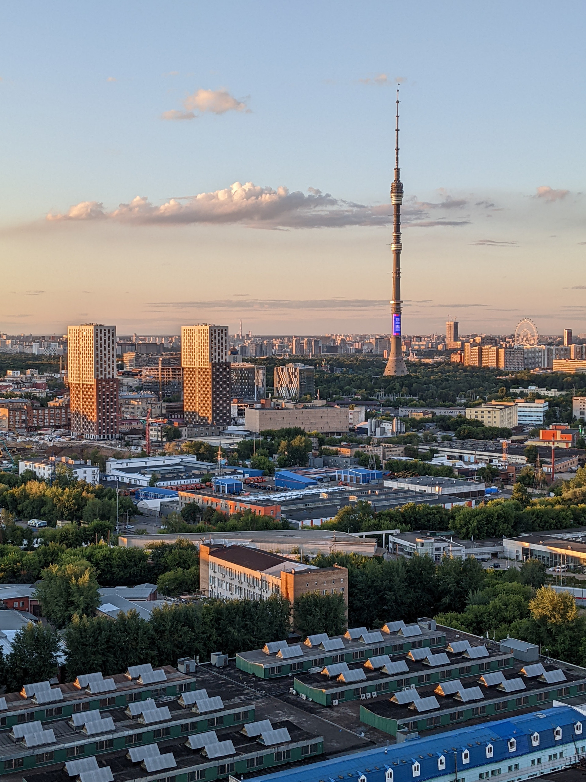 В студии панорамное окно с красивым видом на Останкинскую башню, на закат и на соседний дом.