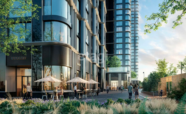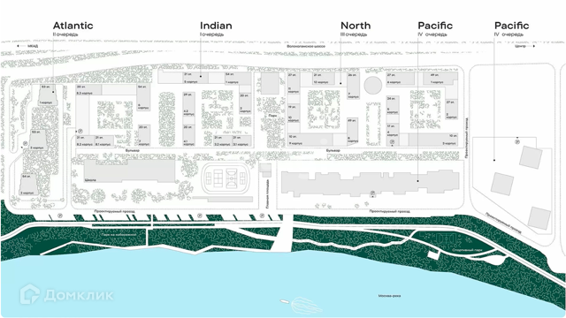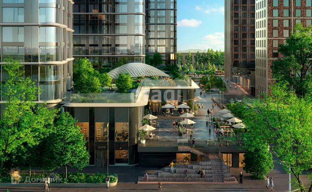 Территория комплекса благоустроена: собственная набережная, прогулочная зона, зеленый двор. На территории комплекса предусмотрены 3 детских сада, школа, банк, минимаркет, спортивный центр, салон красоты, кафе, аптека, магазины. Роскошный двор-сад с детскими и спортивными площадками, тихими зонами, прогулочными аллеями, местами отдыха.
