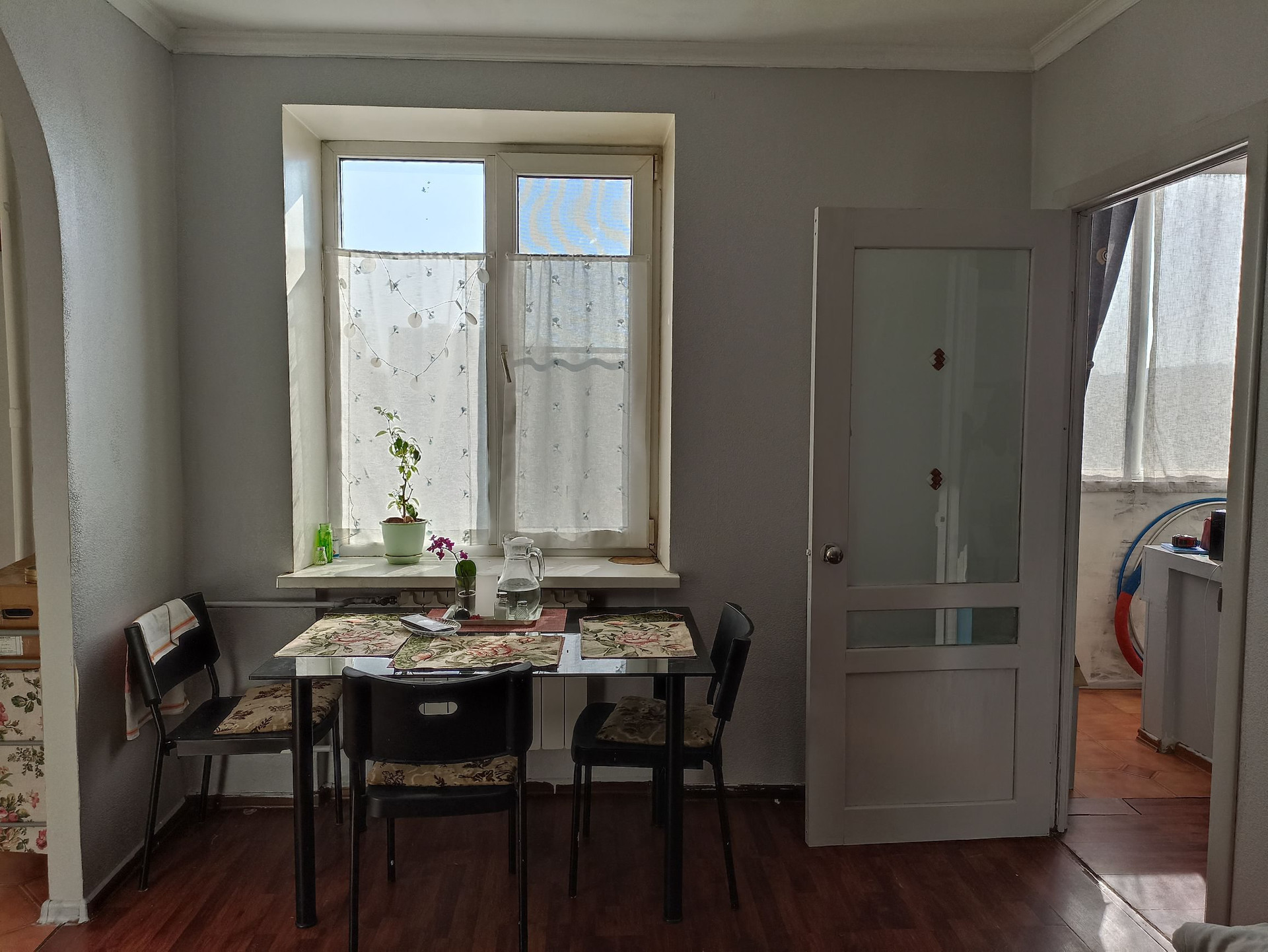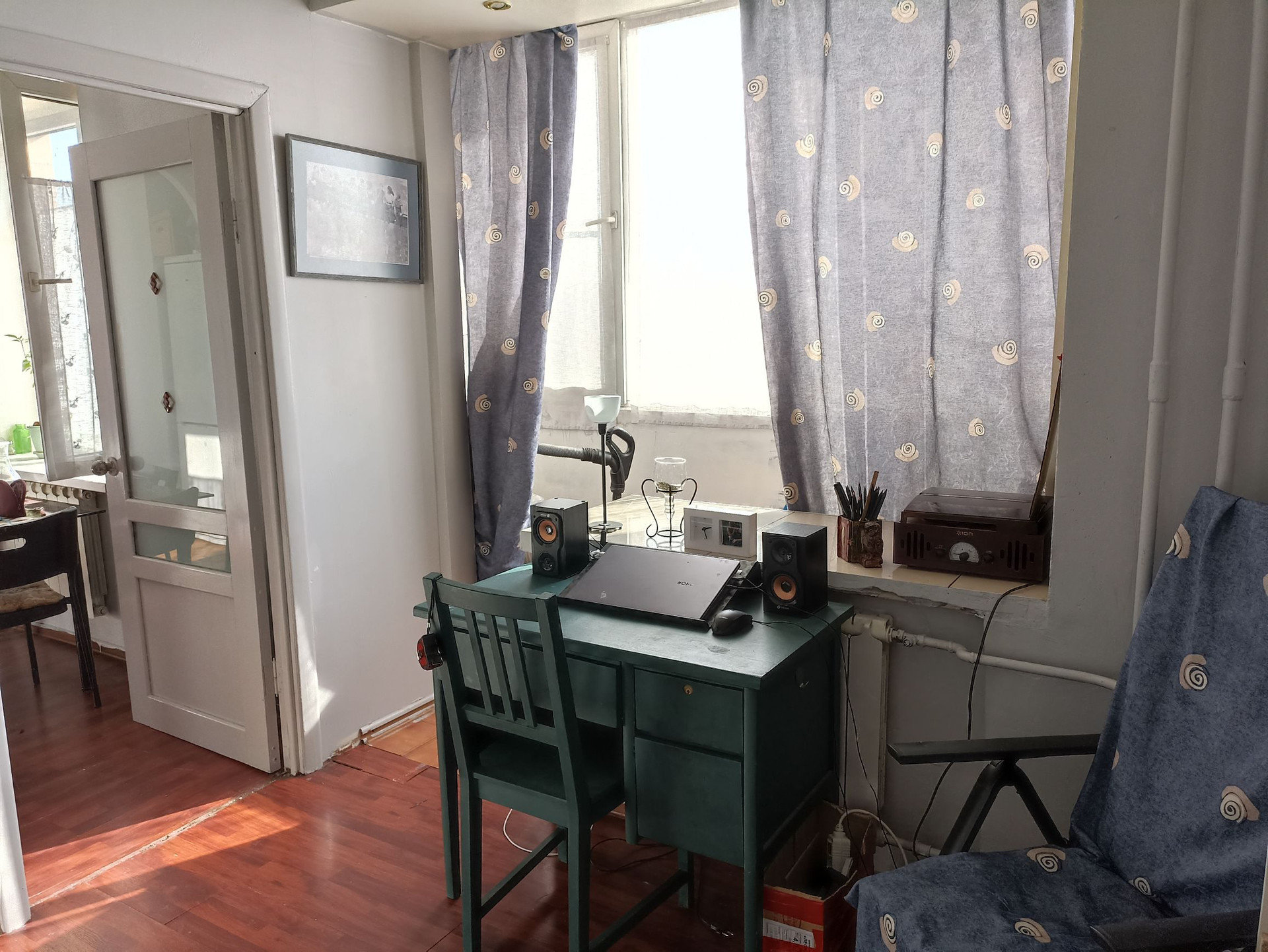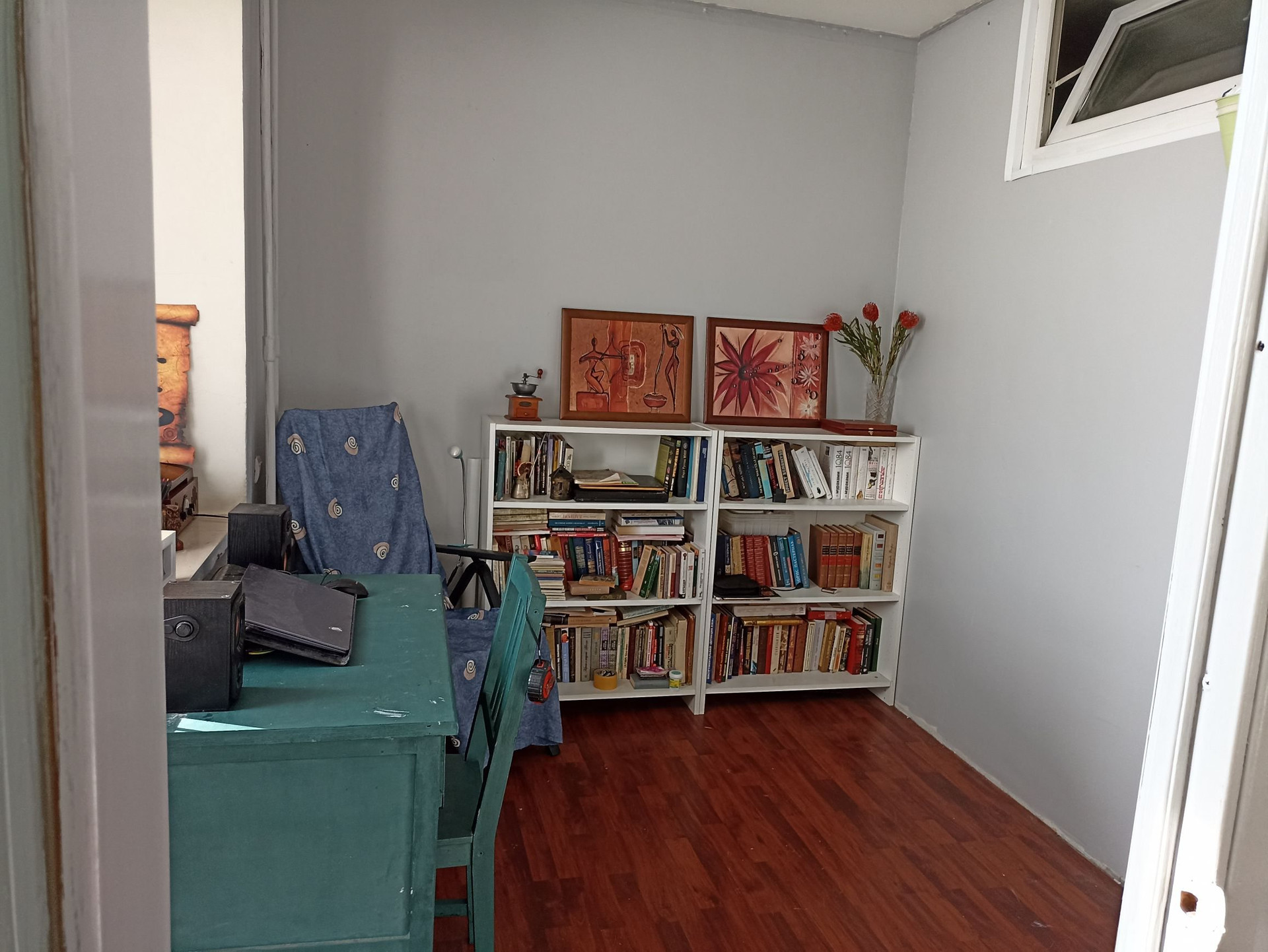 В результате перепланировки образовались две изолированные комнаты: тёмная спальня с верхним окном для проветривания и кабинет (может служить ещё одной спальней). Просторная гостиная совмещена с полноценной и функциональной кухней с нишей под холодильник.
