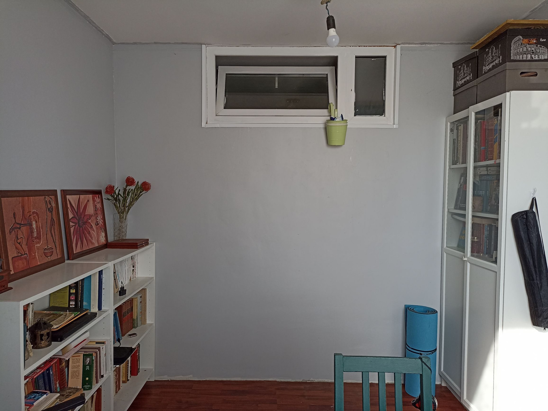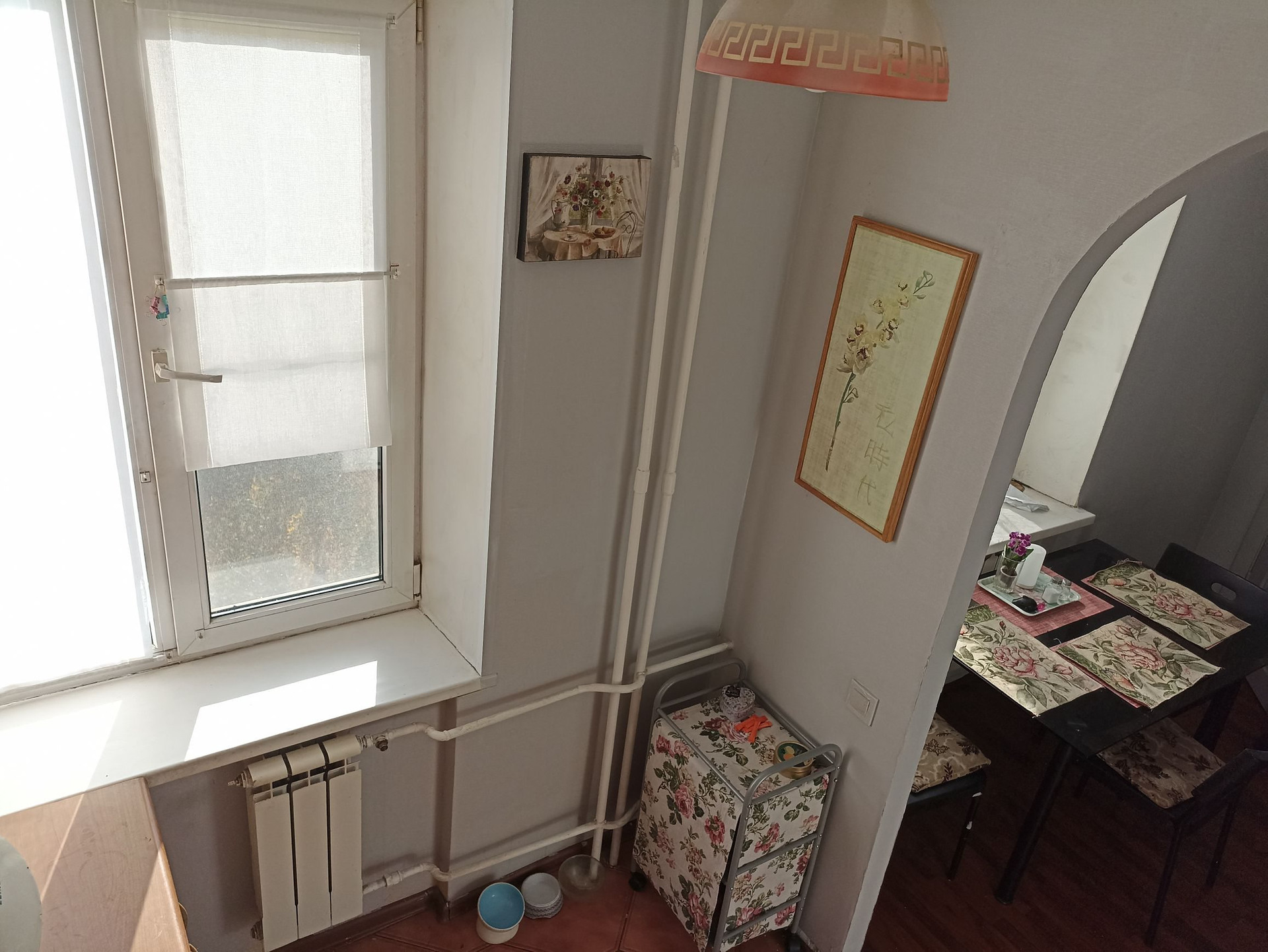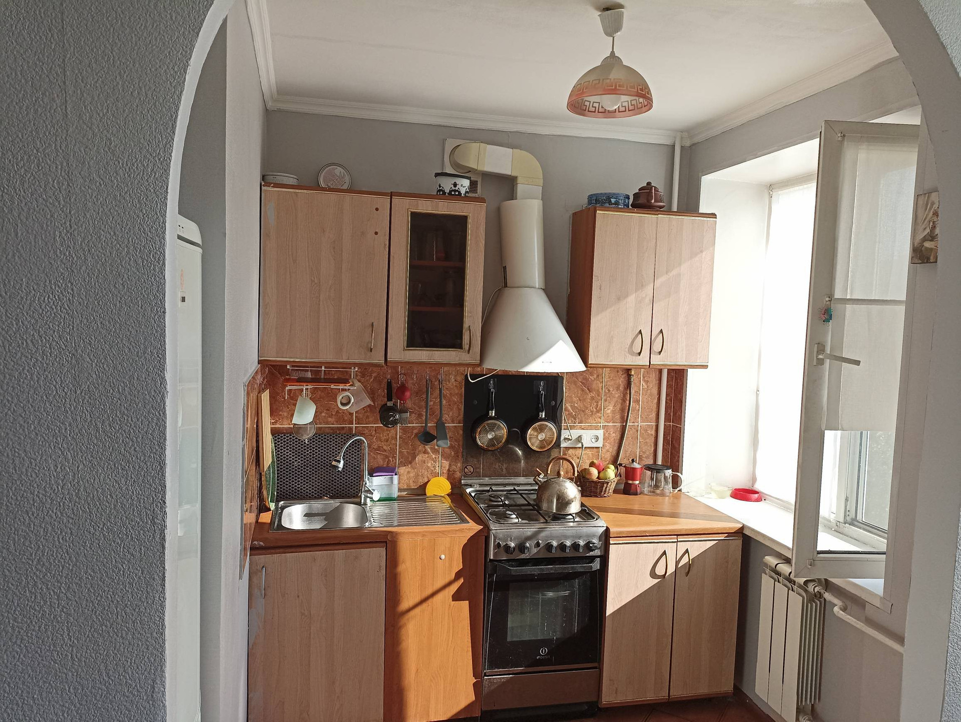 В результате перепланировки образовались две изолированные комнаты: тёмная спальня с верхним окном для проветривания и кабинет (может служить ещё одной спальней). Просторная гостиная совмещена с полноценной и функциональной кухней с нишей под холодильник.